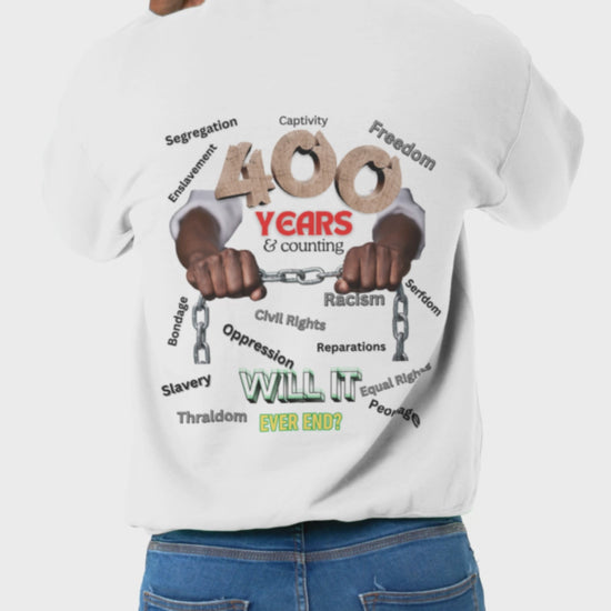 This powerful and thought-provoking design highlights the enduring struggles, and systemic challenges faced over 400 years, including enslavement, captivity, racism, and the ongoing fight for civil rights and equality. The striking visual of a pair of hands breaking chains symbolizes the fight for freedom, resilience, and hope, while surrounding words like "Freedom," "Racism," "Equal Rights," and "Serfdom" remind us of historical and present injustices.