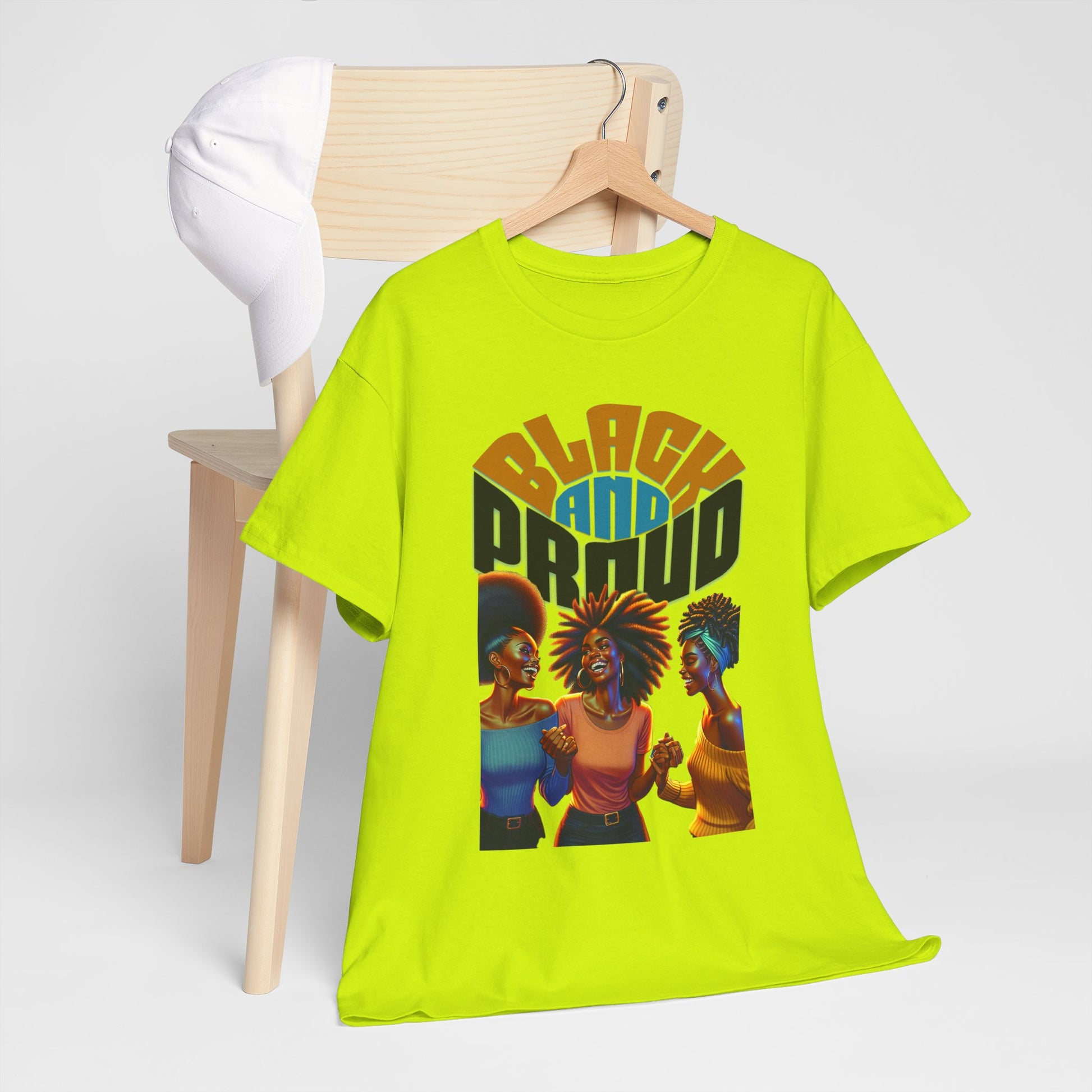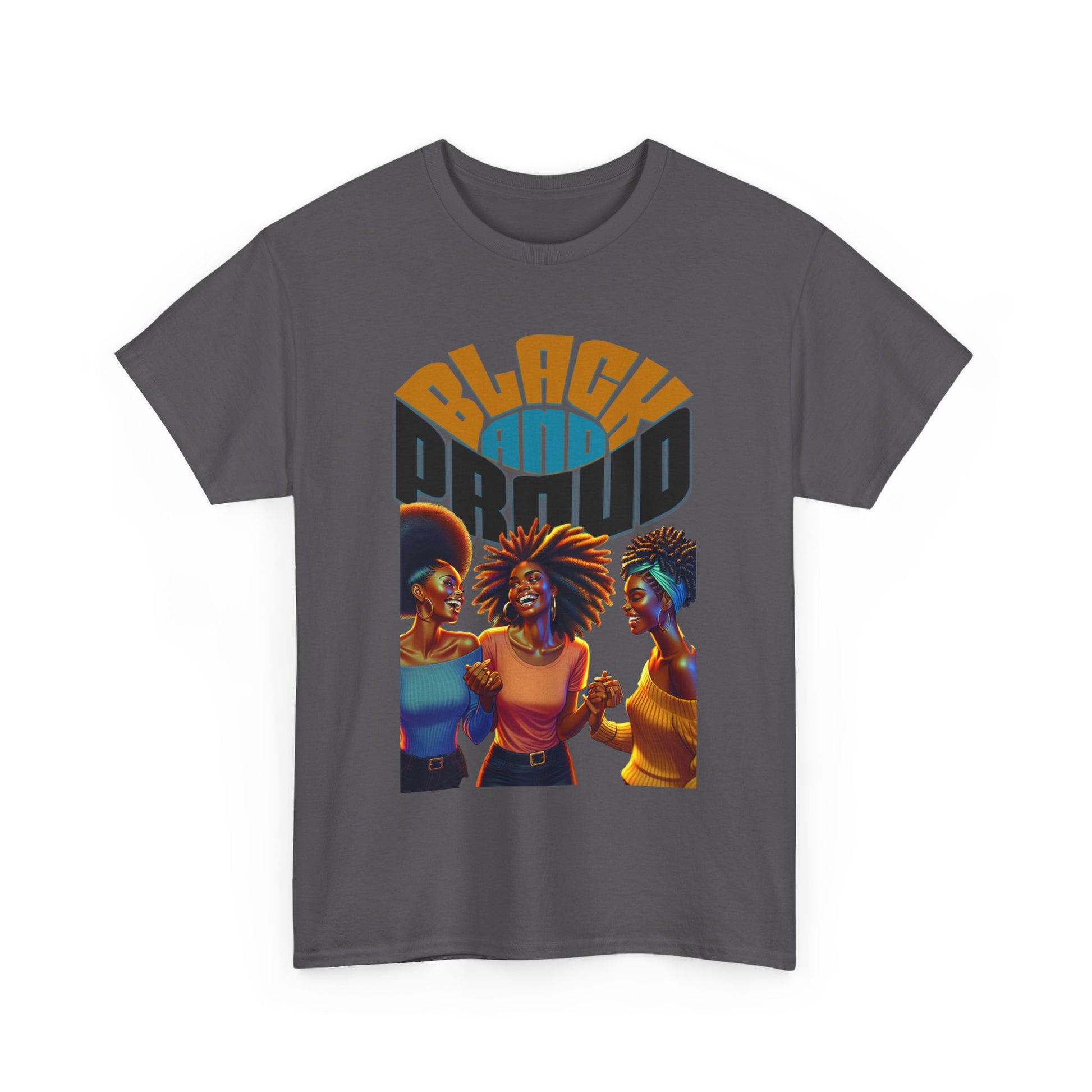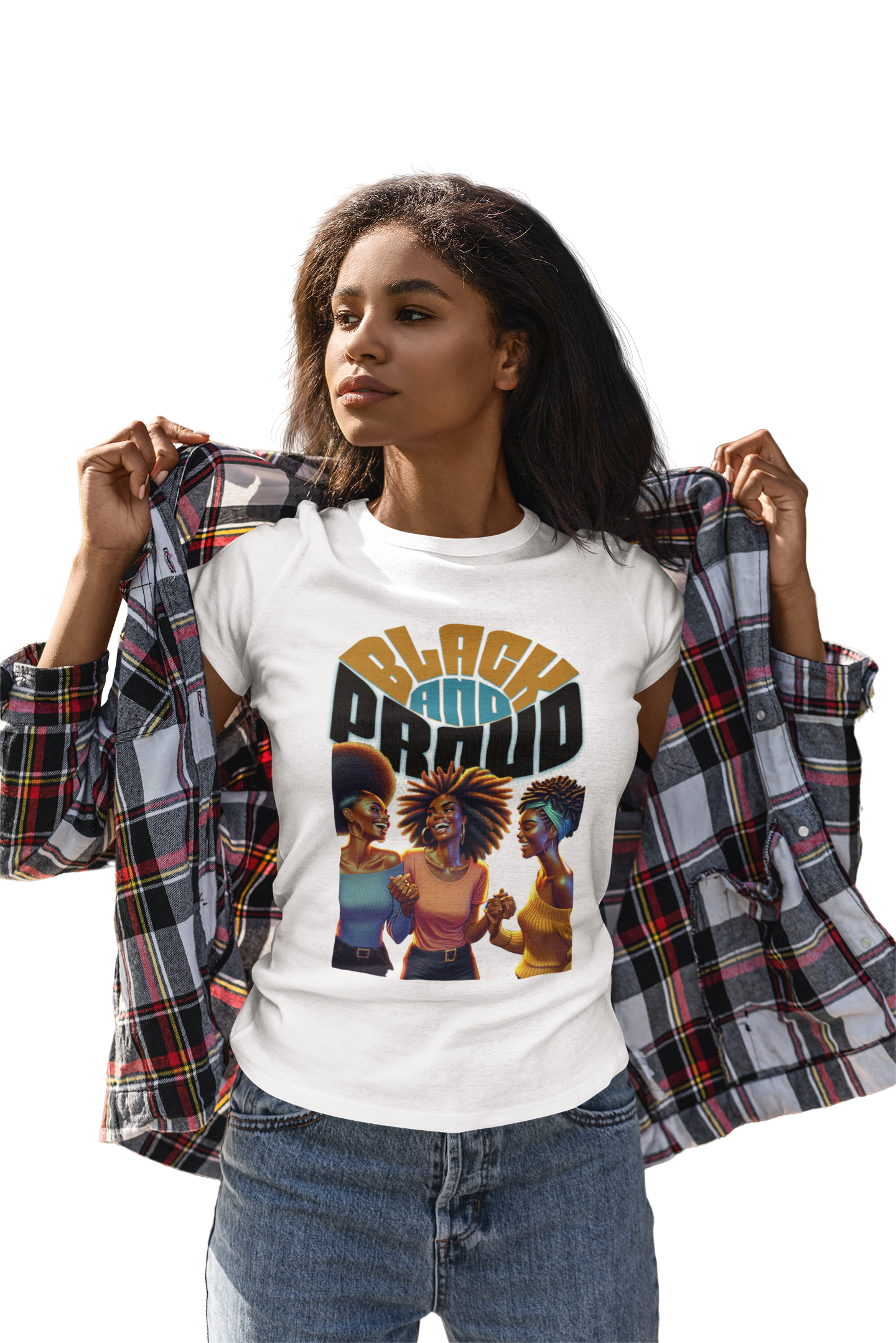 Celebrate the beauty and pride of Black sisterhood with this vibrant and empowering design. Featuring three stunning Black women with natural hairstyles, this image captures the essence of unity, strength, and joy. The phrase "Black and Proud" boldly proclaims their identity and celebrates their heritage. Perfect shirt for black history month and Juneteenth.