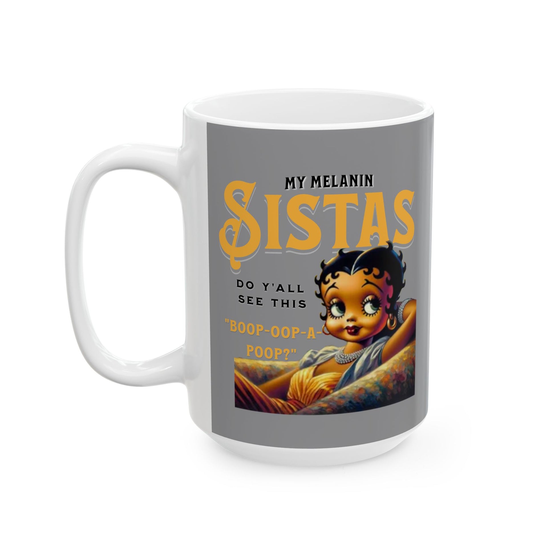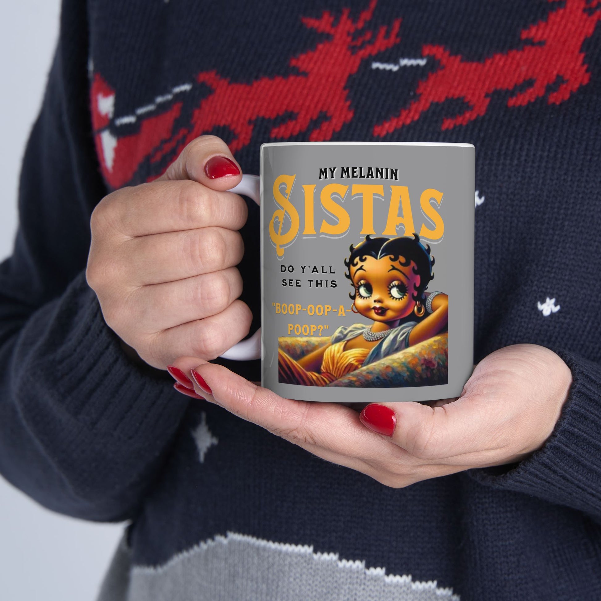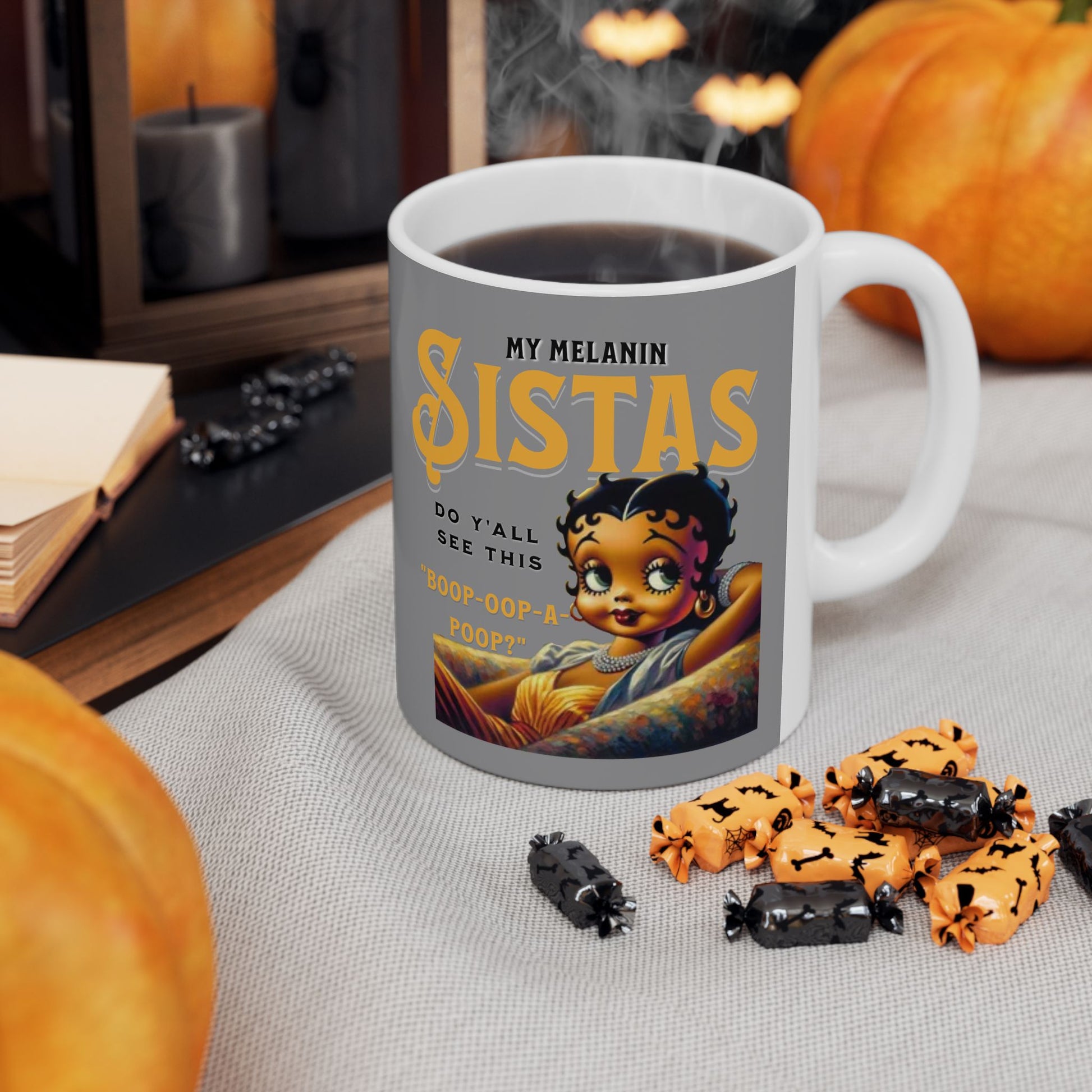 This design playfully merges iconic cartoon nostalgia with a celebration of Black sisterhood. Featuring a reimagined Betty Boop with rich, melanin-infused skin, the image exudes a confident and sassy vibe. The text "MY MELANIN SISTAS DO Y'ALL SEE THIS 'BOOP-OOP-A-POOP?'" adds a modern twist to Betty's classic catchphrase, creating a humorous and relatable message for Black women.