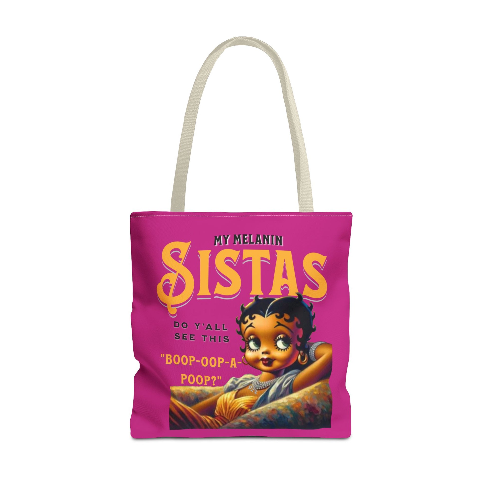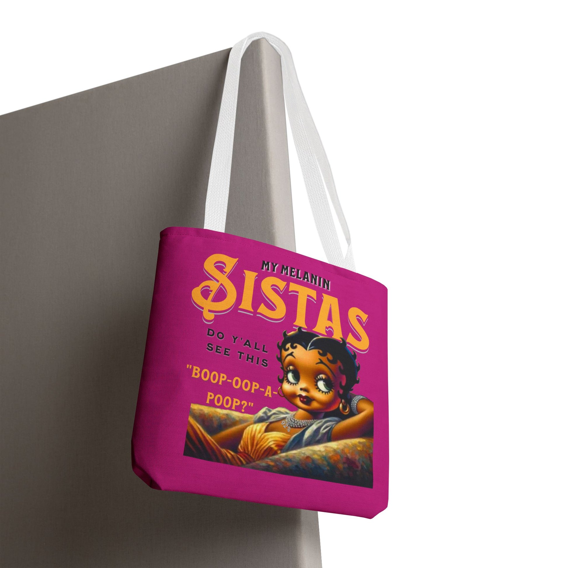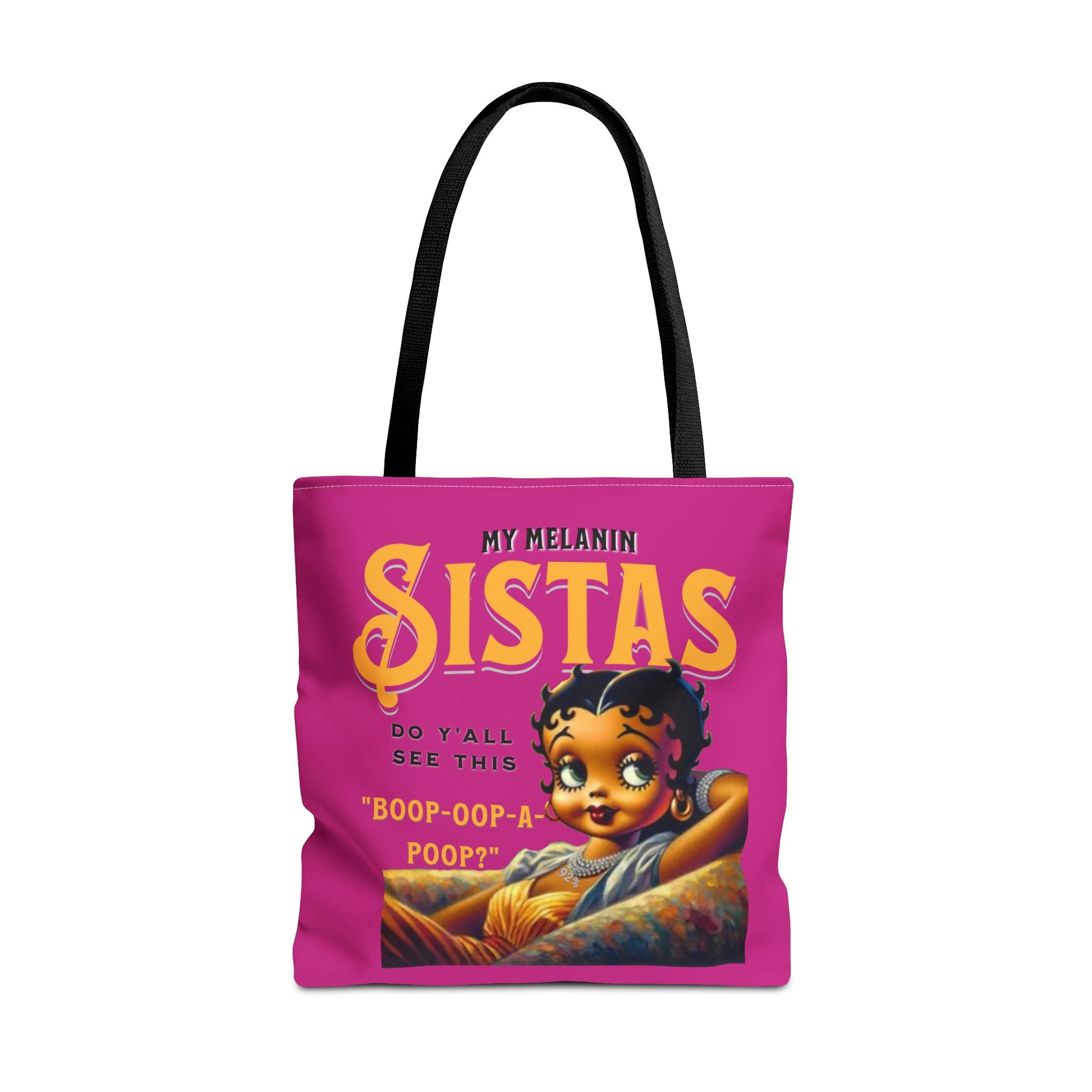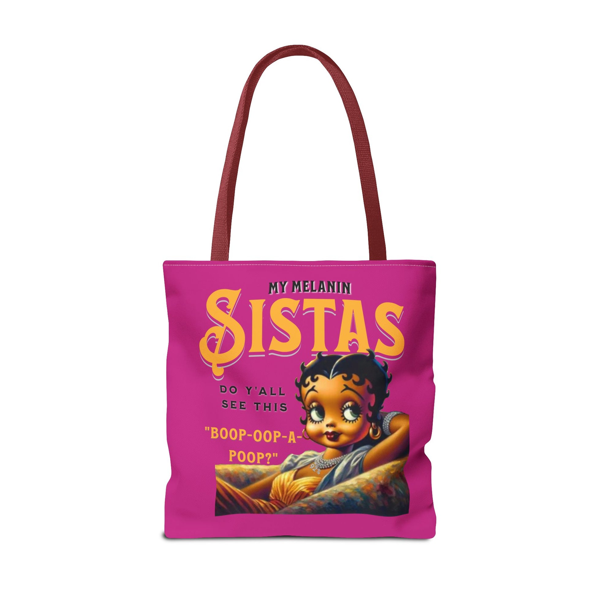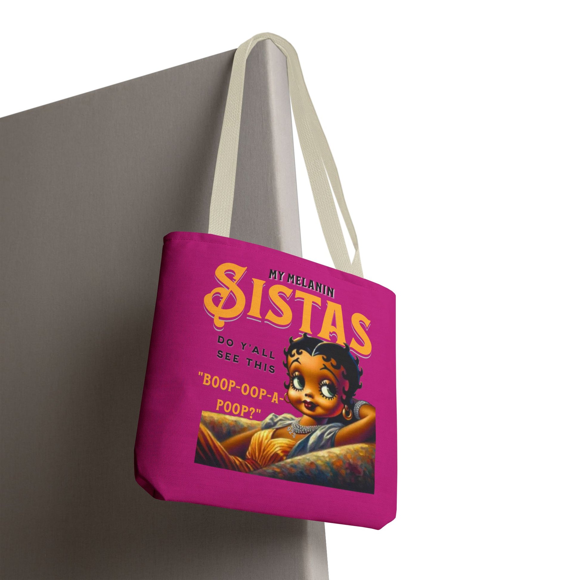 This design playfully merges iconic cartoon nostalgia with a celebration of Black sisterhood. Featuring a reimagined Betty Boop with rich, melanin-infused skin, the image exudes a confident and sassy vibe. The text "MY MELANIN SISTAS DO Y'ALL SEE THIS 'BOOP-OOP-A-POOP?'" adds a modern twist to Betty's classic catchphrase, creating a humorous and relatable message for Black women. The vintage-inspired aesthetic, combined with the contemporary phrase, creates a unique and eye-catching design. This piece is perfect for those who appreciate a blend of retro charm and modern cultural references, celebrating Black beauty and sisterhood with a touch of humor.