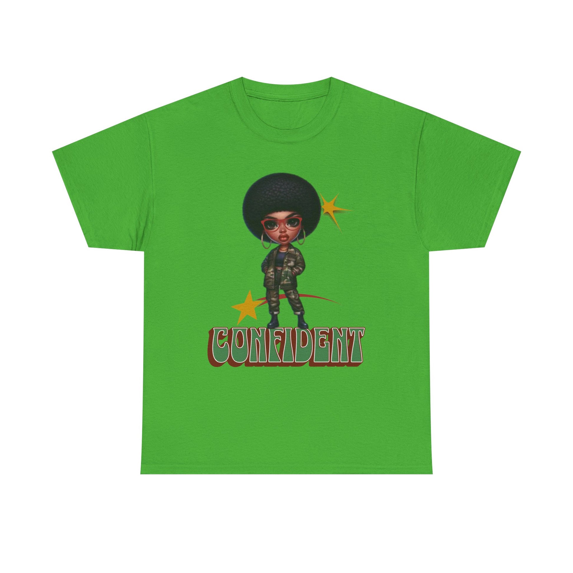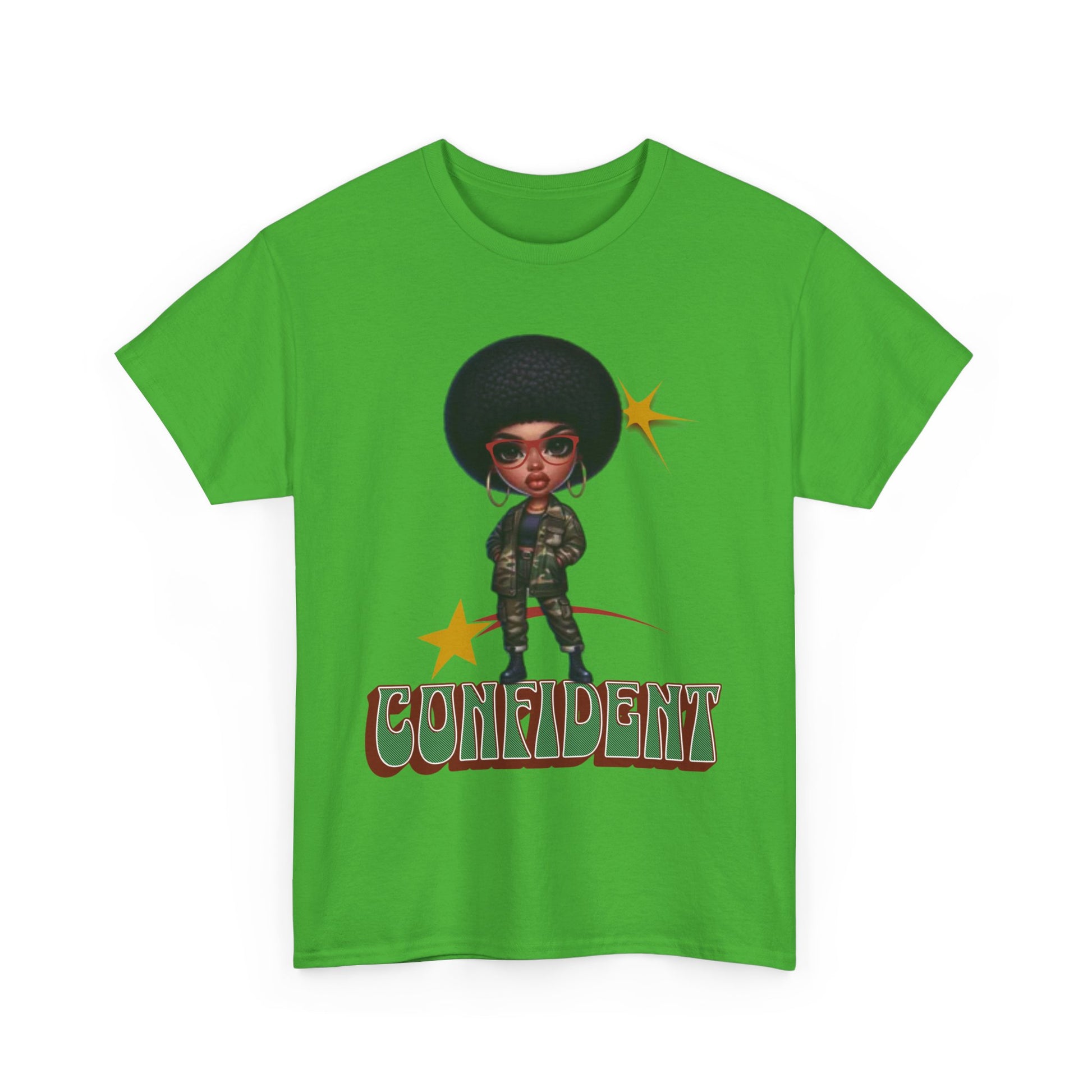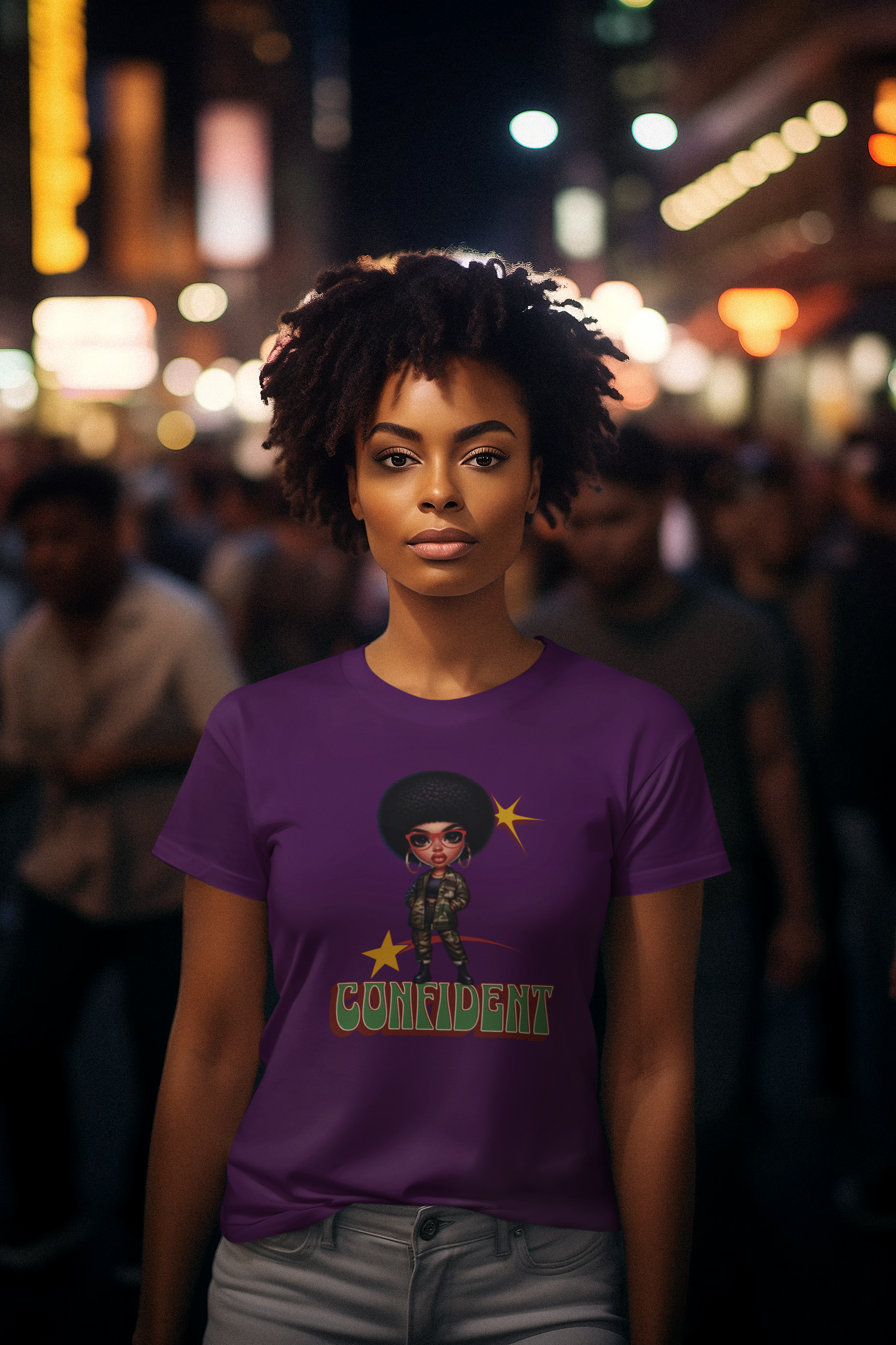 This design exudes a playful yet powerful sense of confidence. Featuring a stylized Black woman with a bold afro, oversized glasses, and a trendy camouflage outfit, the image captures a modern and assertive aesthetic. The word "CONFIDENT" is prominently displayed in a bold, retro-inspired font, reinforcing the message of self-assurance.