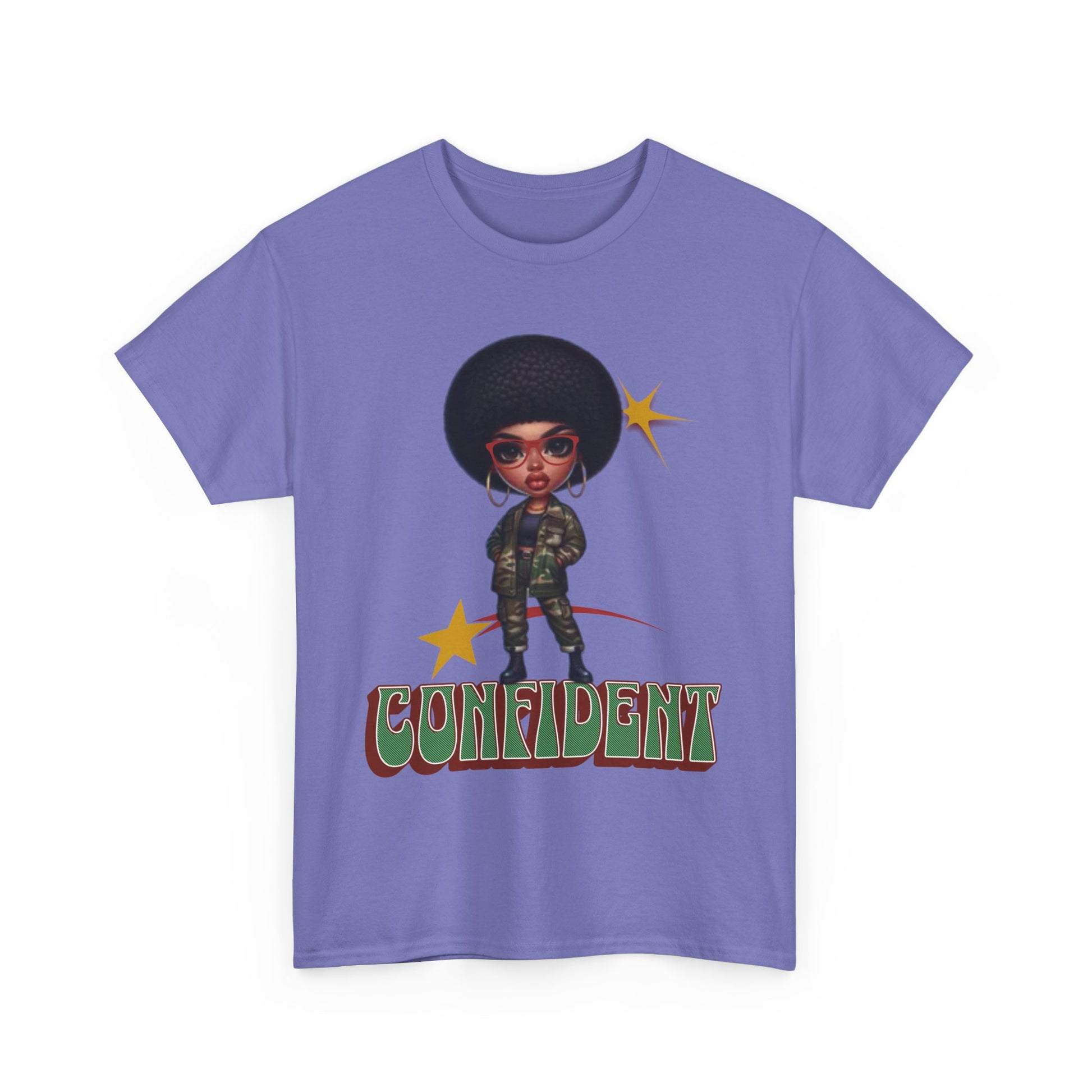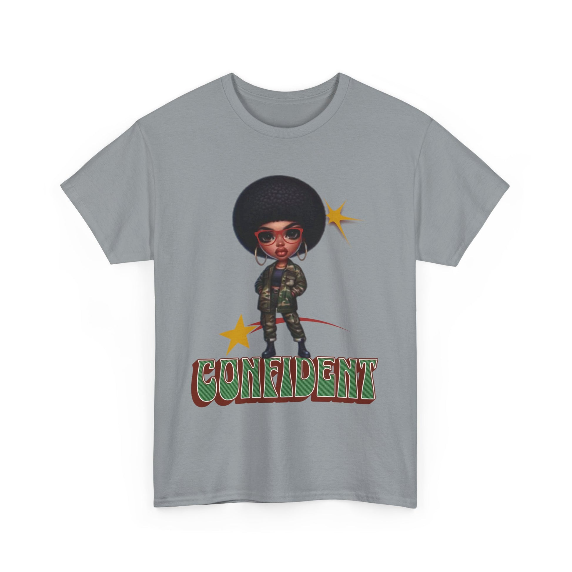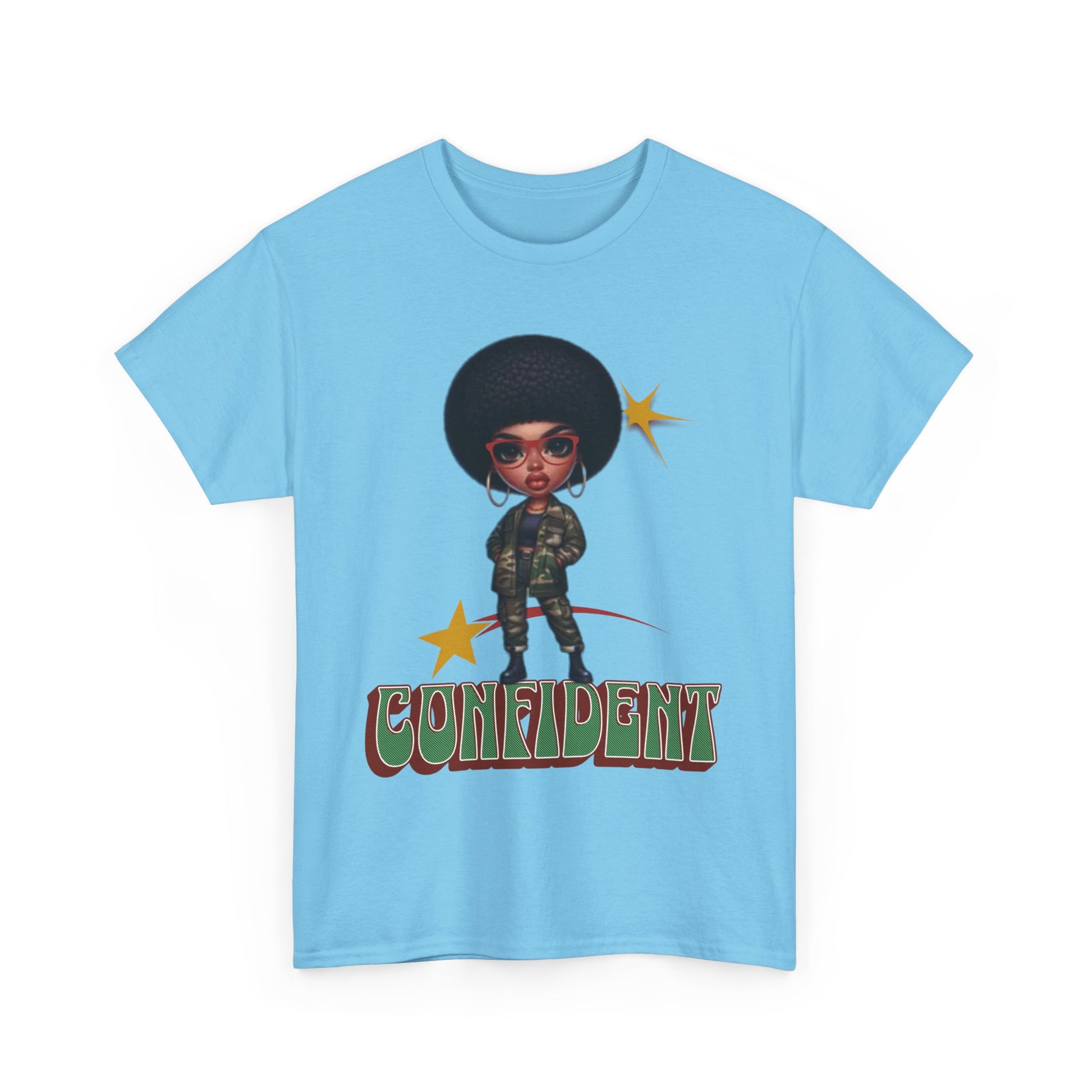 This design exudes a playful yet powerful sense of confidence. Featuring a stylized Black woman with a bold afro, oversized glasses, and a trendy camouflage outfit, the image captures a modern and assertive aesthetic. The word "CONFIDENT" is prominently displayed in a bold, retro-inspired font, reinforcing the message of self-assurance.