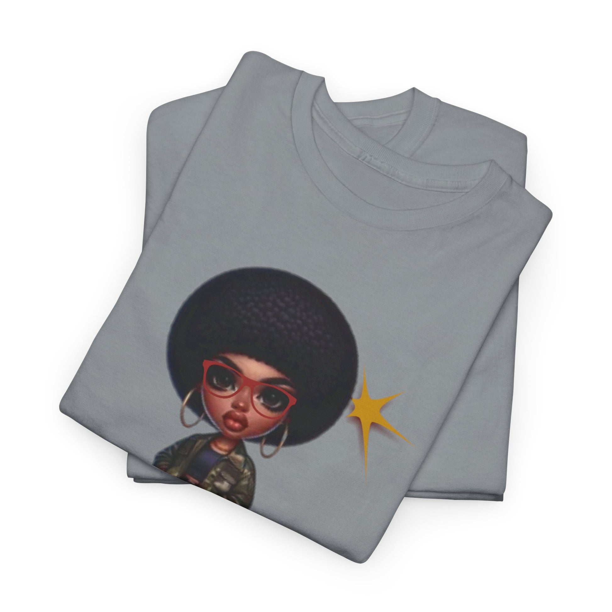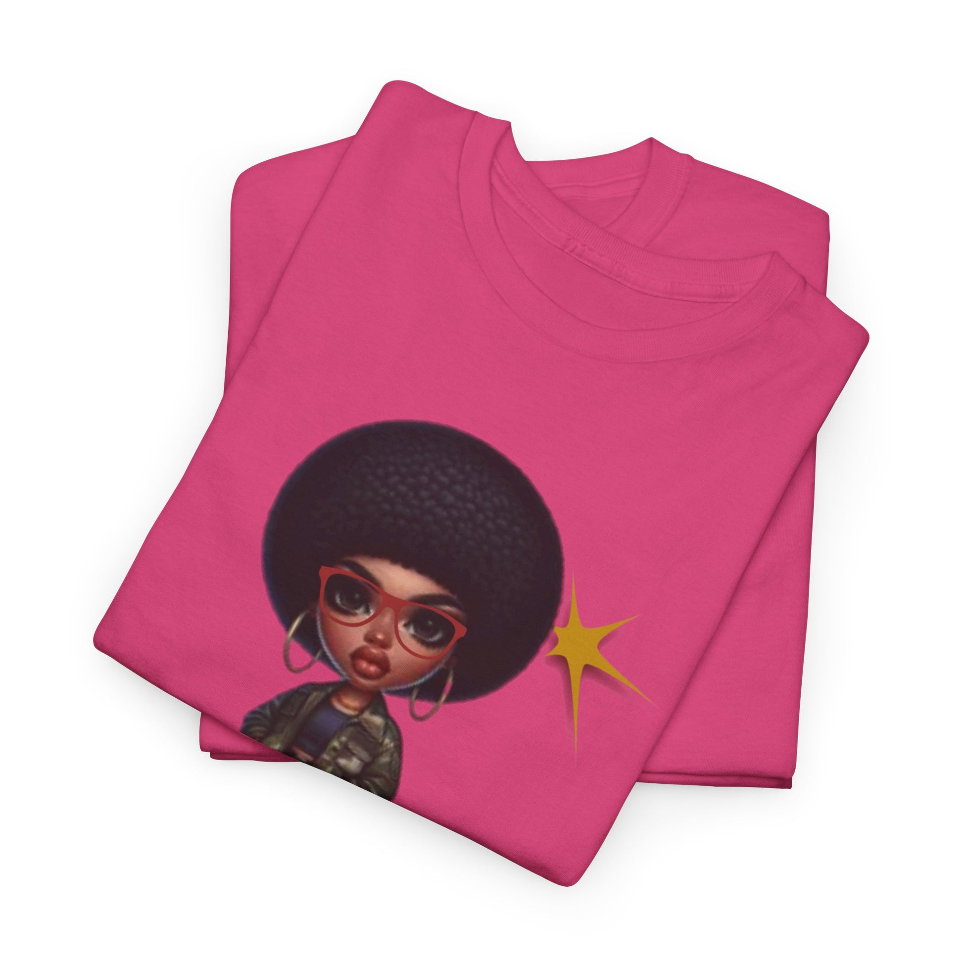 The design celebrates Black femininity and individuality. The character's expressive features, combined with the stylish attire, create a strong visual statement. The playful stars add a touch of whimsy, balancing the overall sense of empowerment.