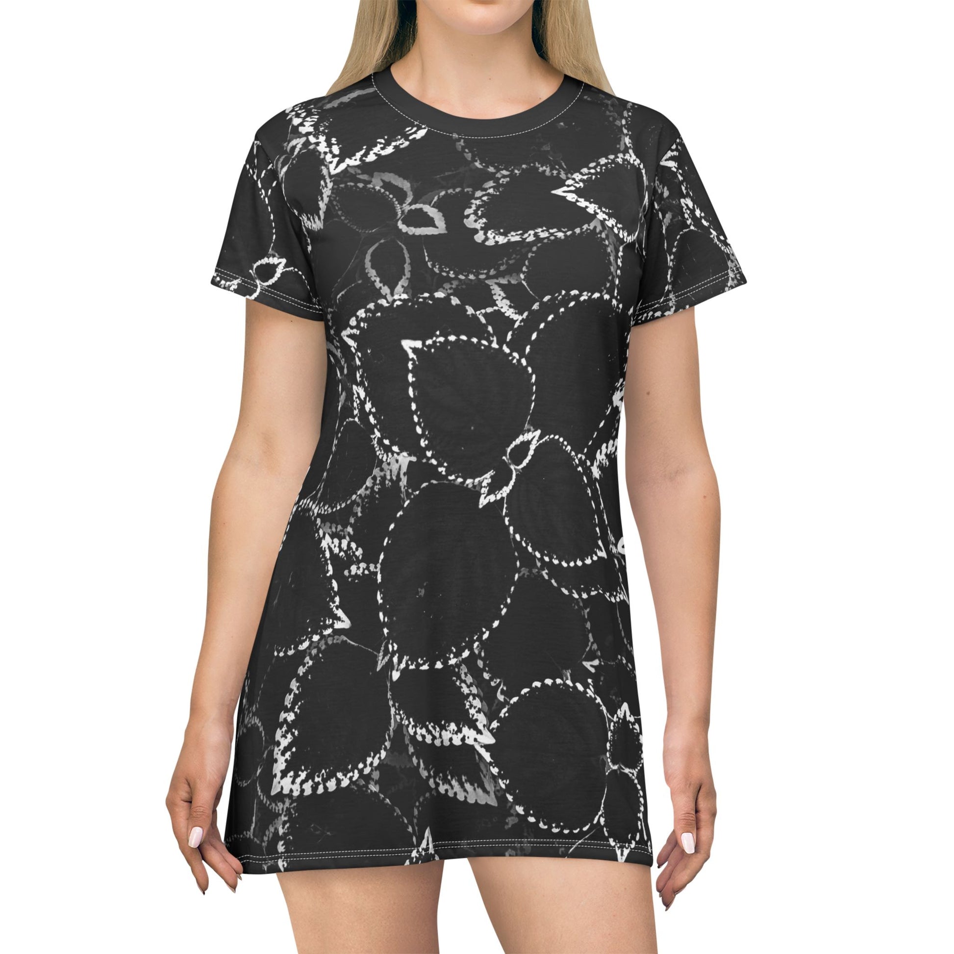 This black leaf print T-Shirt Dress is tag less, custom cut and sewn to match every style. This fun print will make heads turn wherever you go. Be comfortable for the New Year in this sleek stylish t-shirt dress.