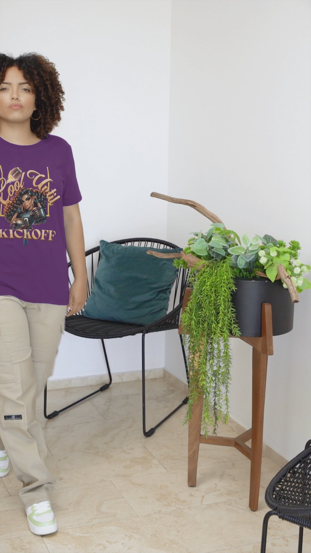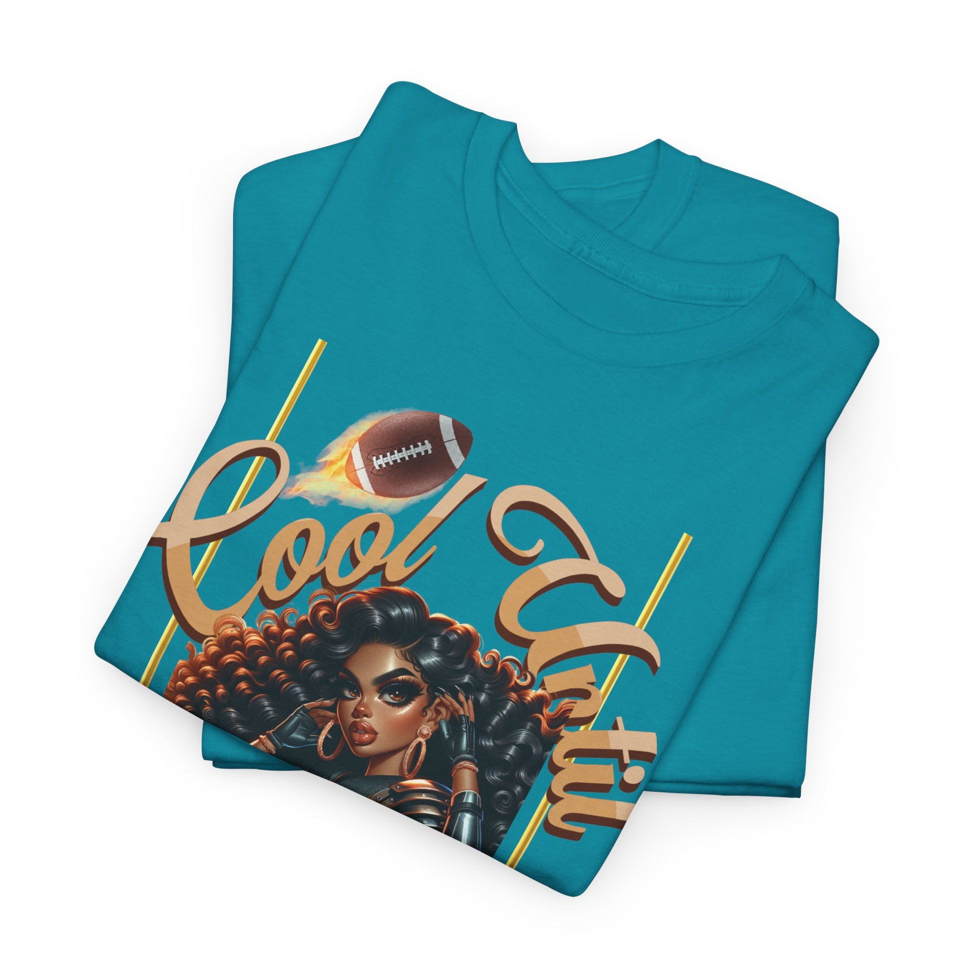 This design masterfully blends the worlds of high fashion and football fandom, creating a unique and eye-catching aesthetic. Featuring a glamorous Black woman sporting a football jersey and helmet, the image exudes both style and sporty enthusiasm. The phrase "Cool Until Kickoff" suggests a balance between laid-back chic and game-day excitement. The golden goalposts and flaming football add a touch of drama and highlight the football theme. The character's flawless makeup, voluminous hair, and stylish accessories create a striking contrast with the sporty elements, making this design a bold and fashionable statement for those who appreciate both style and sports.