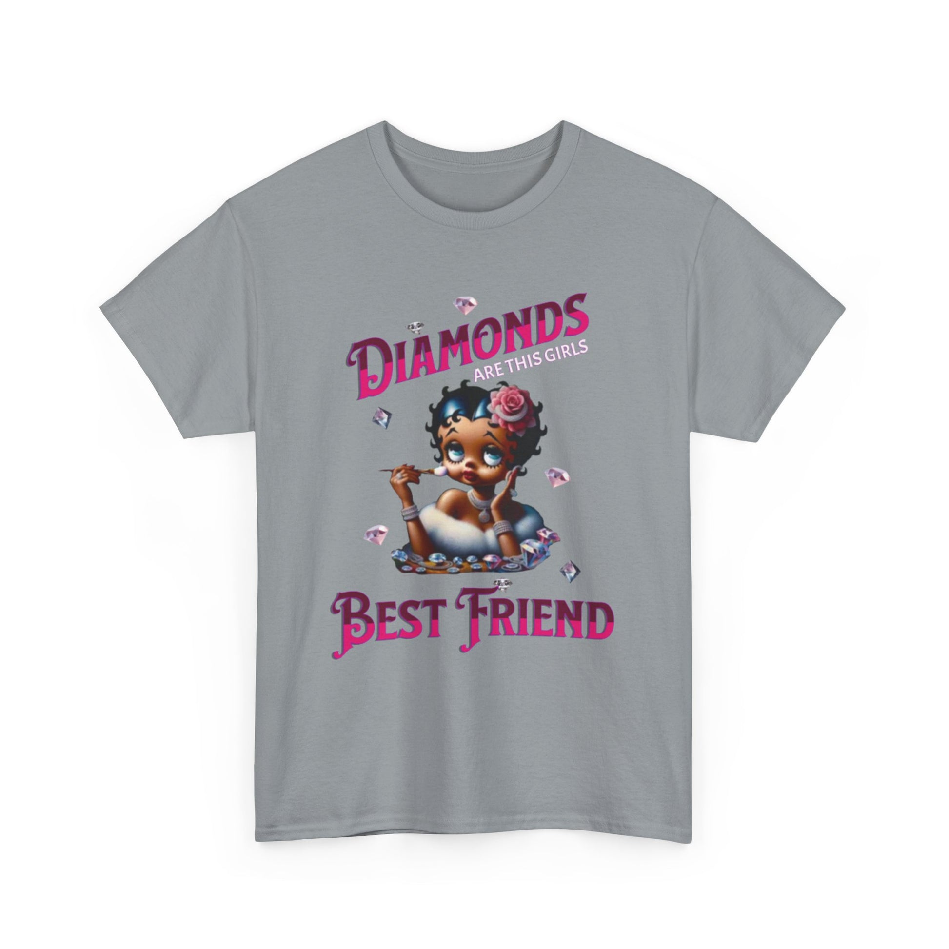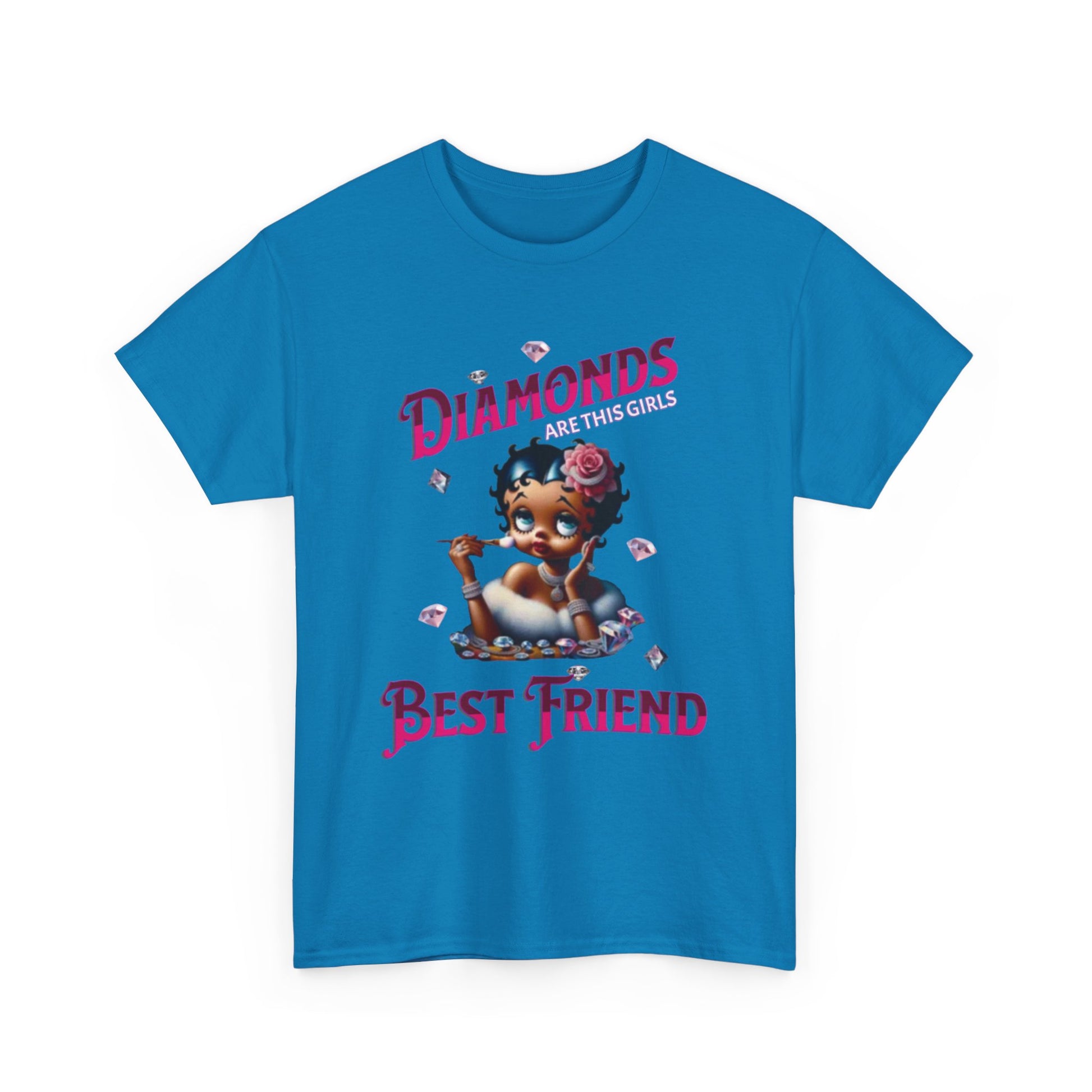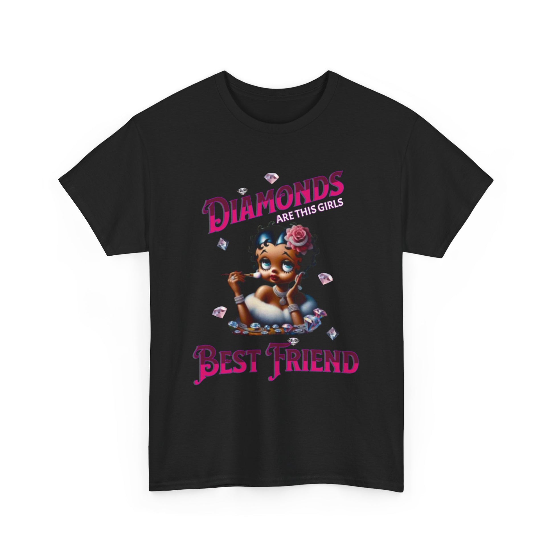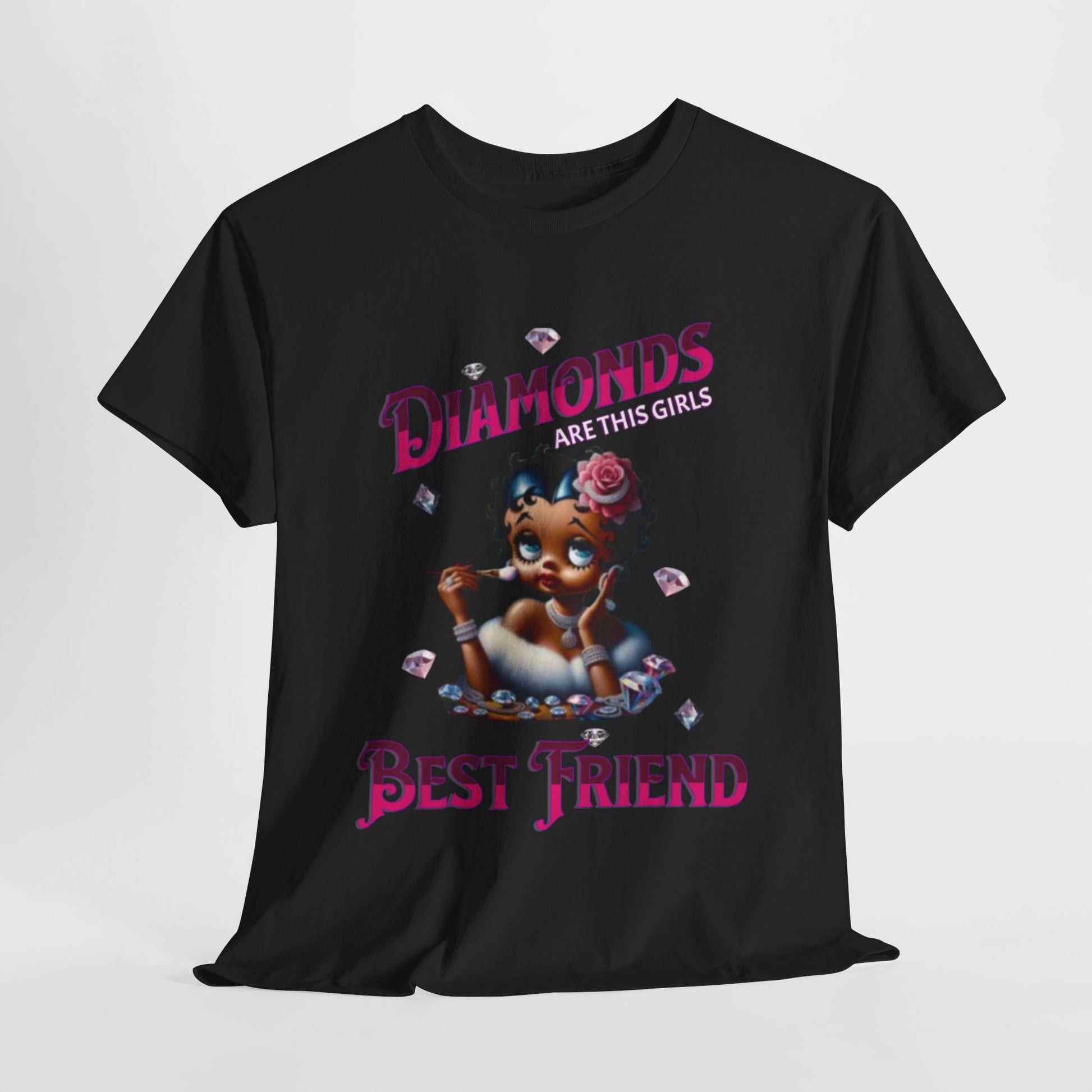 This design playfully blends classic glamour with a touch of modern sass. Featuring a reimagined Betty Boop adorned with diamonds and a rose in her hair, the image exudes a chic and luxurious vibe. The phrase "Diamonds ARE THIS GIRL'S Best friend" playfully twists the iconic Marilyn Monroe quote, creating a fun and relatable message for those who appreciate a bit of sparkle. Betty's poised expression and delicate makeup brush suggest she's always ready for her close-up, making this design a celebration of confidence and style. The scattered diamonds add a touch of whimsy and enhance the overall glamorous aesthetic. This piece is perfect for those who love a blend of vintage charm and modern wit, celebrating femininity with a touch of sparkle.