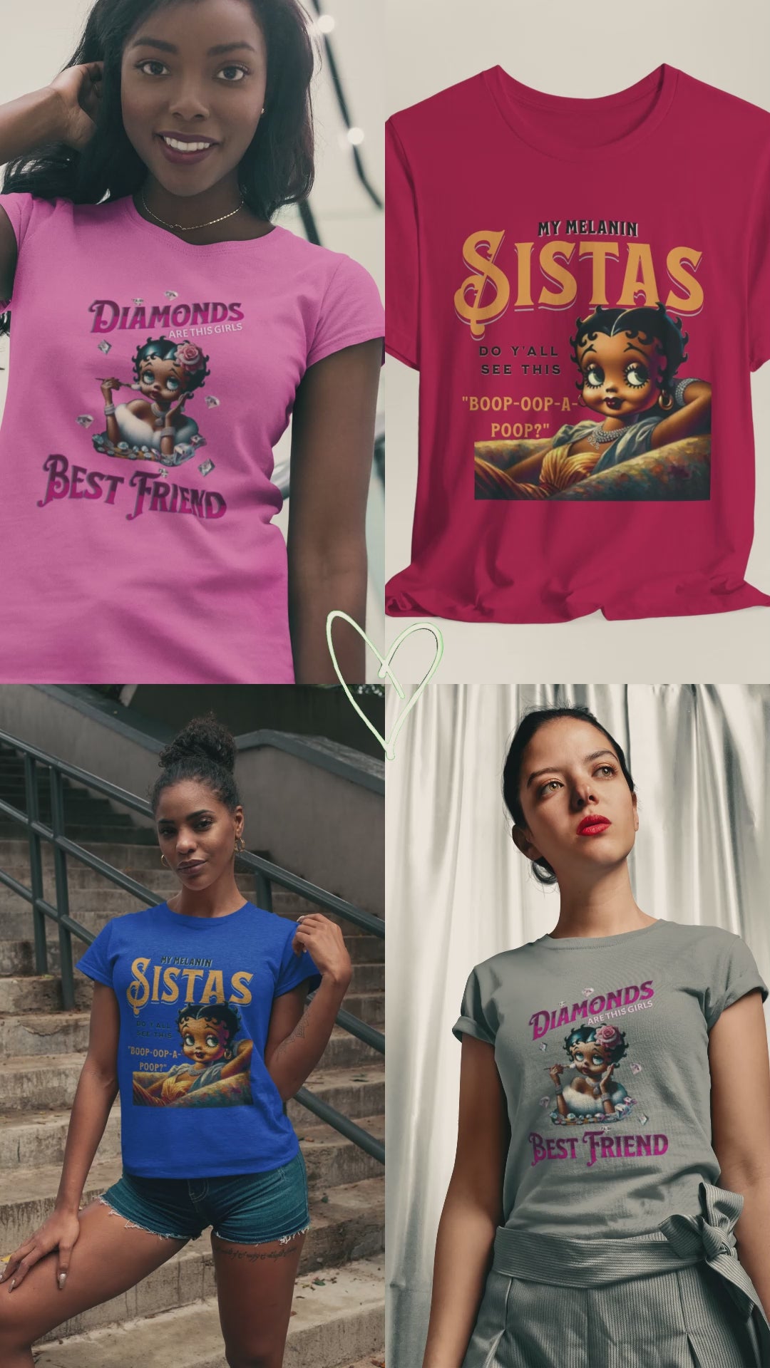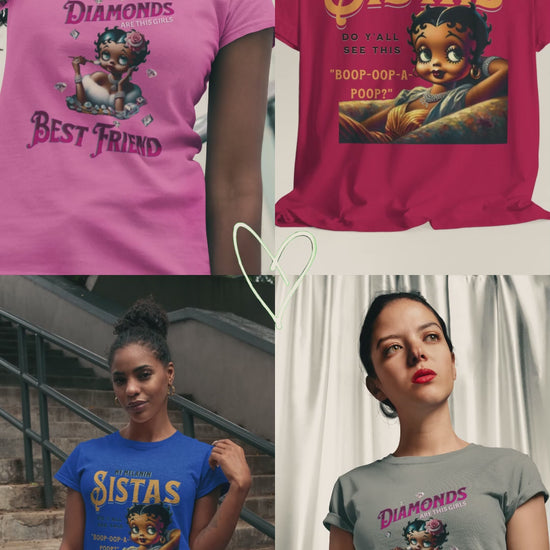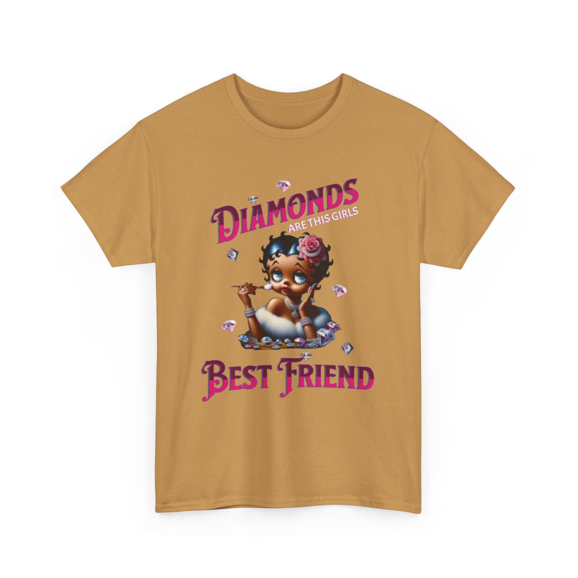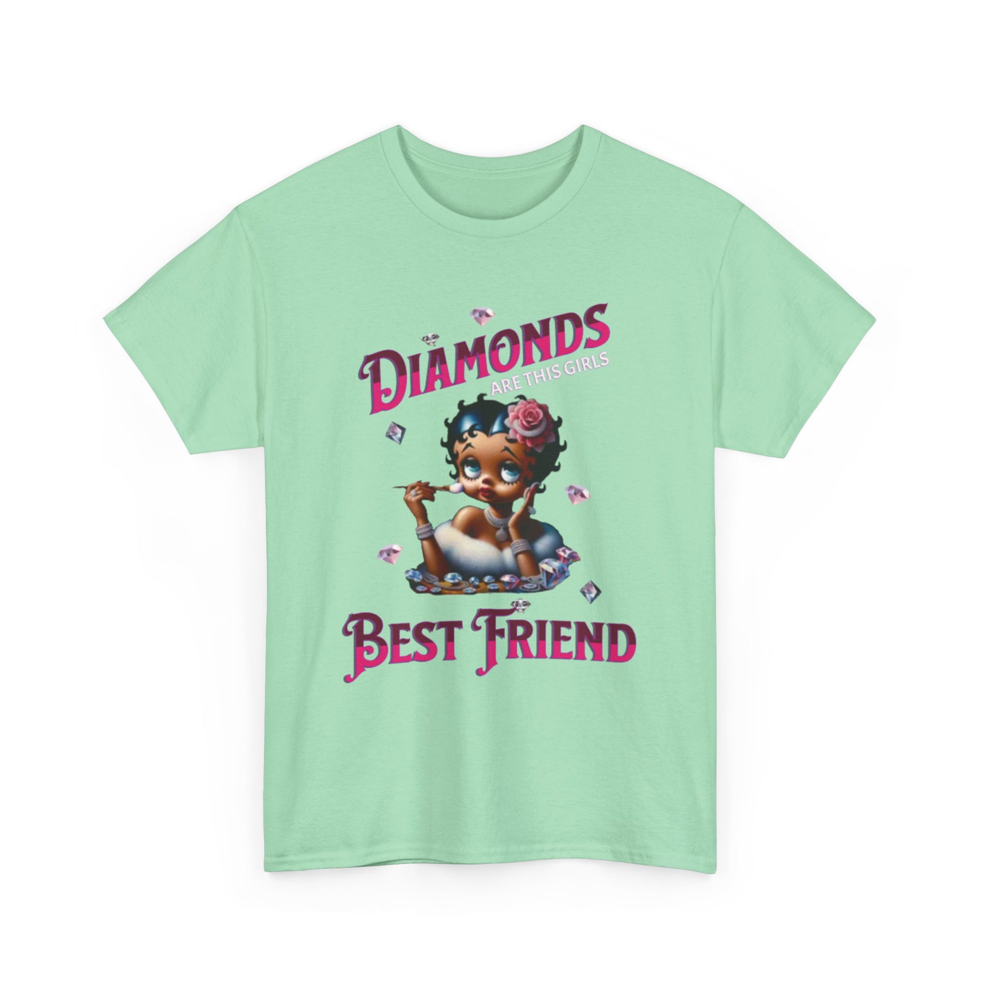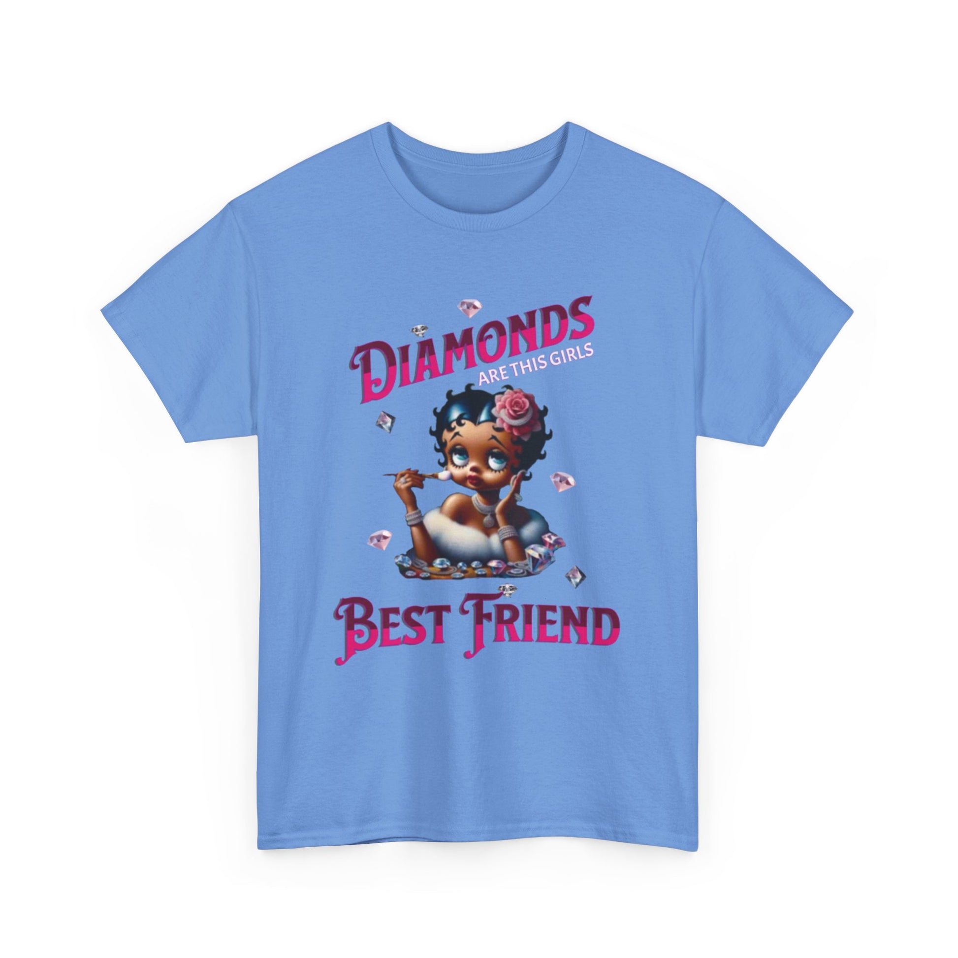 This design playfully blends classic glamour with a touch of modern sass. Featuring a reimagined Betty Boop adorned with diamonds and a rose in her hair, the image exudes a chic and luxurious vibe. The phrase "Diamonds ARE THIS GIRL'S Best friend" playfully twists the iconic Marilyn Monroe quote, creating a fun and relatable message for those who appreciate a bit of sparkle. Betty's poised expression and delicate makeup brush suggest she's always ready for her close-up, making this design a celebration of confidence and style. The scattered diamonds add a touch of whimsy and enhance the overall glamorous aesthetic. This piece is perfect for those who love a blend of vintage charm and modern wit, celebrating femininity with a touch of sparkle.