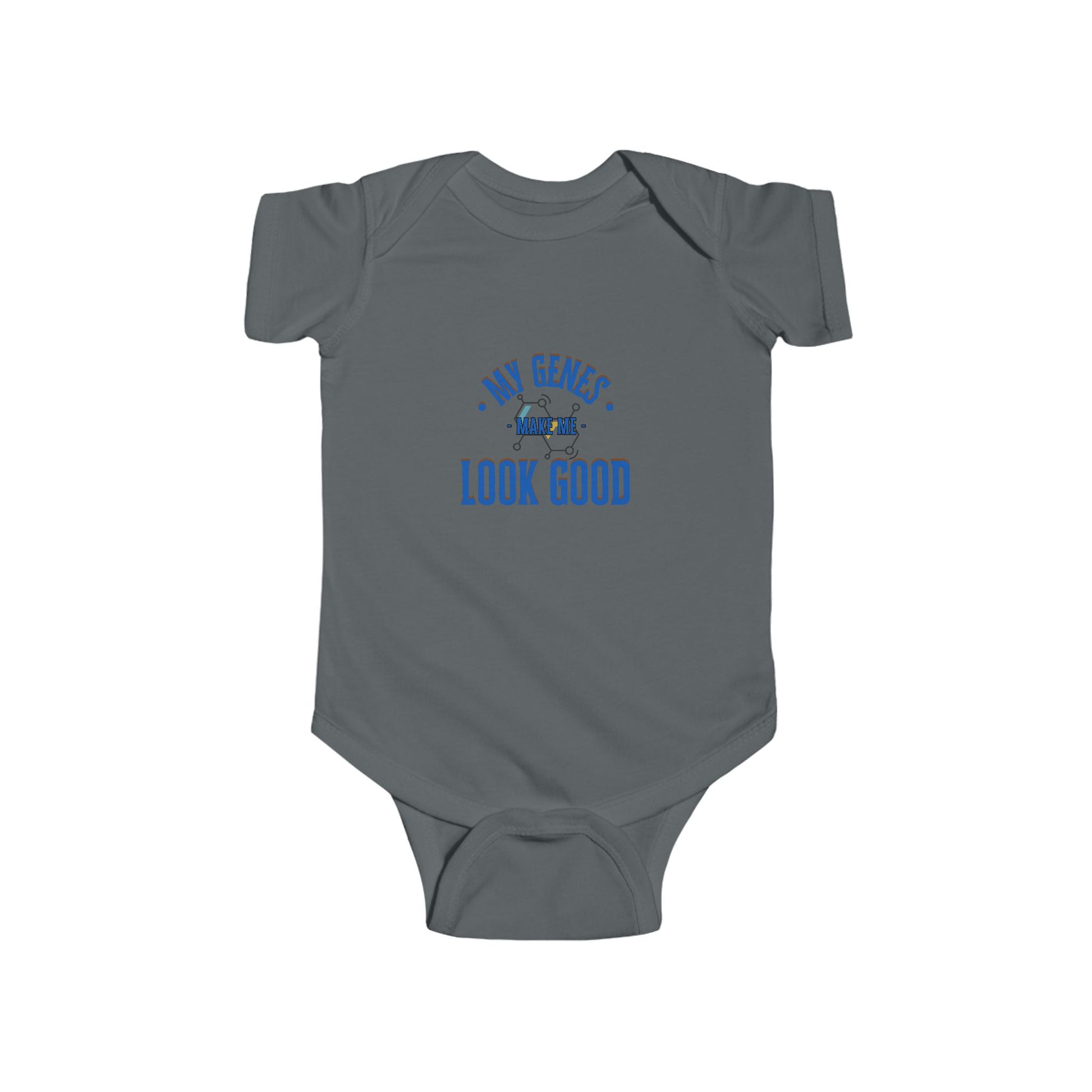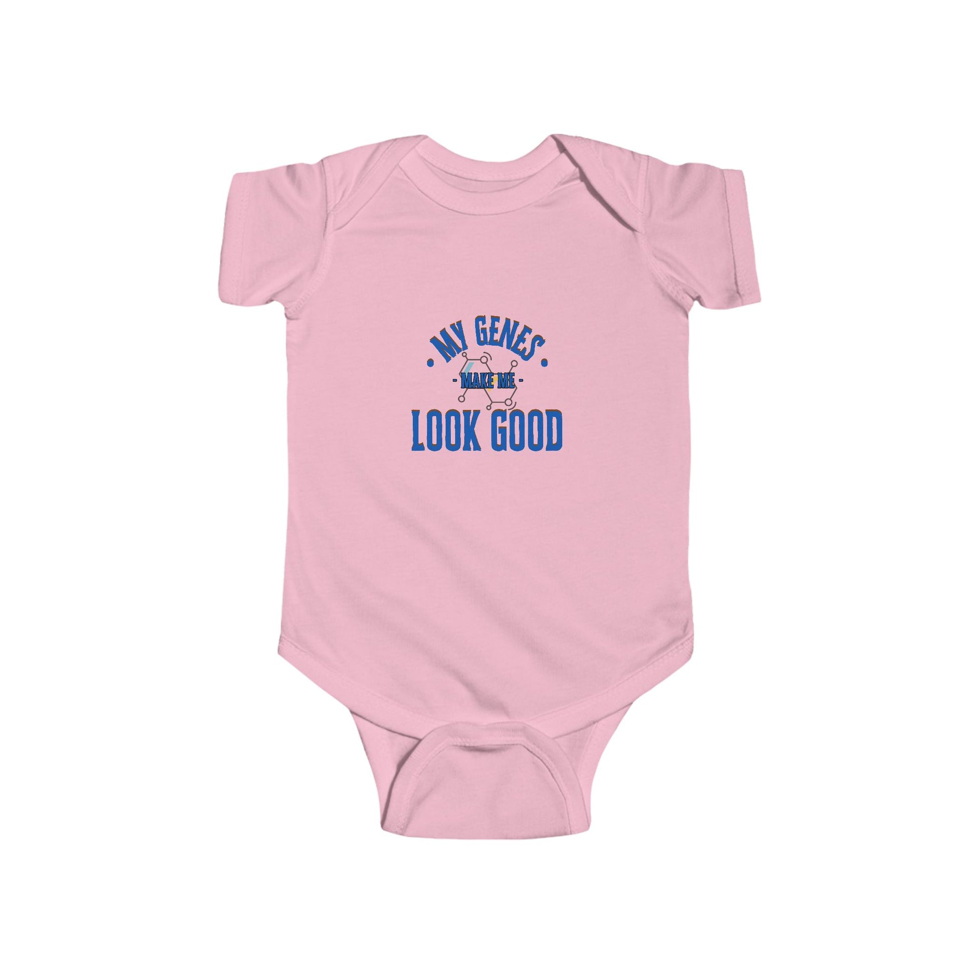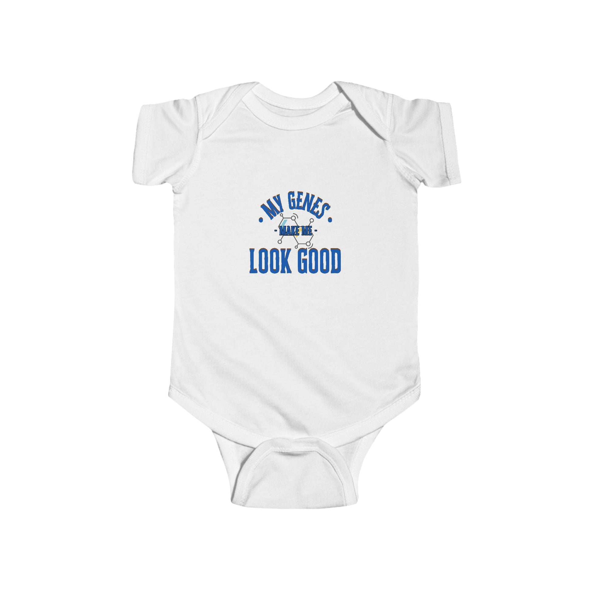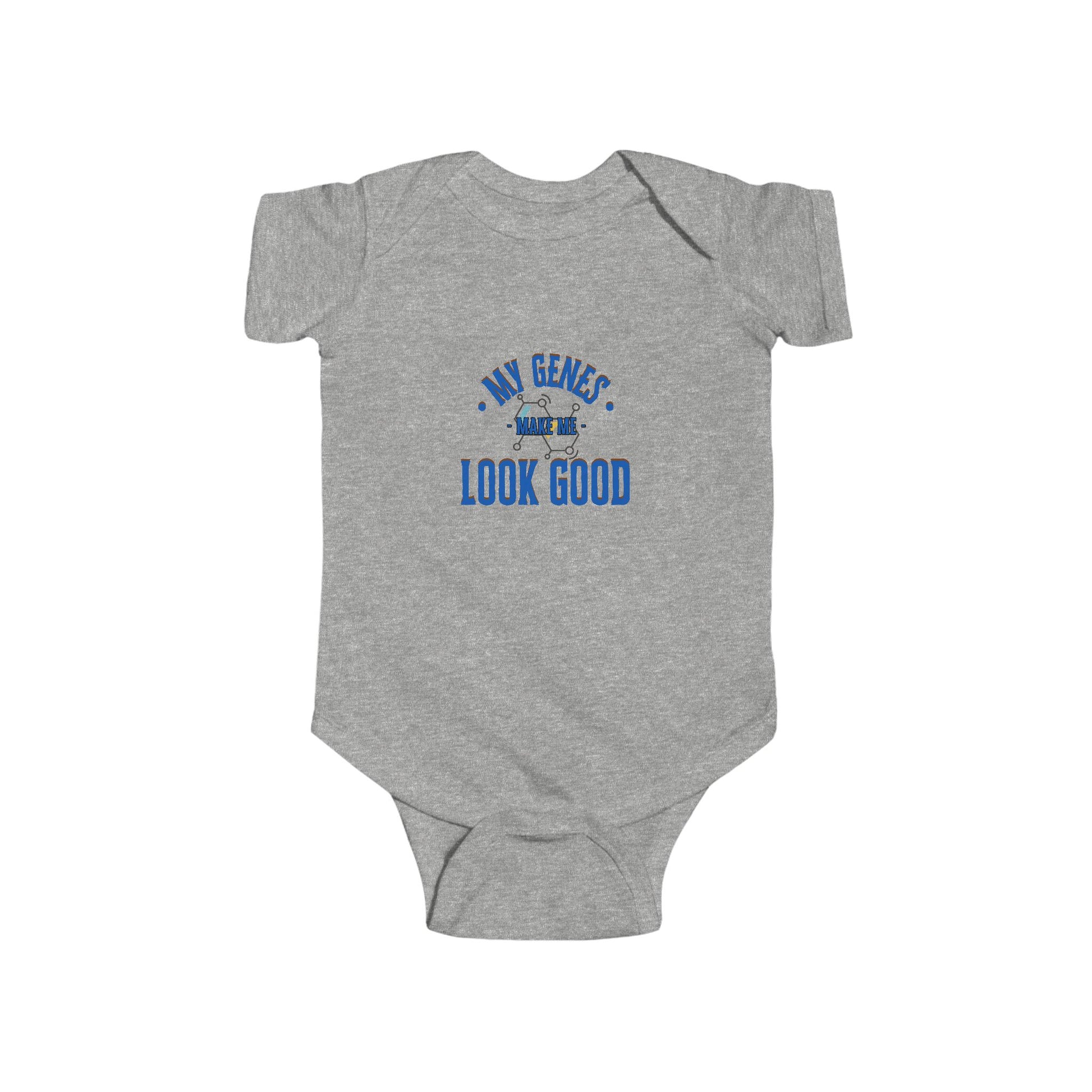 (Matching Adult Shirt sold separately) Cute funny baby onesie for boys and girls. A perfect baby shower gift for boys and girls. My genes make me look good onesies with matching t-shirts for the parents to represent cute DNA results. Baby clothing needs to be both durable and soft. With the infant fine jersey bodysuit, youths get just that. The fabric is 100% cotton for solid colors. For heather colors, polyester is included. There are seams along the sides of this product. All bindings are made with ribbed knitting for improved durability. There are plastic snaps at the cross closure for easy changing access.