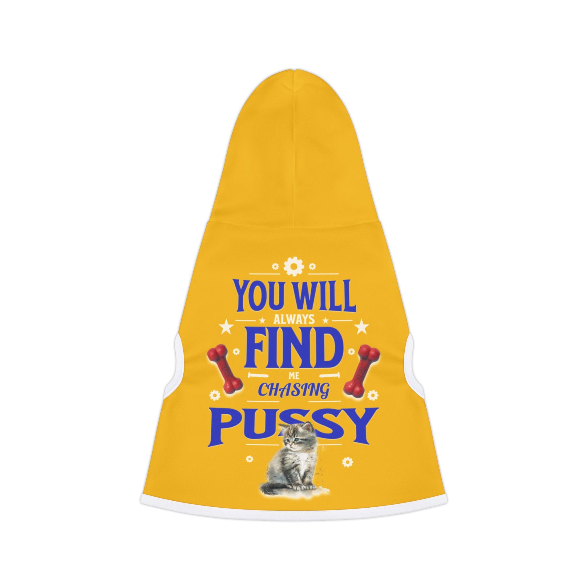 Funny Pet Hoodie: 'You Will Find Me Chasing Pussy Cat' Design, Dog and Cat Apparel, Cute Pet Costume, Gift for Pet Lovers, Funny Pet Outfit