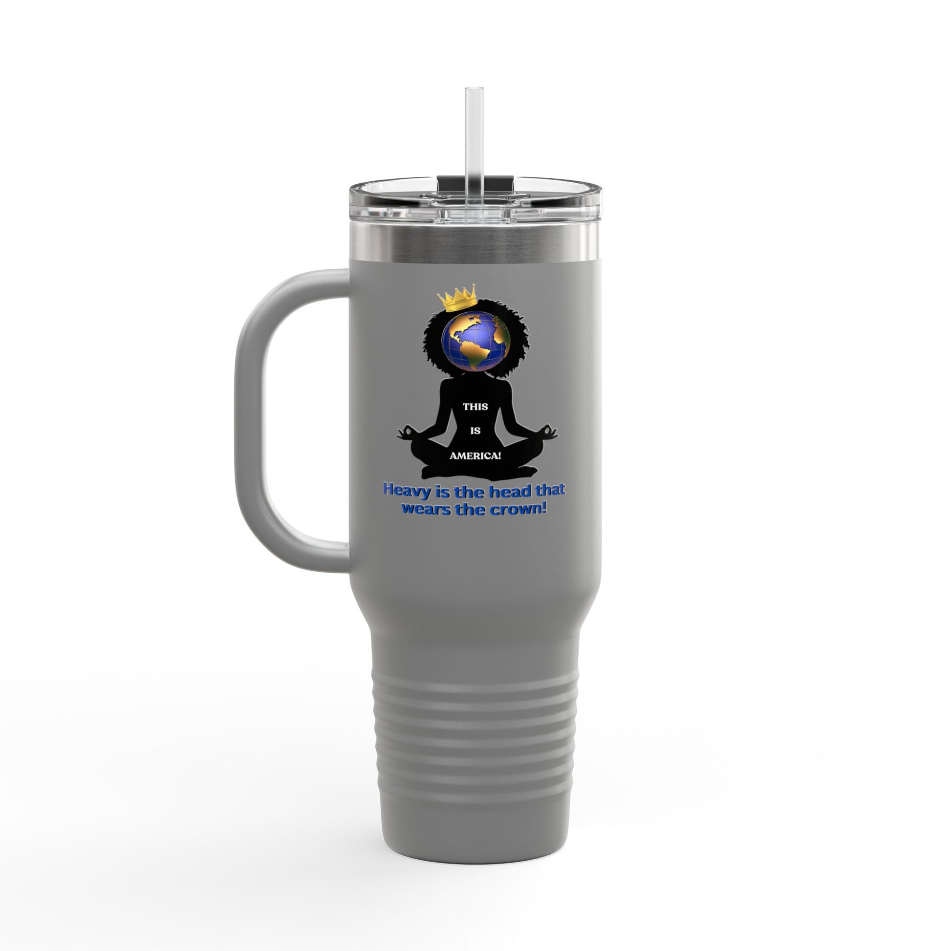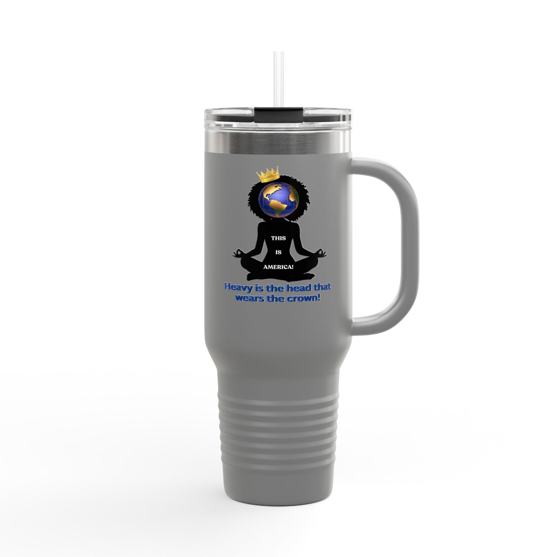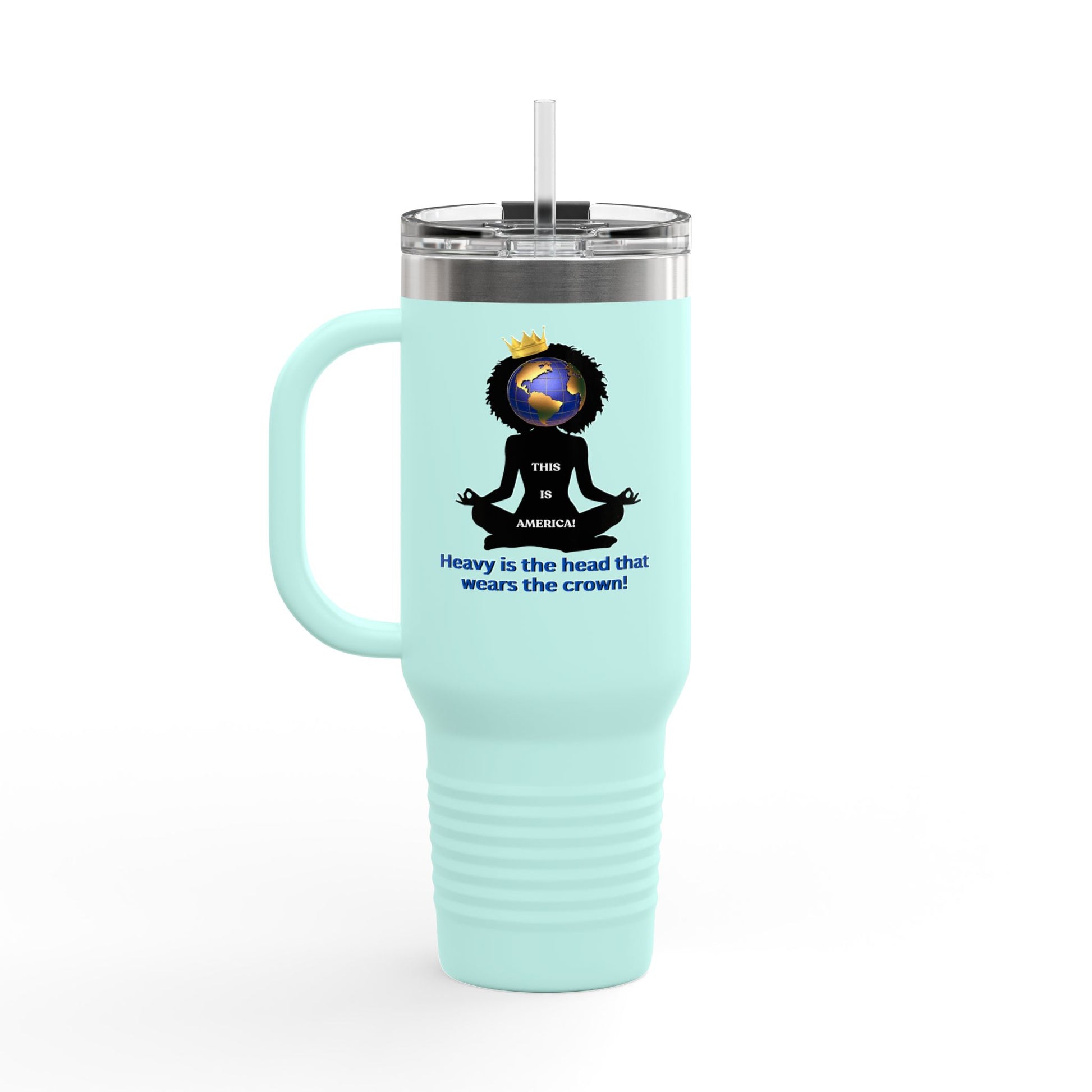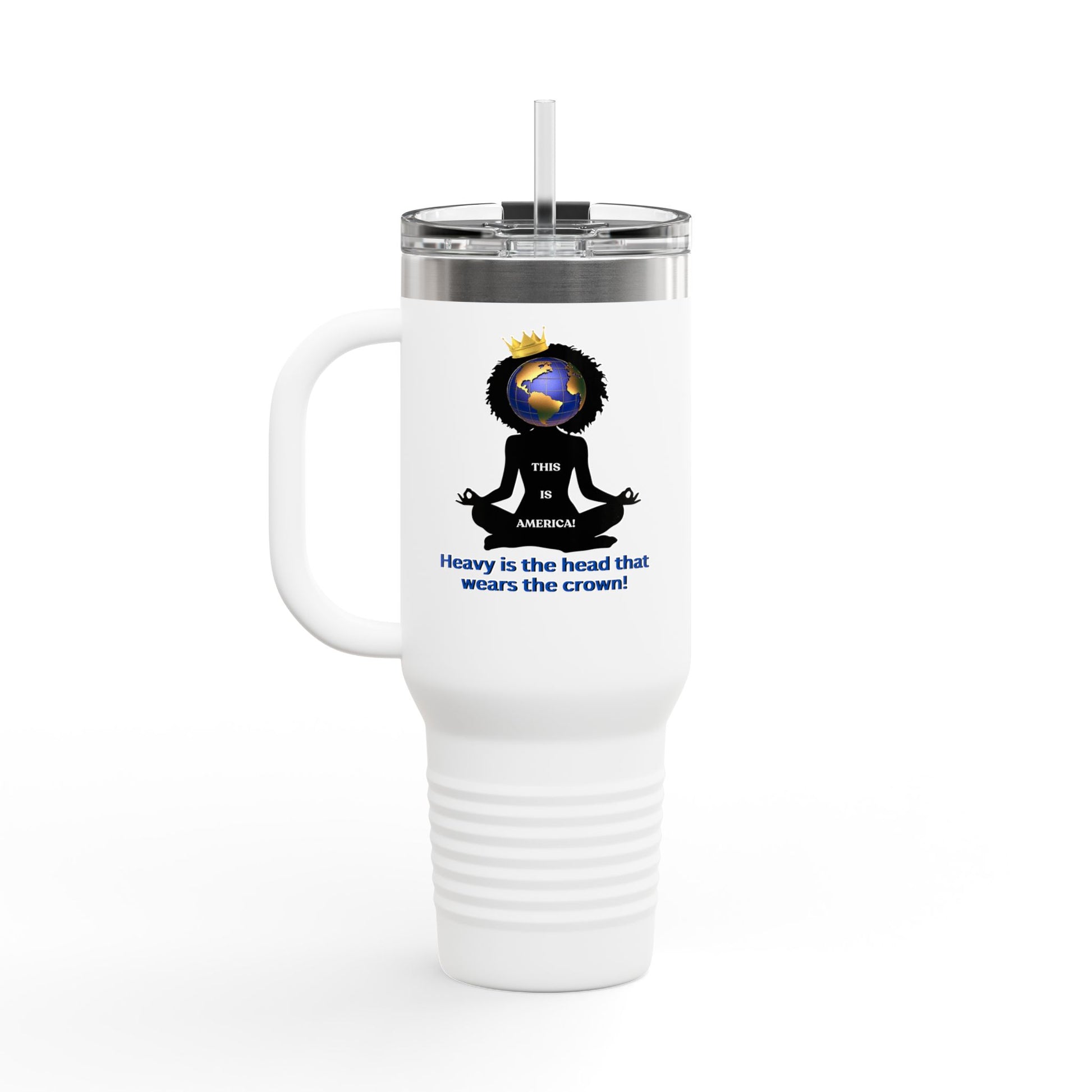 Carry your strength and style with the "Heavy is the Head" Polar Camel Tumbler. Featuring a striking image of a Black woman crowned with the world on her shoulder, alongside the powerful caption: "Heavy is the head that wears the crown – This is America," this tumbler is a tribute to resilience and power while keeping your beverages at the perfect temperature.