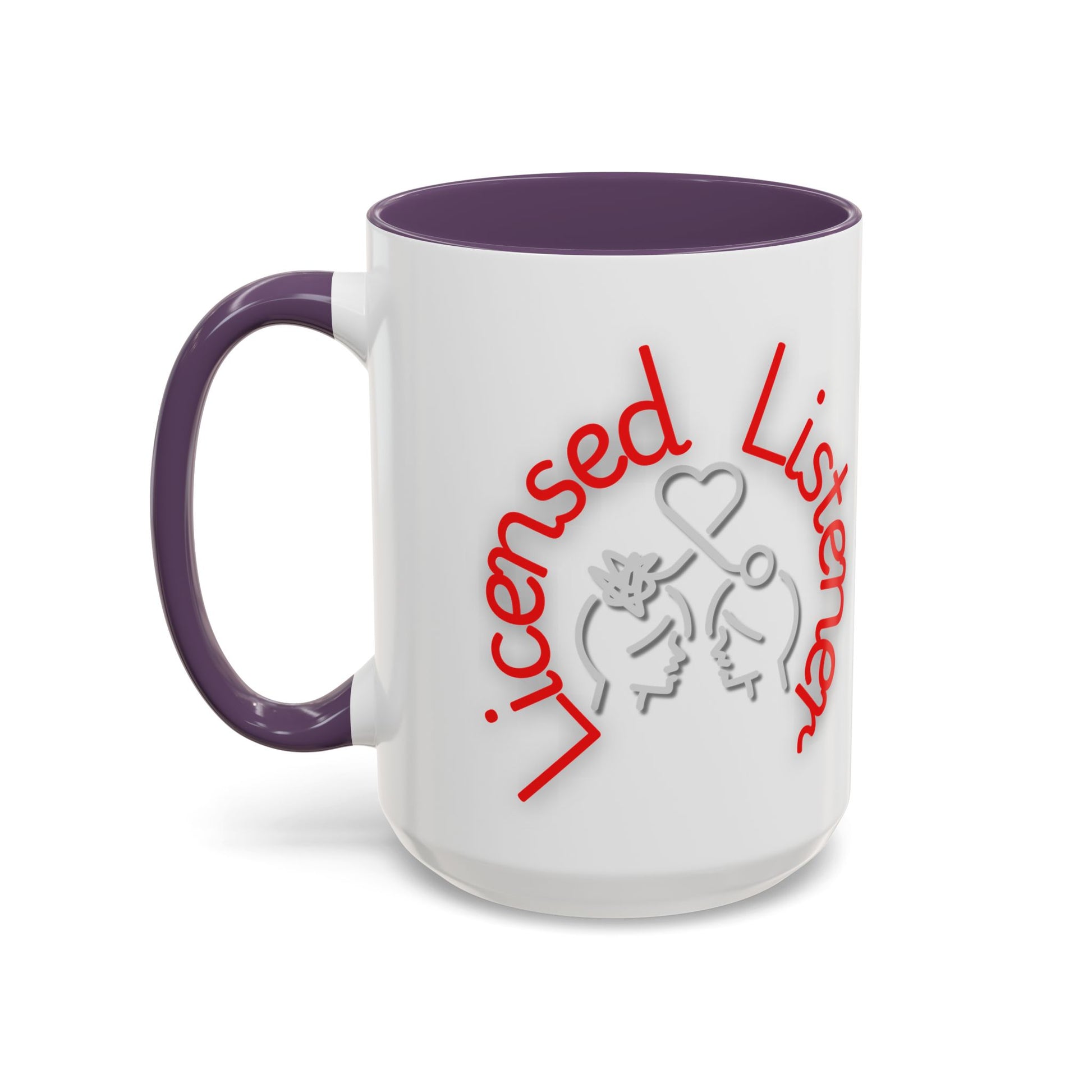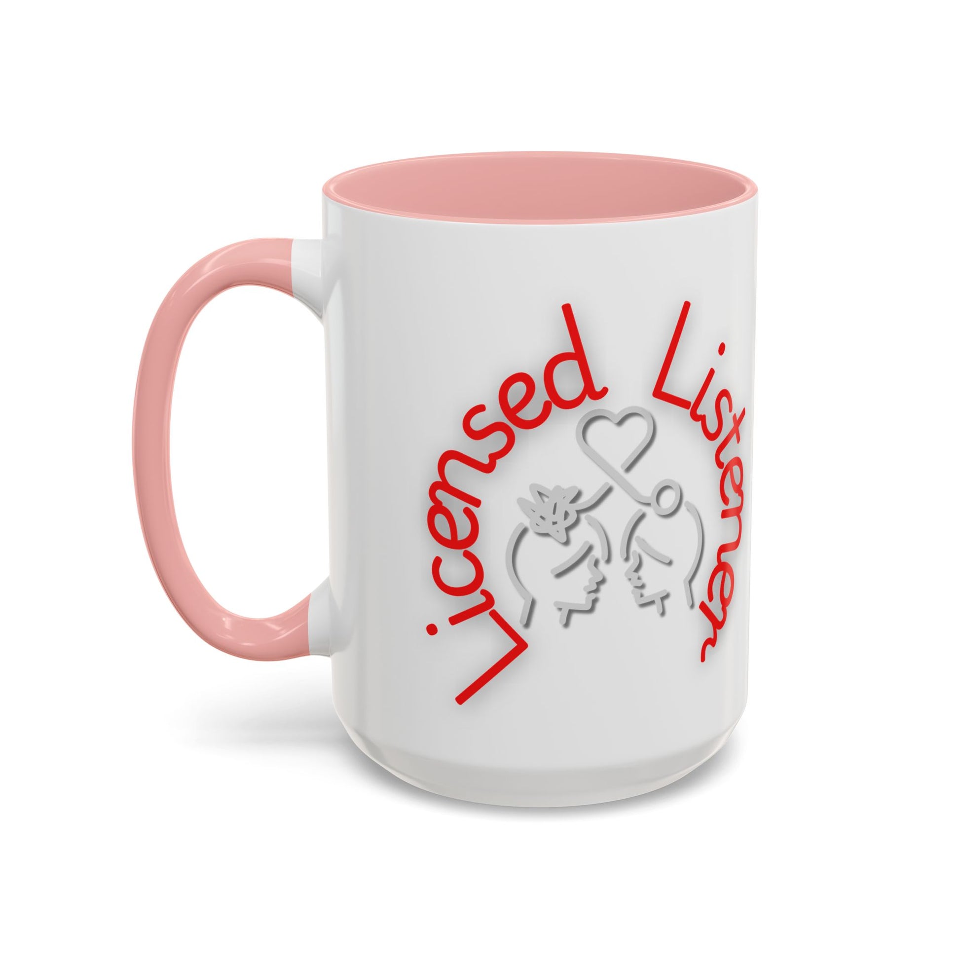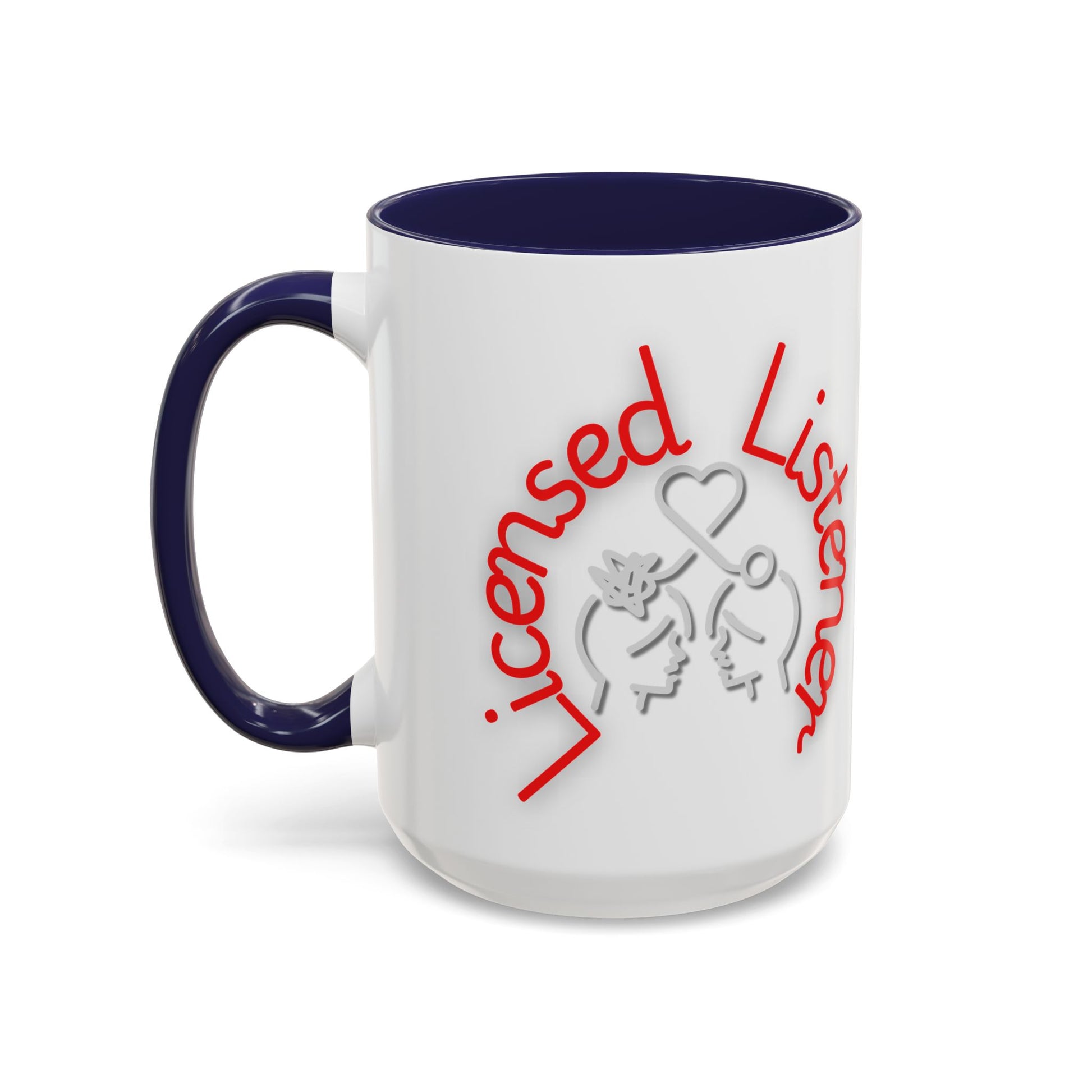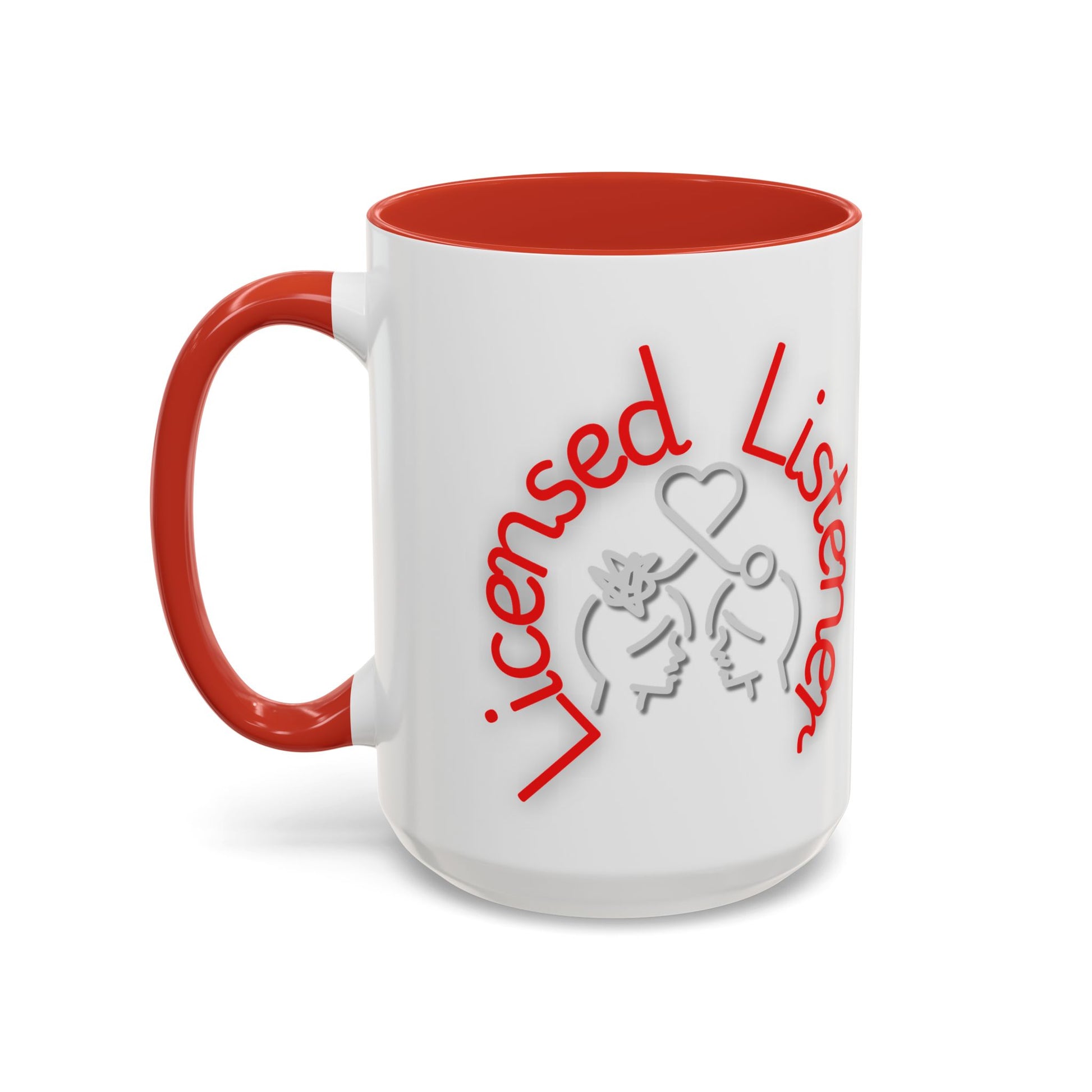 This creative design showcases the phrase "Licensed Listener" in bold red and white lettering, encircling a thoughtful illustration of two faces connected by a heart and a symbol of clarity. The tangled lines on one head and the unraveling connection emphasize empathy, understanding, and the power of listening.