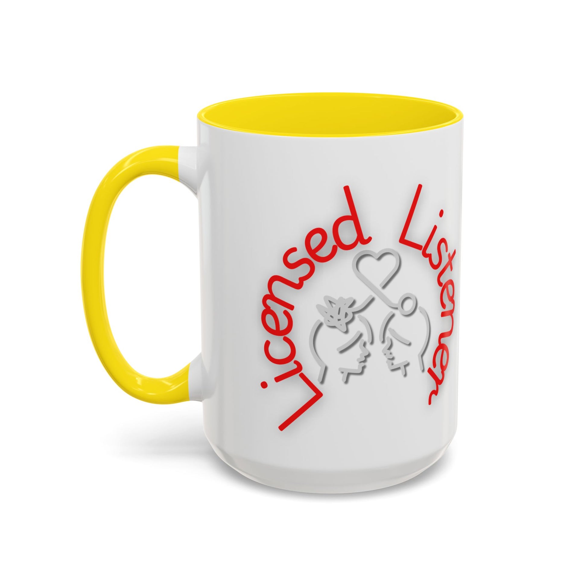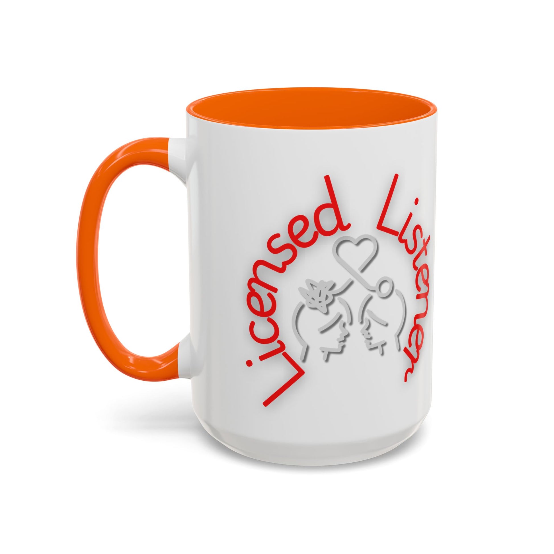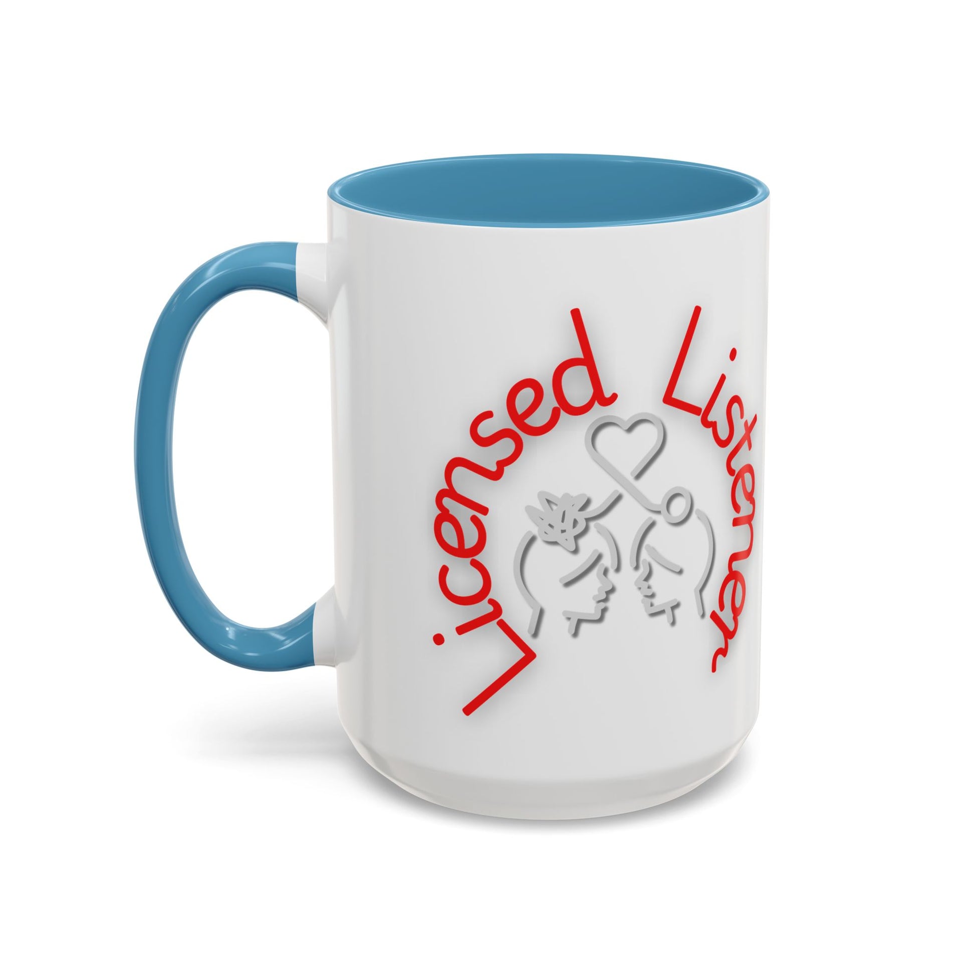 This creative design showcases the phrase "Licensed Listener" in bold red and white lettering, encircling a thoughtful illustration of two faces connected by a heart and a symbol of clarity. The tangled lines on one head and the unraveling connection emphasize empathy, understanding, and the power of listening.