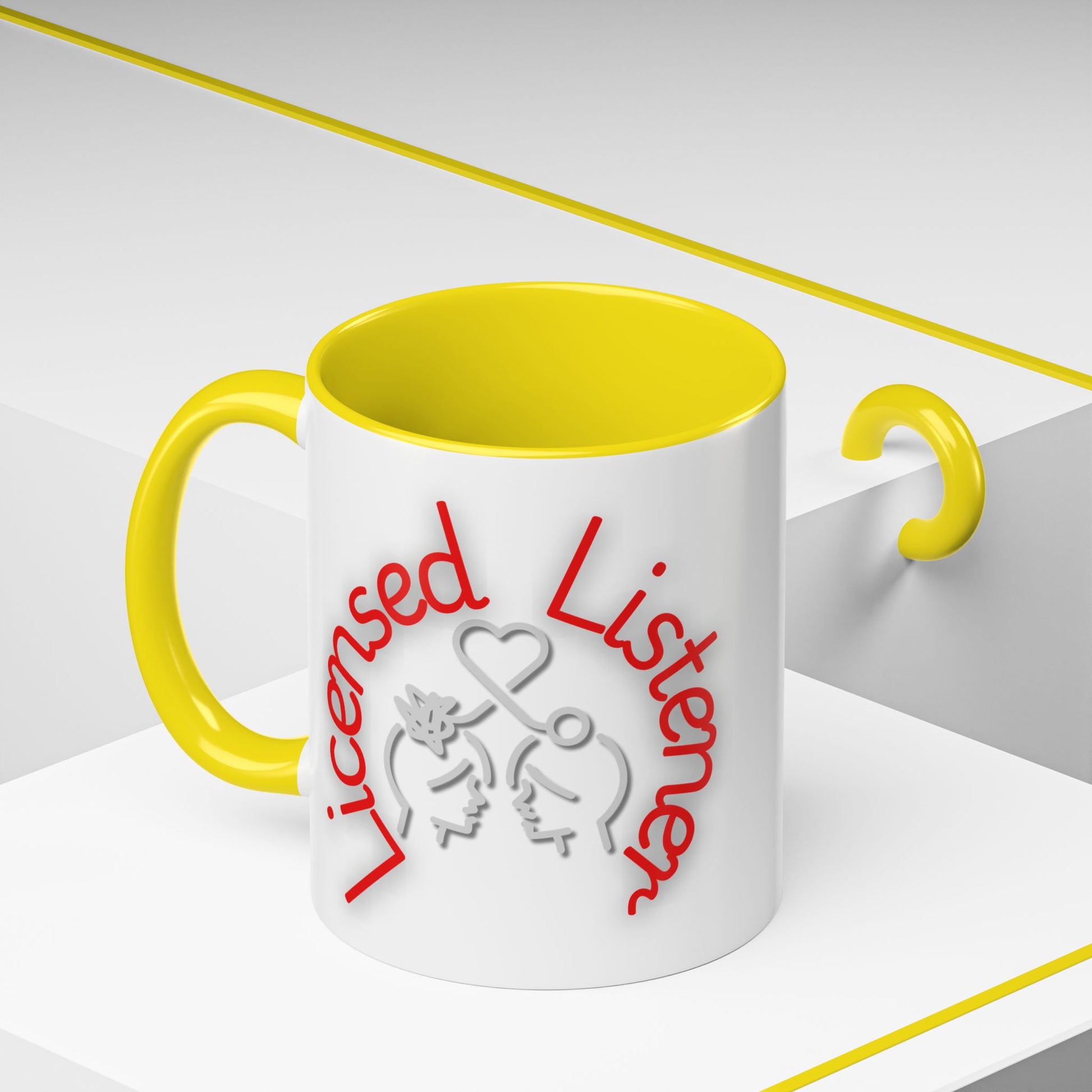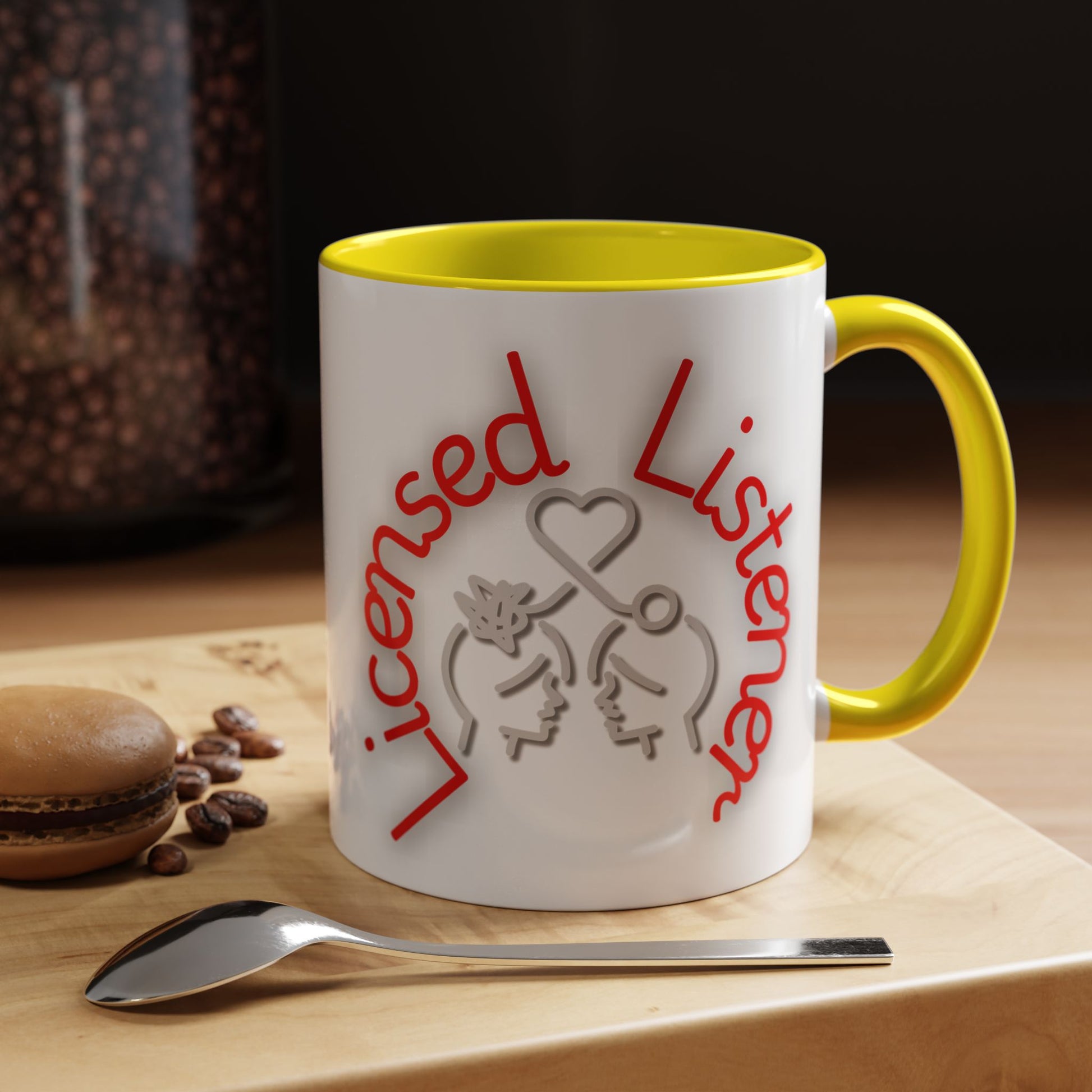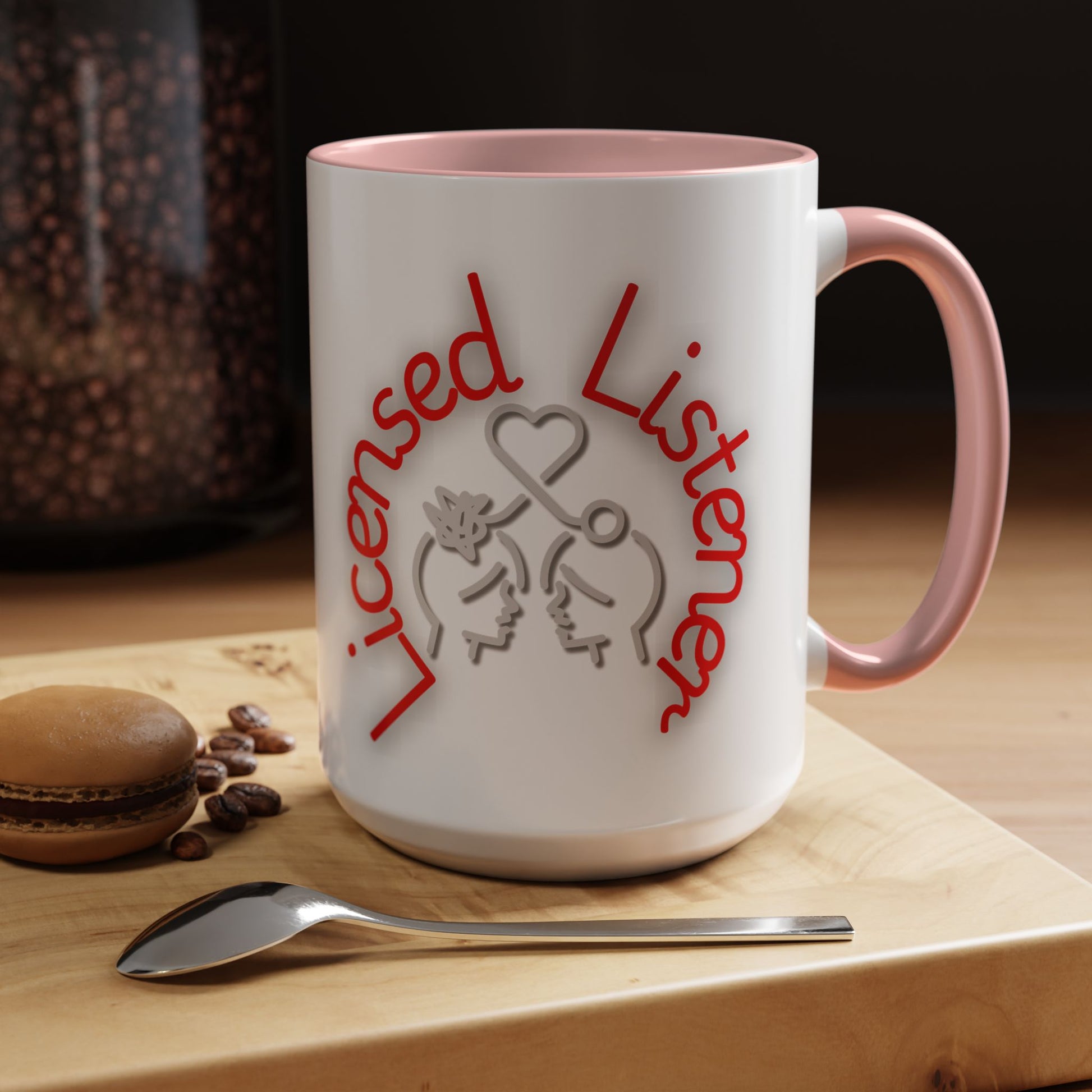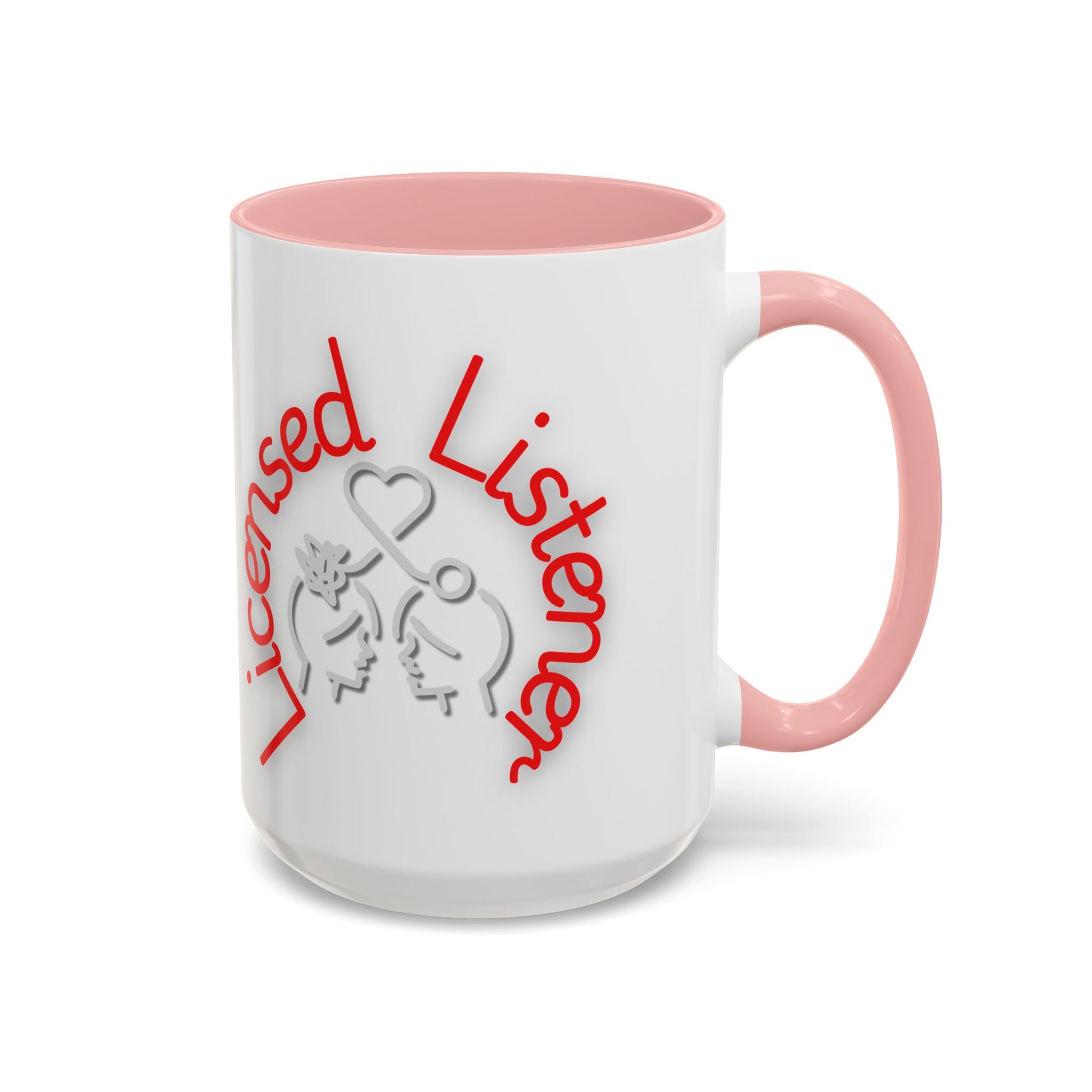 This creative design showcases the phrase "Licensed Listener" in bold red and white lettering, encircling a thoughtful illustration of two faces connected by a heart and a symbol of clarity. The tangled lines on one head and the unraveling connection emphasize empathy, understanding, and the power of listening.