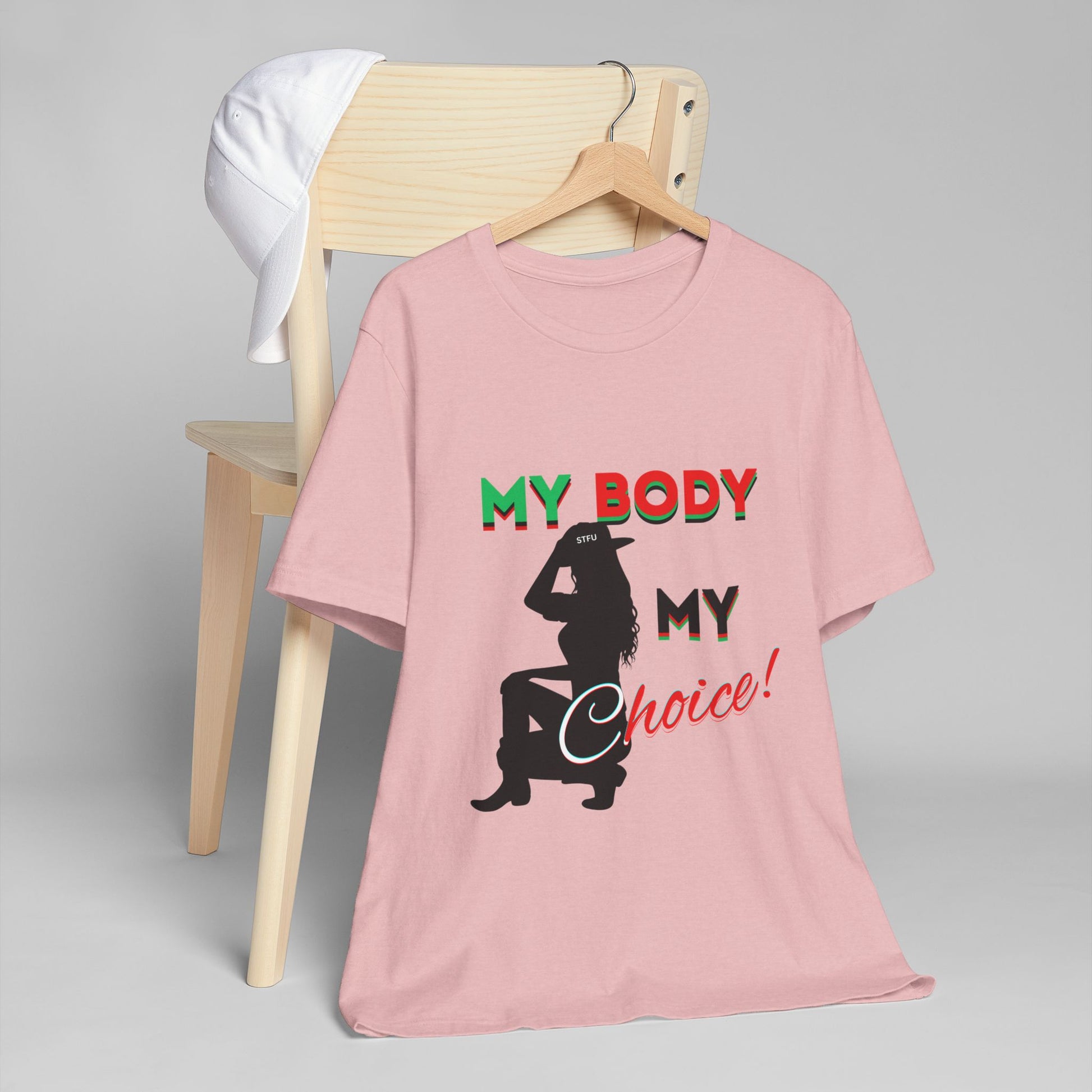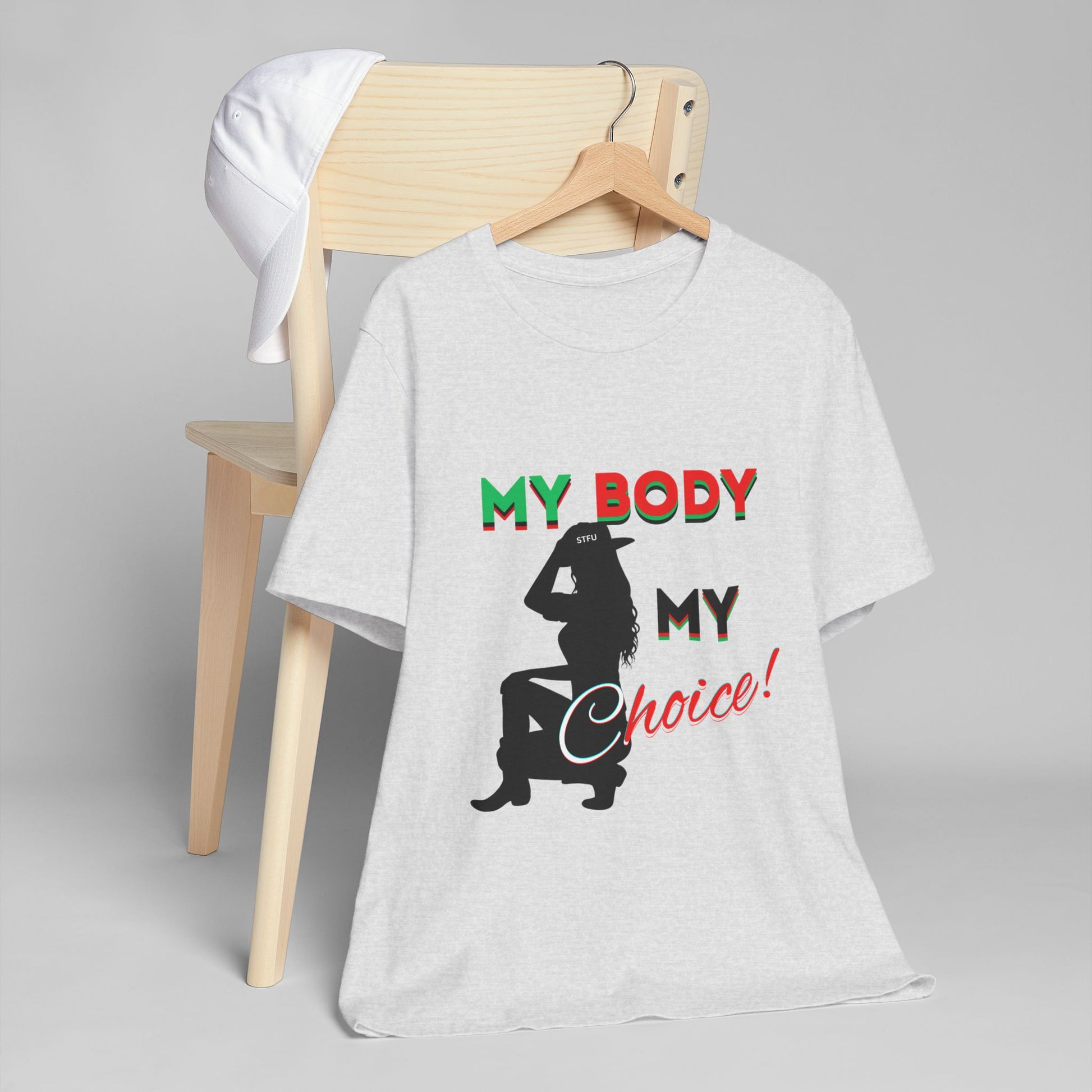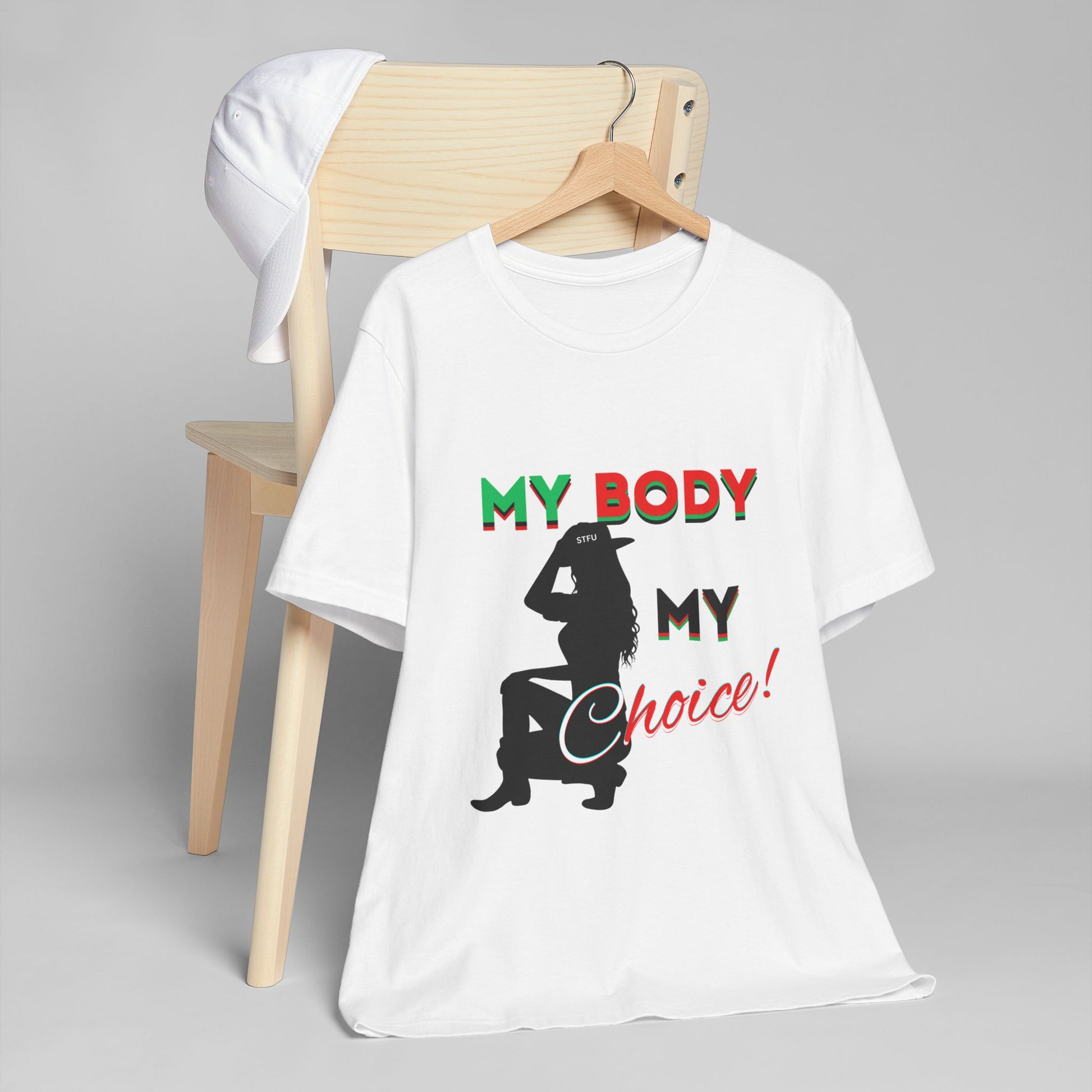 Empowerment takes center stage with this striking "My Body, My Choice" artwork. Featuring the silhouette of a confident woman in a bold stance, paired with vibrant red and green text, this design celebrates autonomy, freedom, and self-expression. The interplay of dynamic fonts and the powerful pose speaks to resilience and individuality, making it perfect for anyone championing personal rights and the strength of choice.