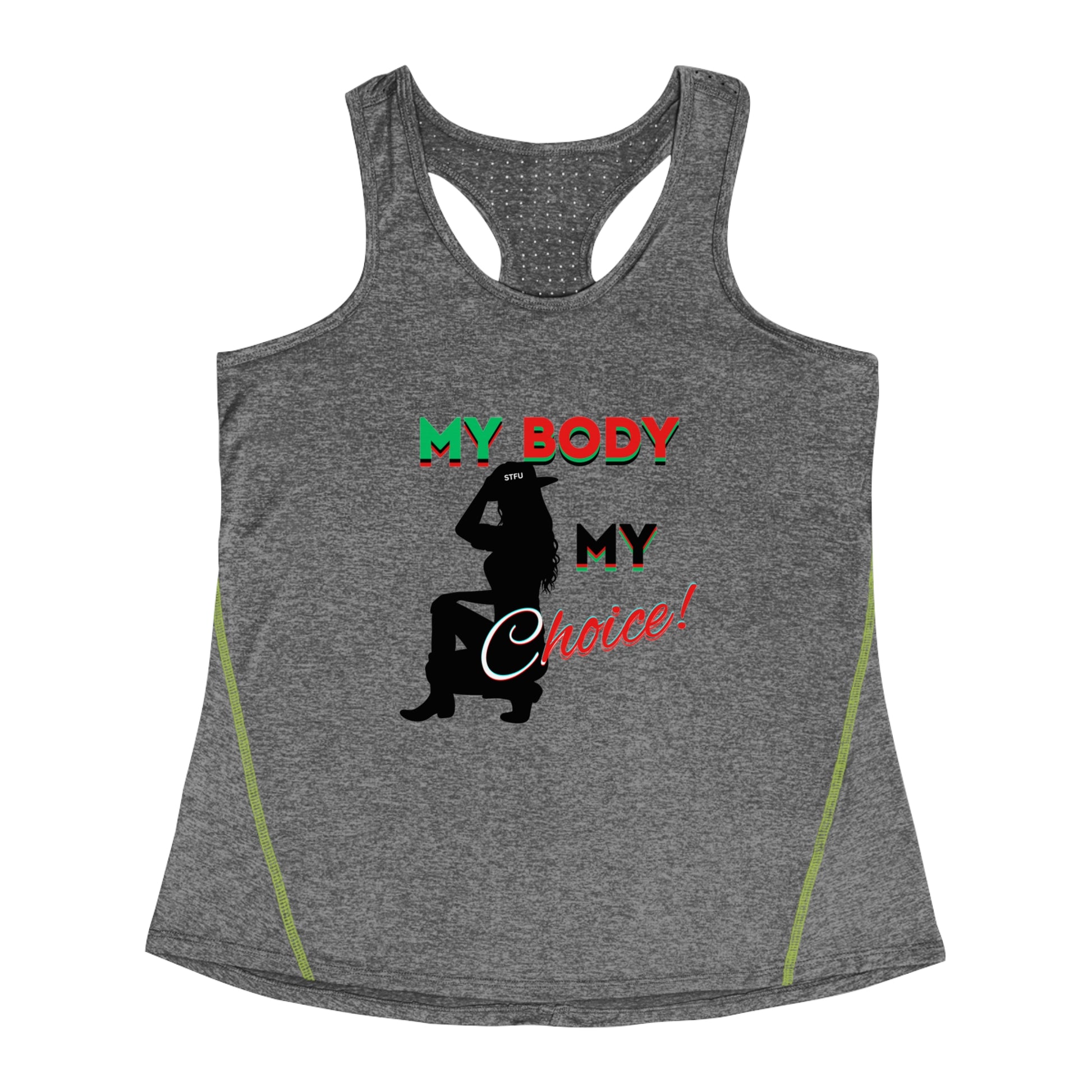 Empowerment takes center stage with this striking "My Body, My Choice" artwork. Featuring the silhouette of a confident woman in a bold stance, paired with vibrant red and green text, this design celebrates autonomy, freedom, and self-expression. The interplay of dynamic fonts and the powerful pose speaks to resilience and individuality, making it perfect for anyone championing personal rights and the strength of choice.