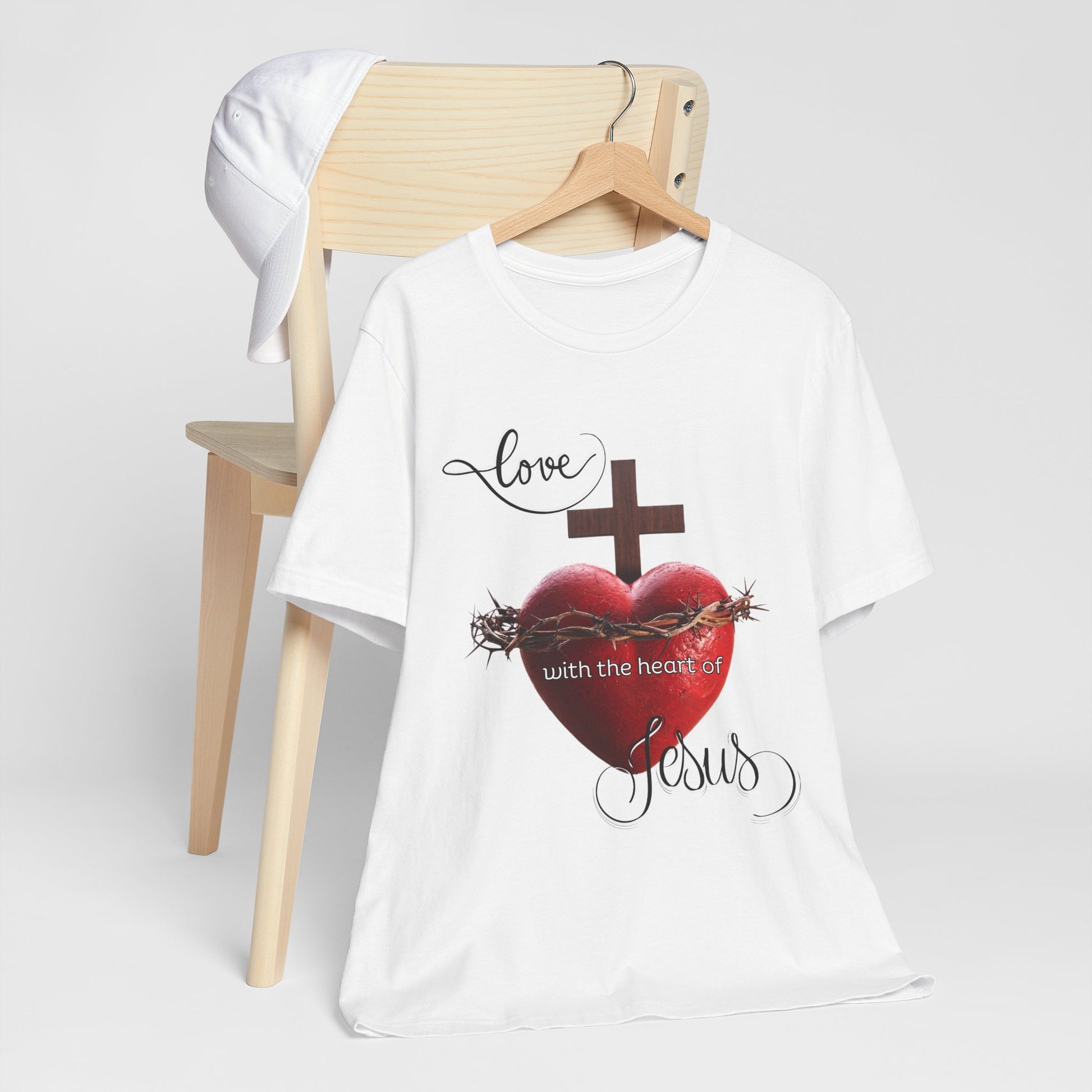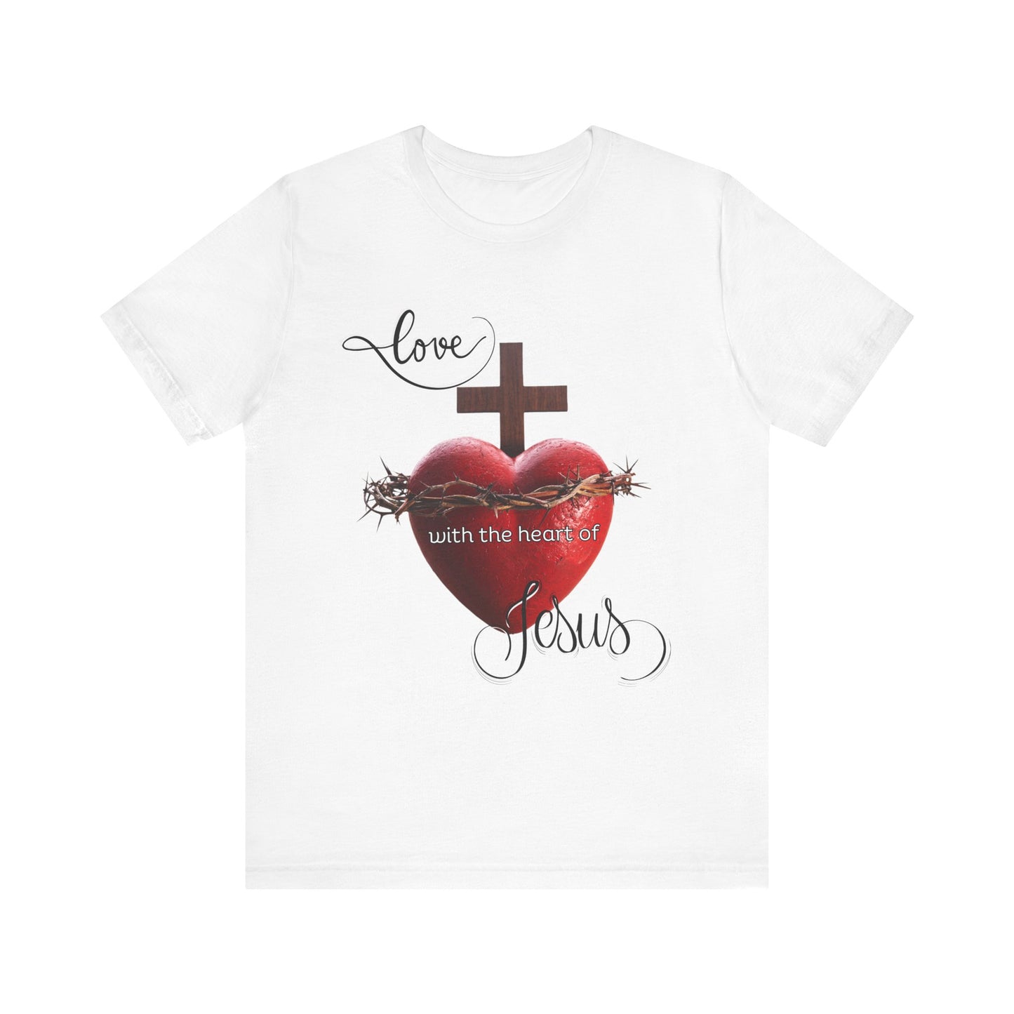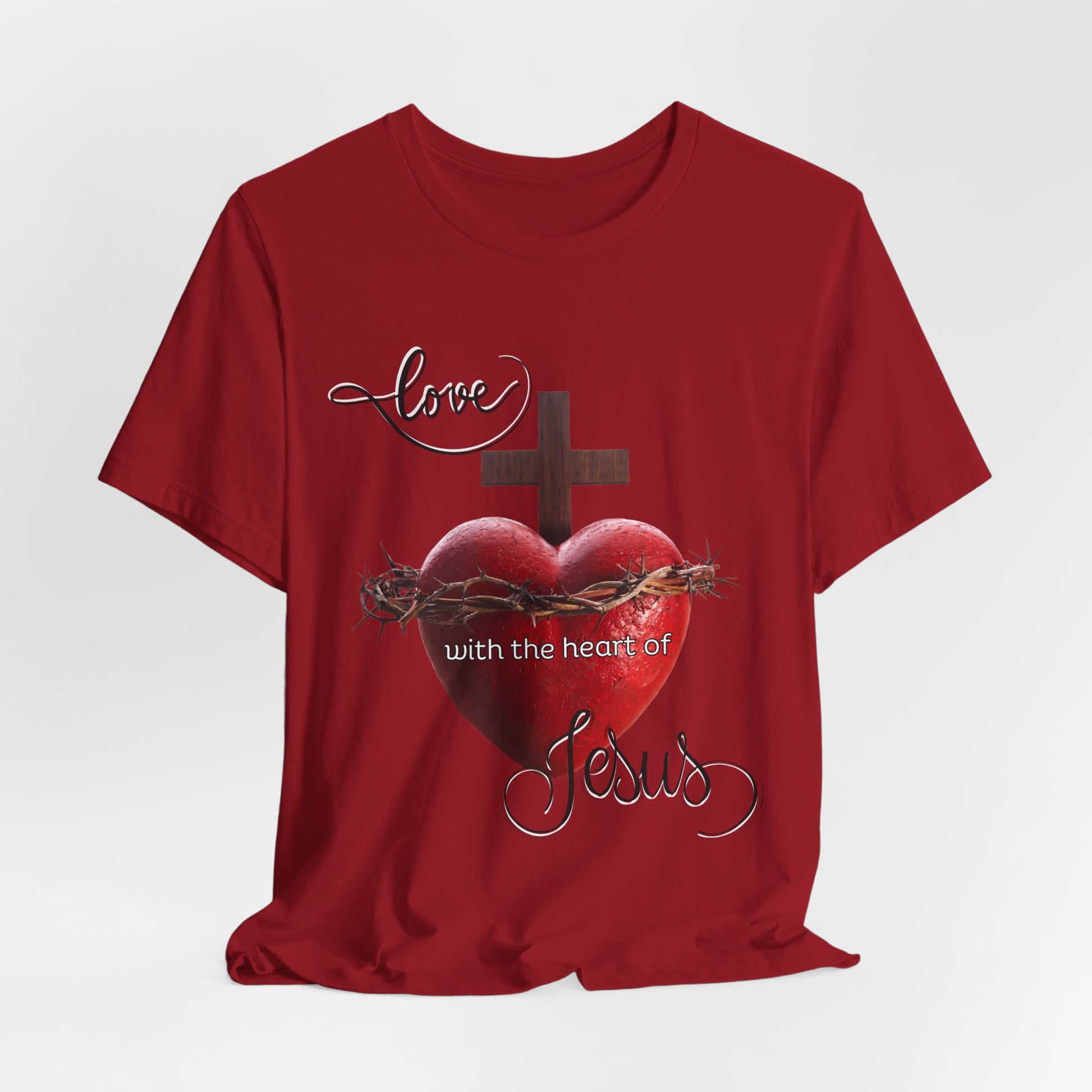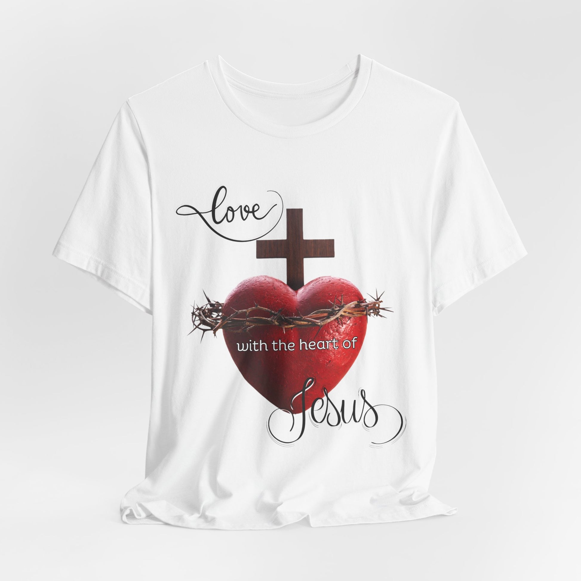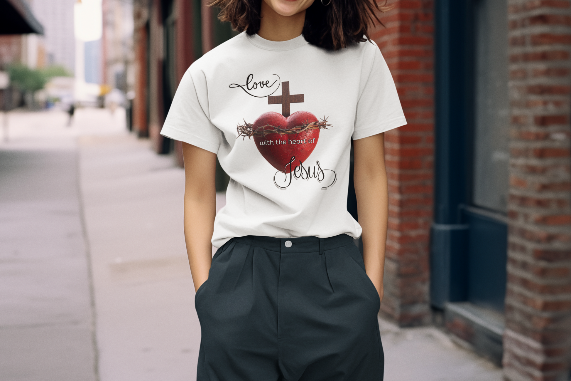 Express your faith and devotion with this powerful "Love with the Heart of Jesus" design. Featuring a striking red heart crowned with thorns and a wooden cross, this image beautifully symbolizes sacrifice, compassion, and unconditional love. The elegant script lettering conveys a message of hope, grace, and spiritual connection.
