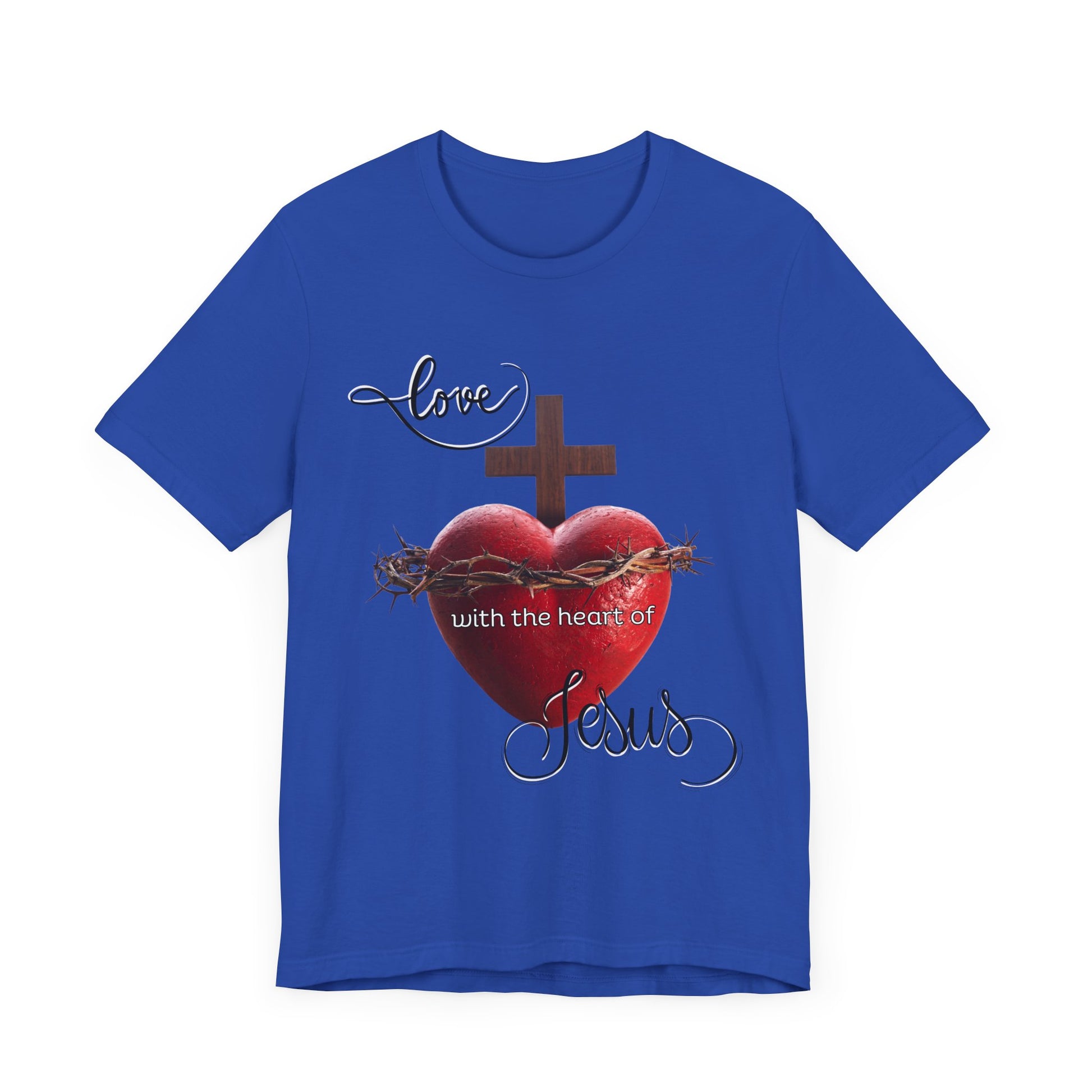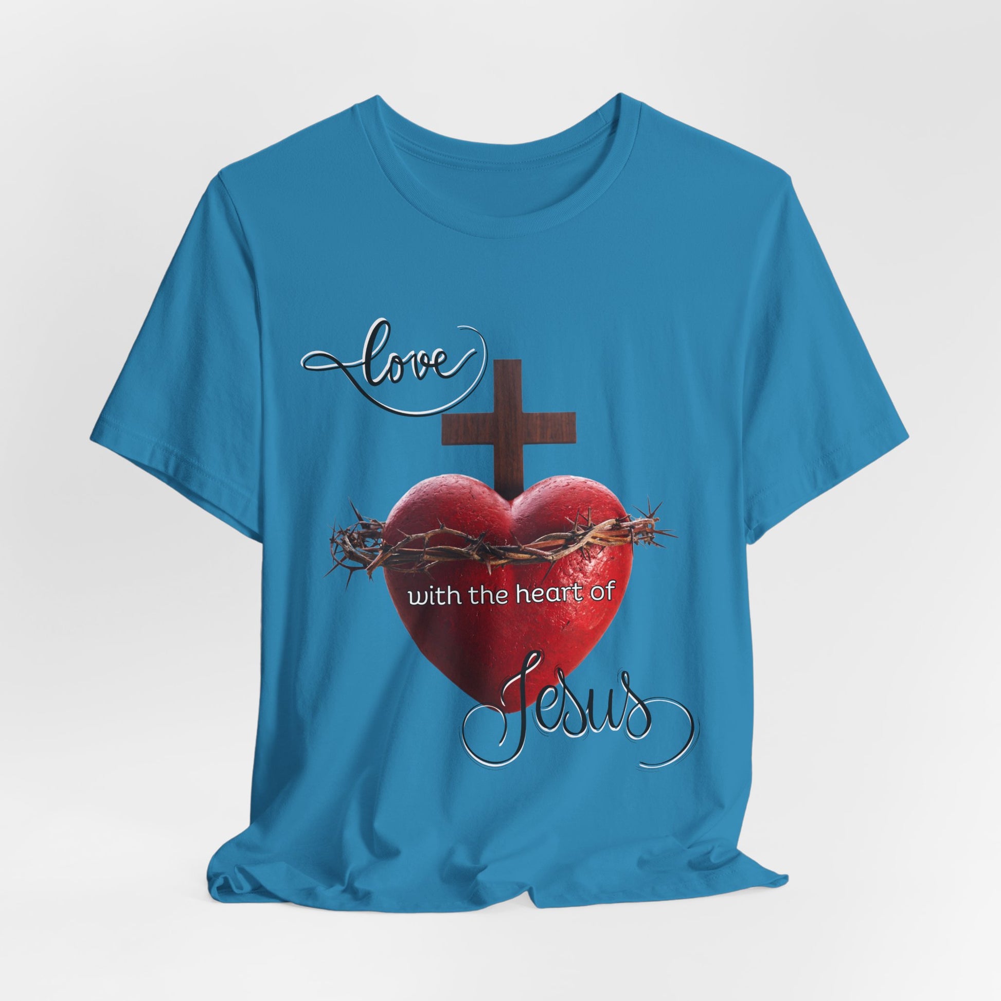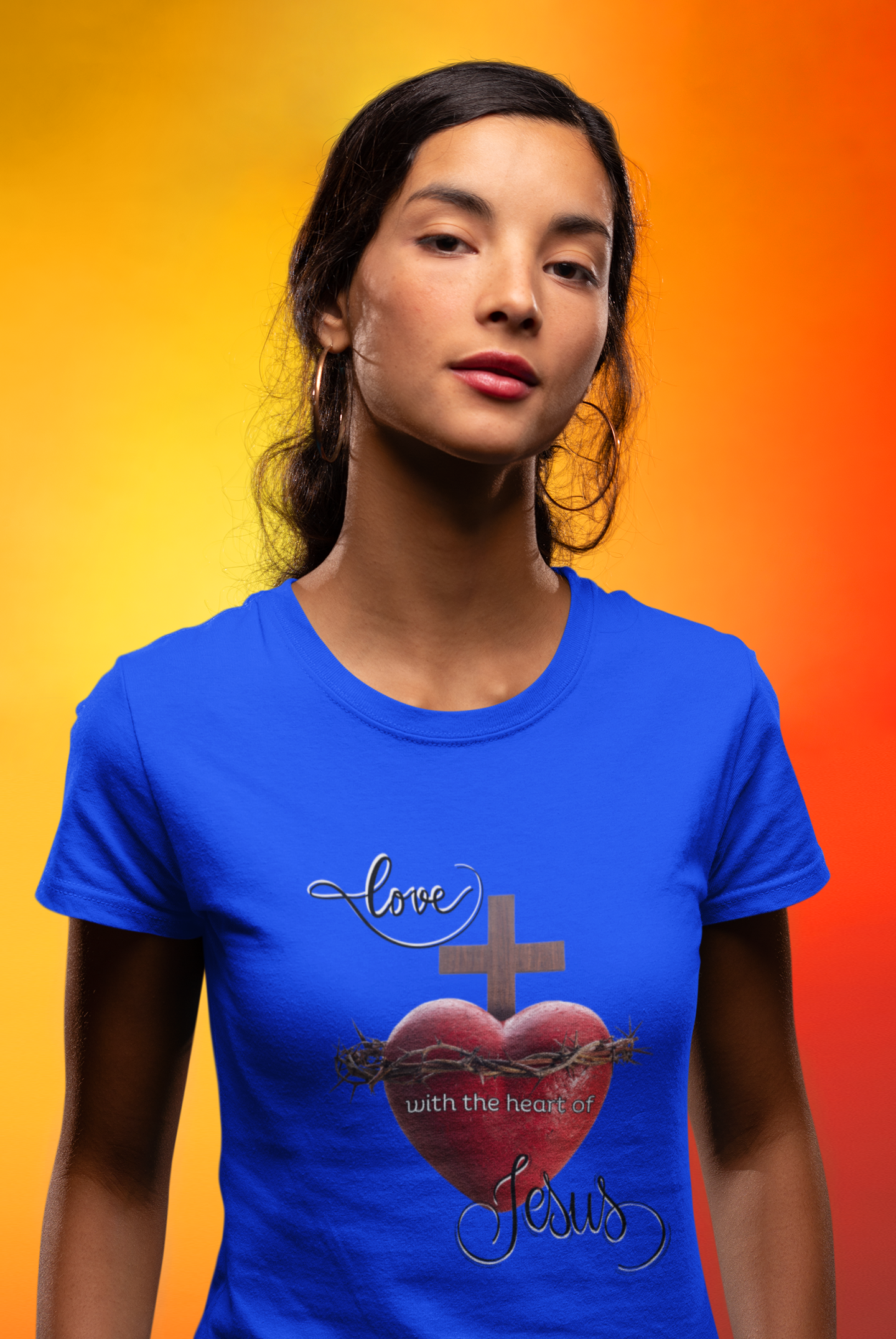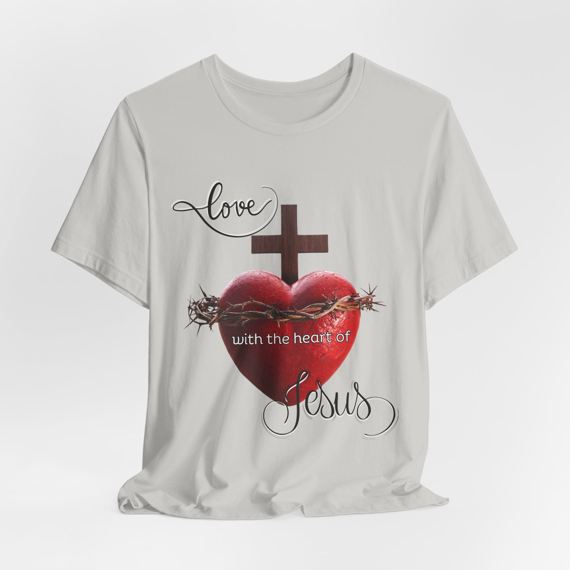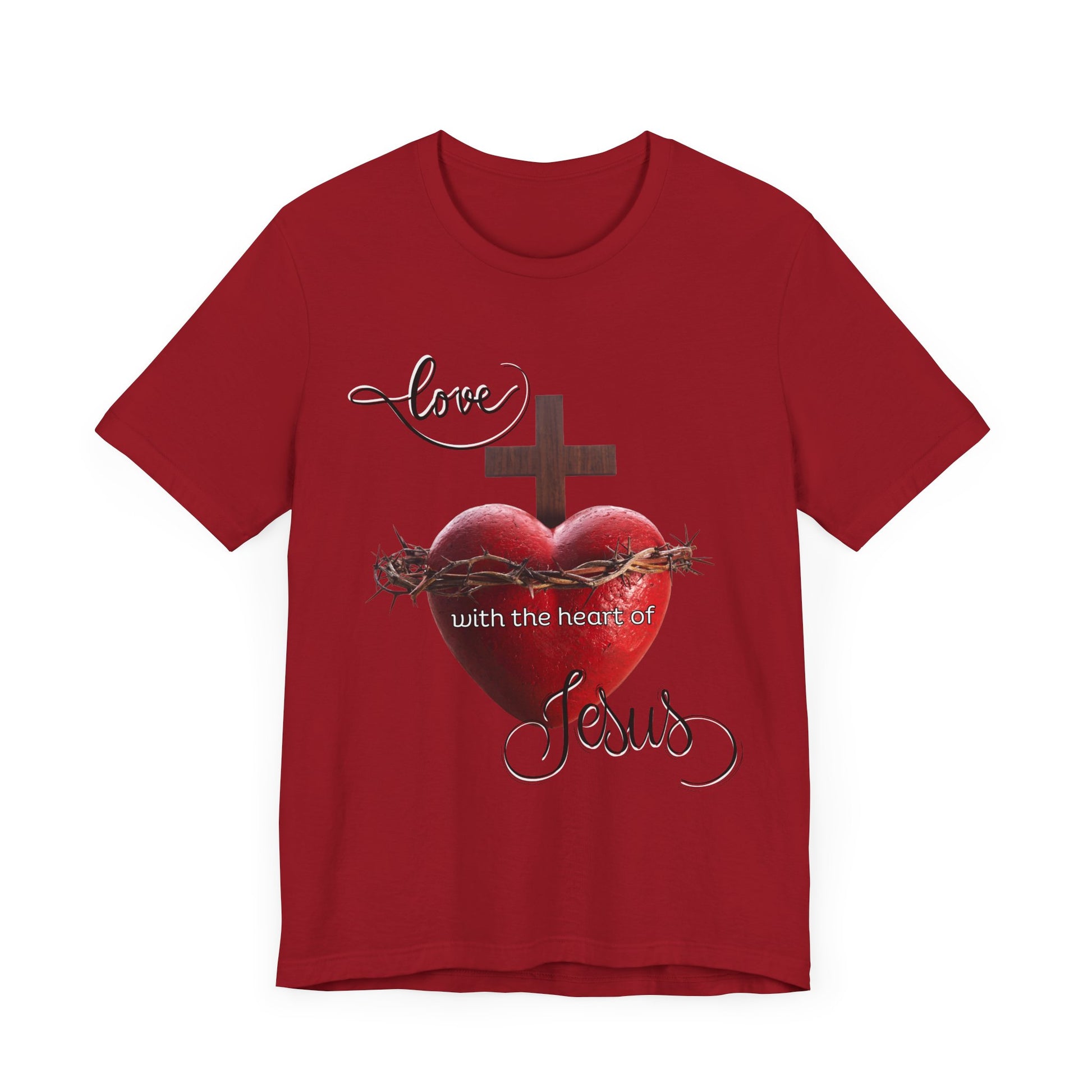 Express your faith and devotion with this powerful "Love with the Heart of Jesus" design. Featuring a striking red heart crowned with thorns and a wooden cross, this image beautifully symbolizes sacrifice, compassion, and unconditional love. The elegant script lettering conveys a message of hope, grace, and spiritual connection.