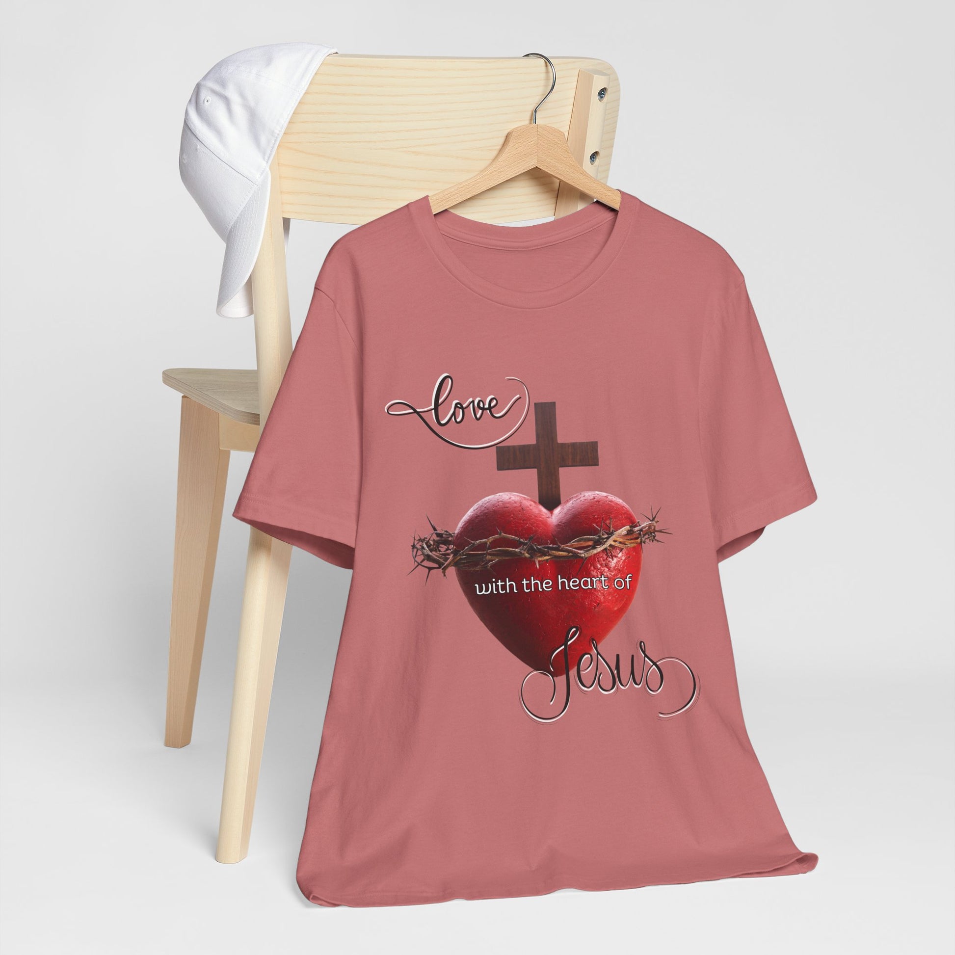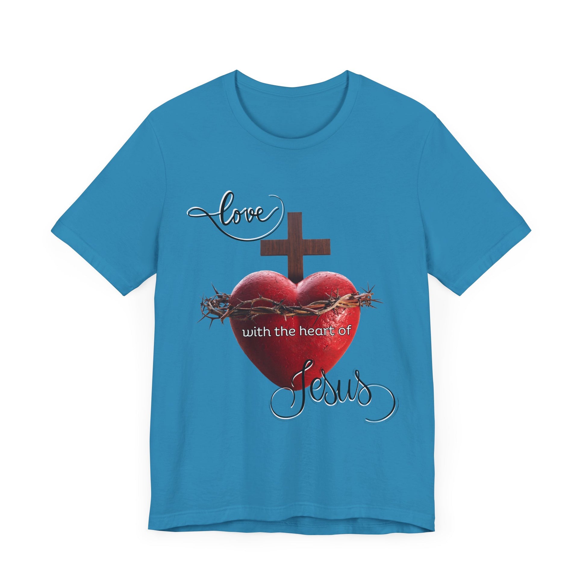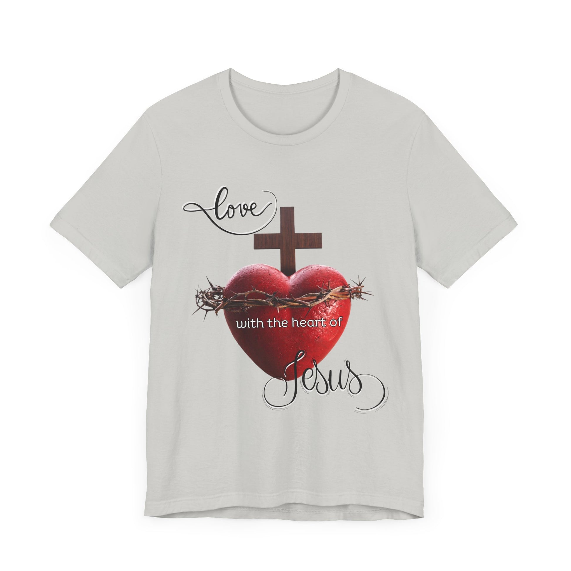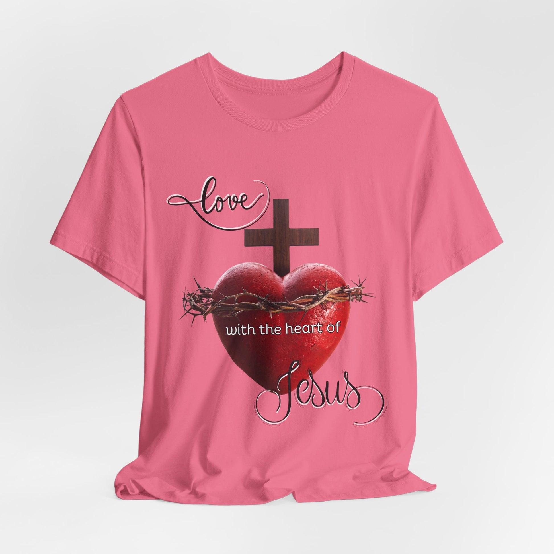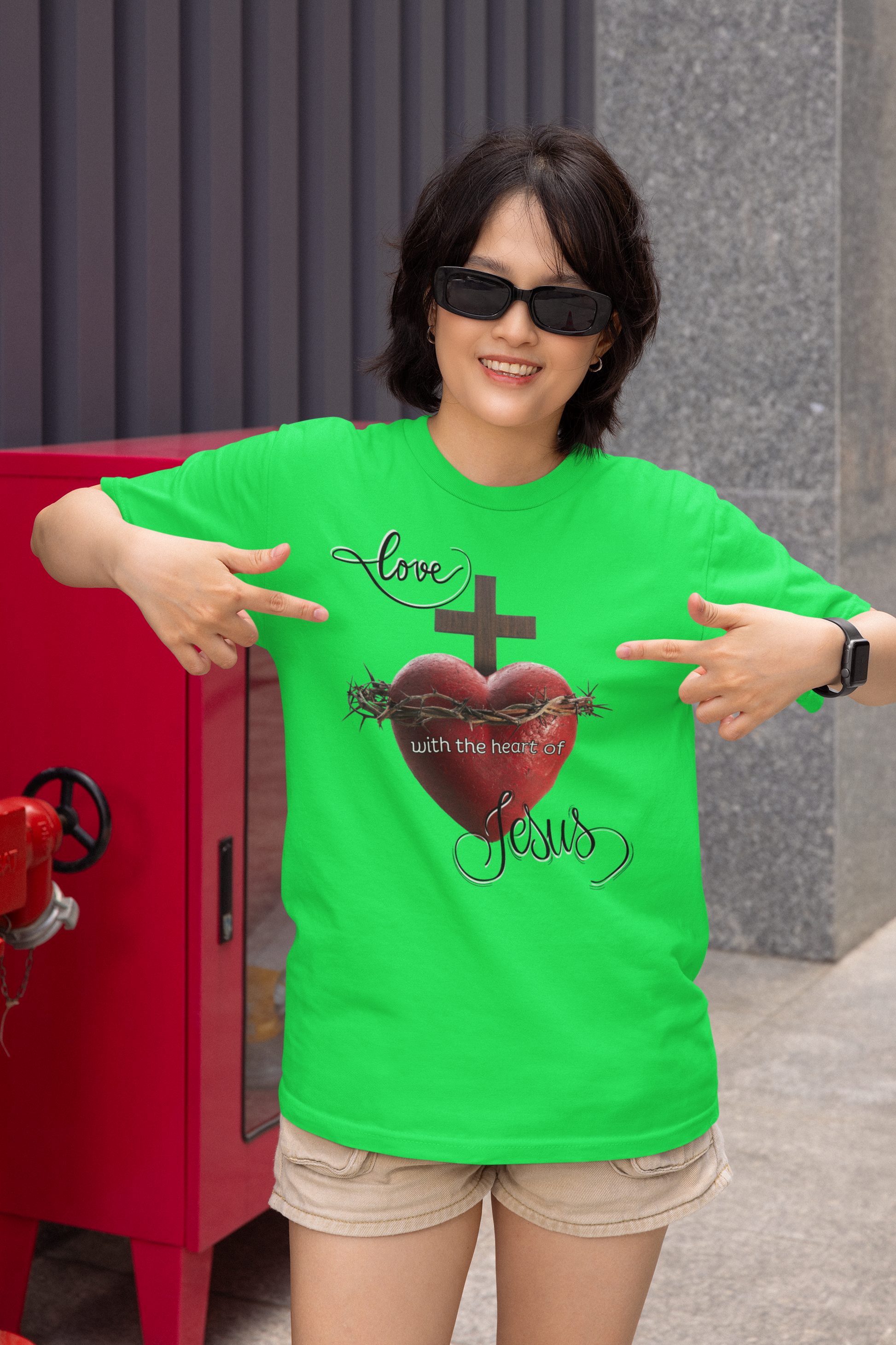 Express your faith and devotion with this powerful "Love with the Heart of Jesus" design. Featuring a striking red heart crowned with thorns and a wooden cross, this image beautifully symbolizes sacrifice, compassion, and unconditional love. The elegant script lettering conveys a message of hope, grace, and spiritual connection.