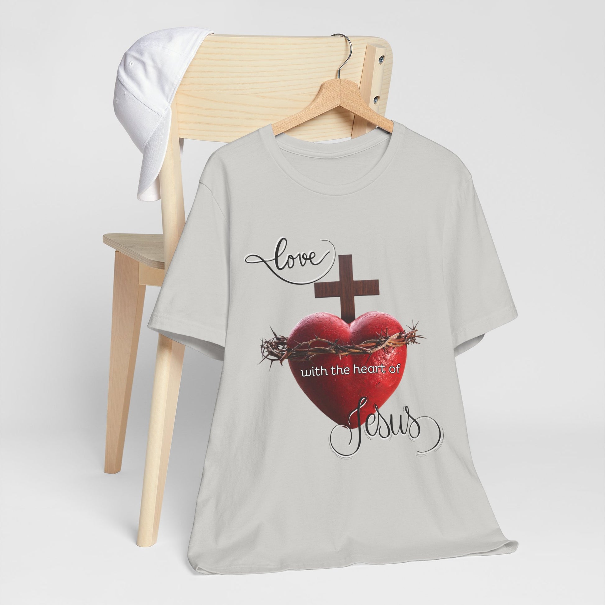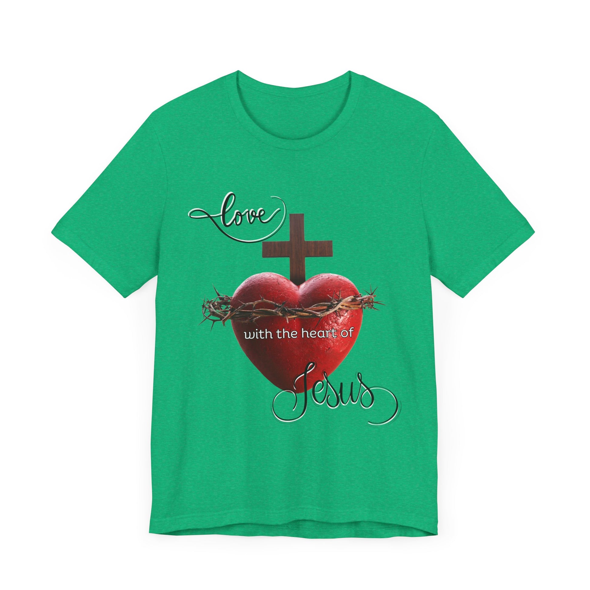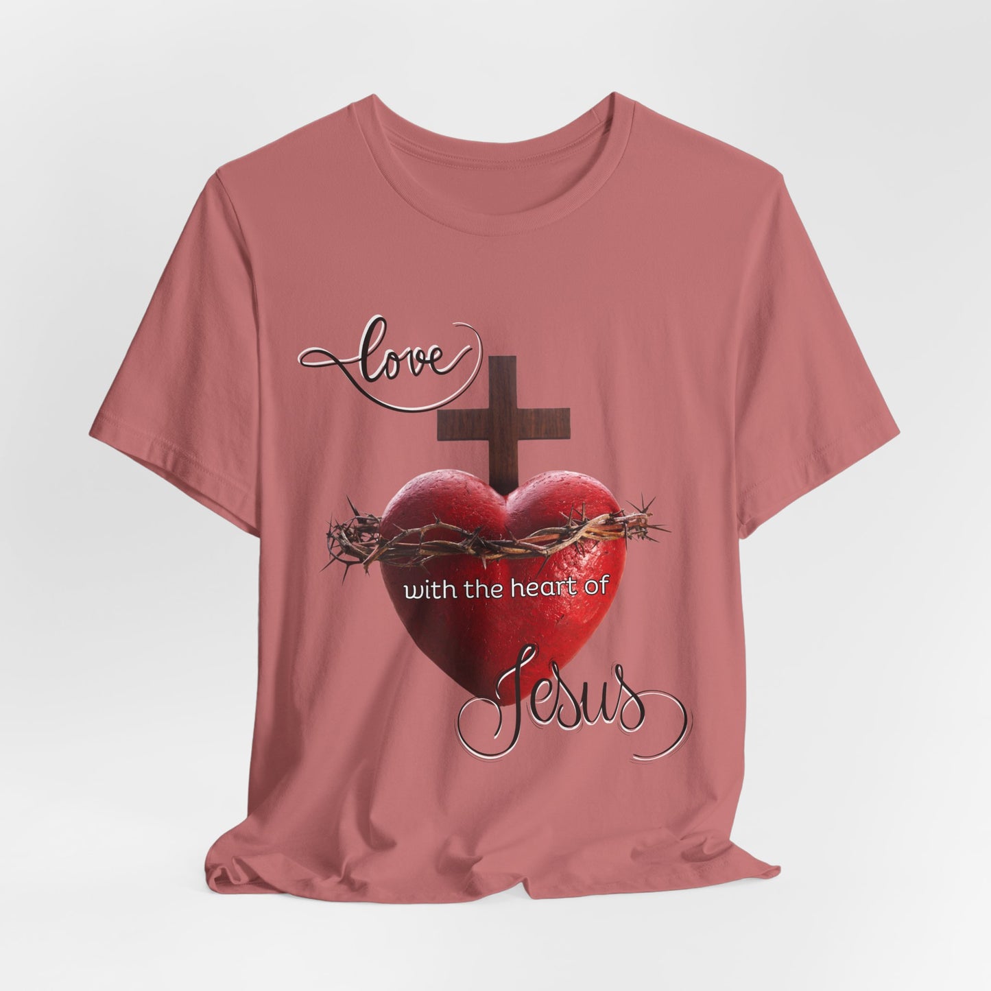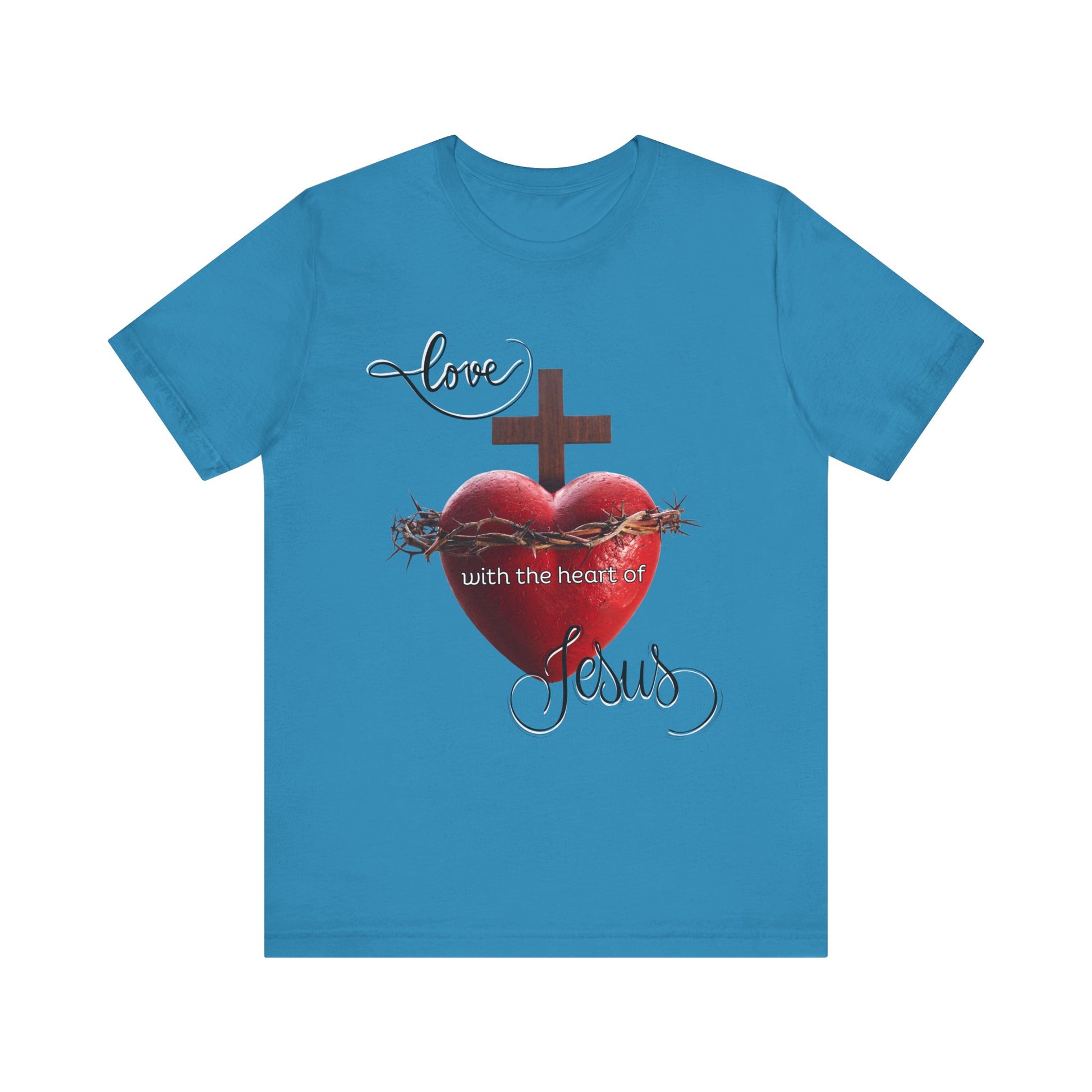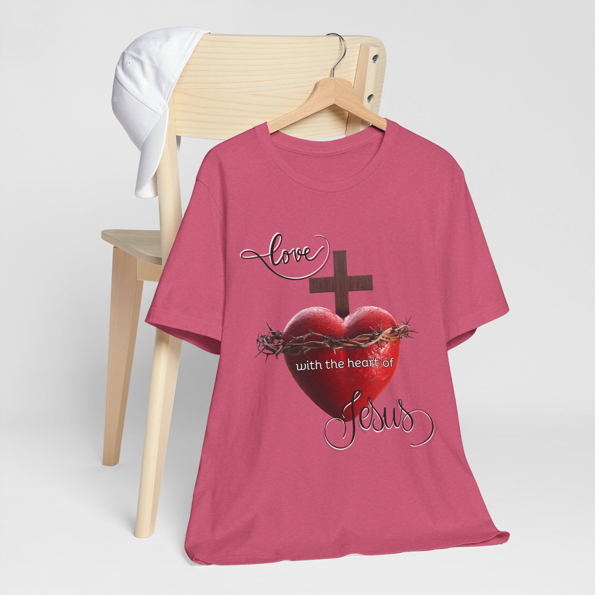 Express your faith and devotion with this powerful "Love with the Heart of Jesus" design. Featuring a striking red heart crowned with thorns and a wooden cross, this image beautifully symbolizes sacrifice, compassion, and unconditional love. The elegant script lettering conveys a message of hope, grace, and spiritual connection.