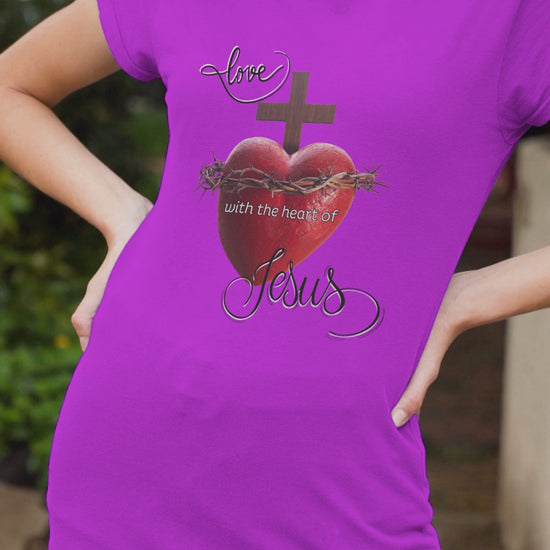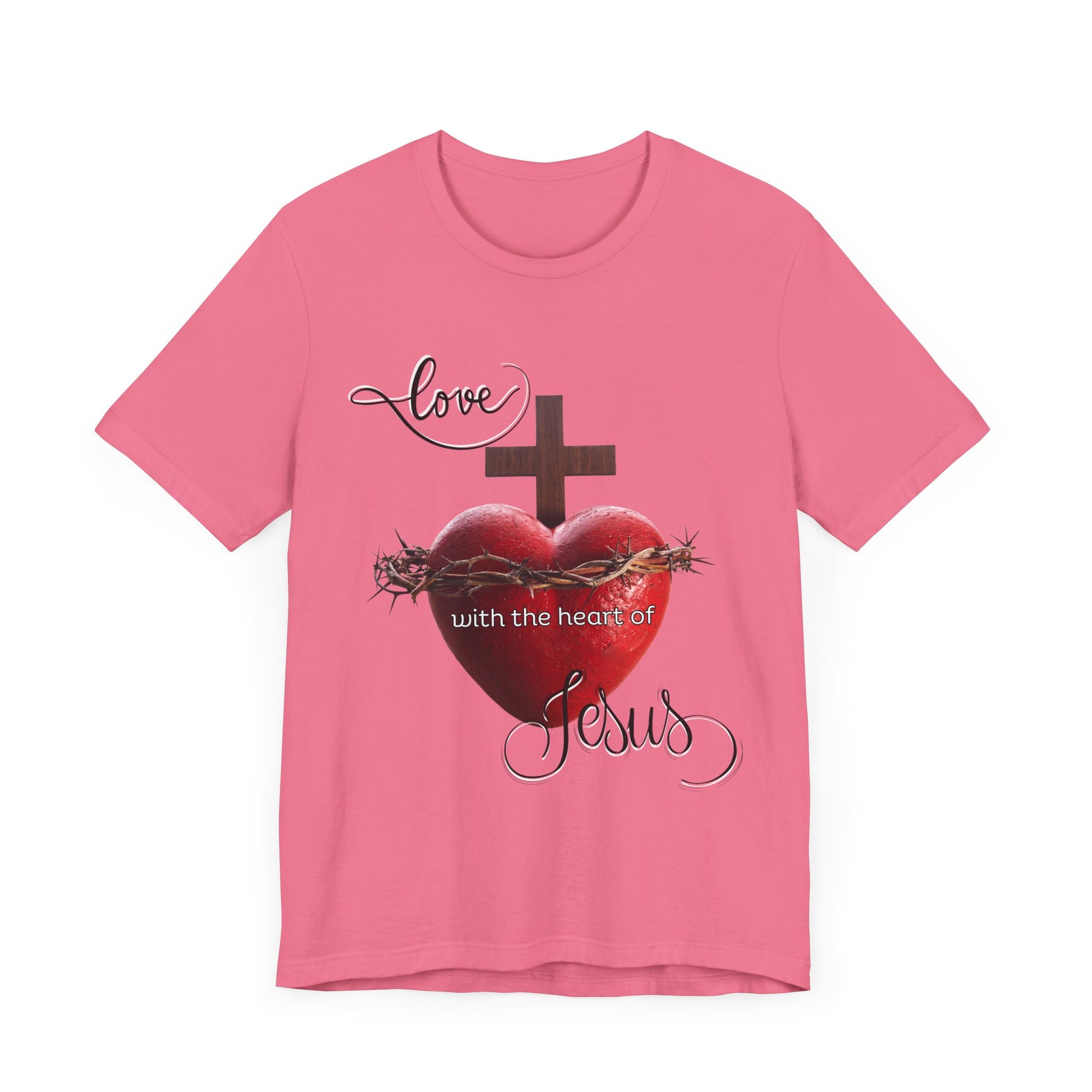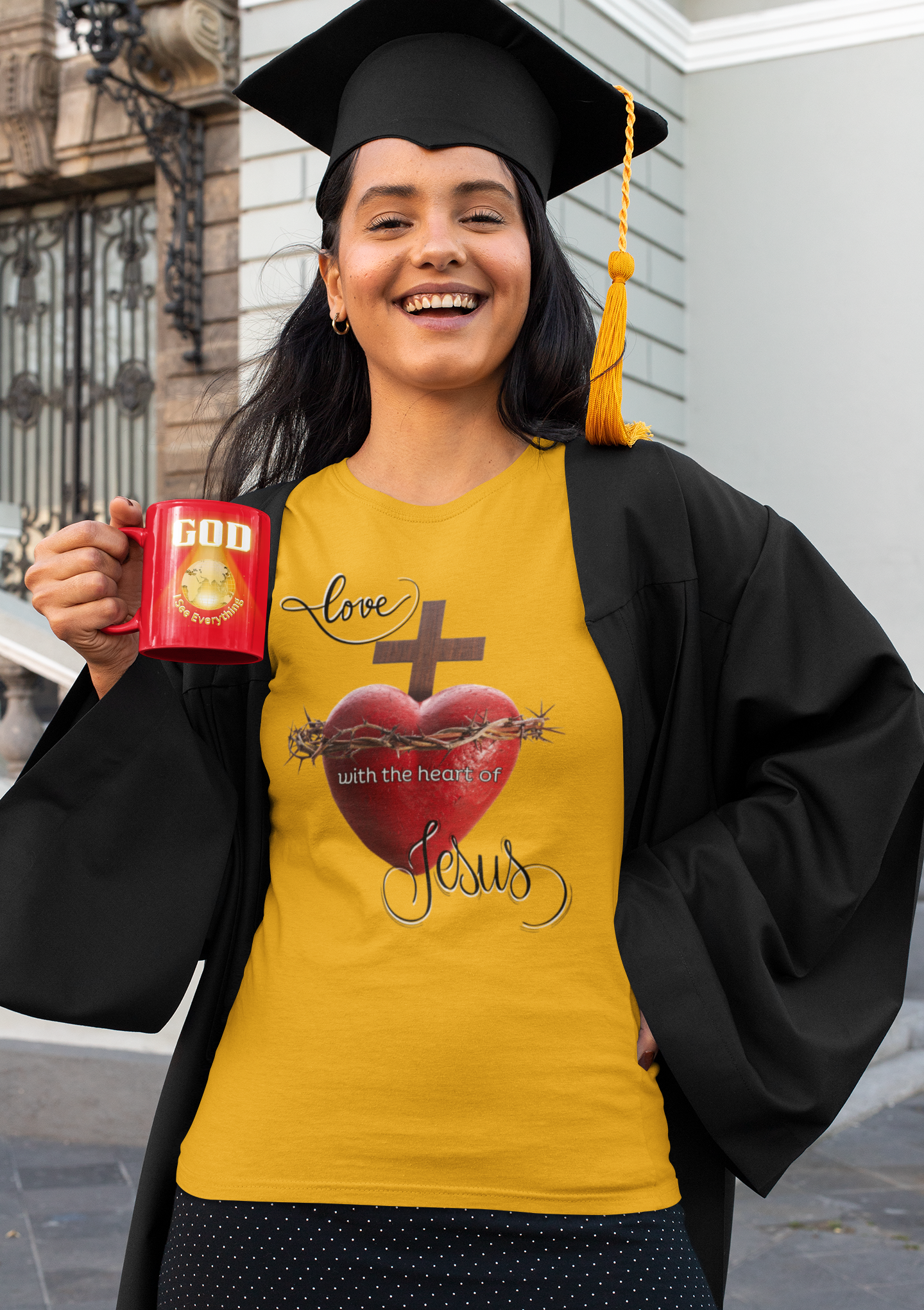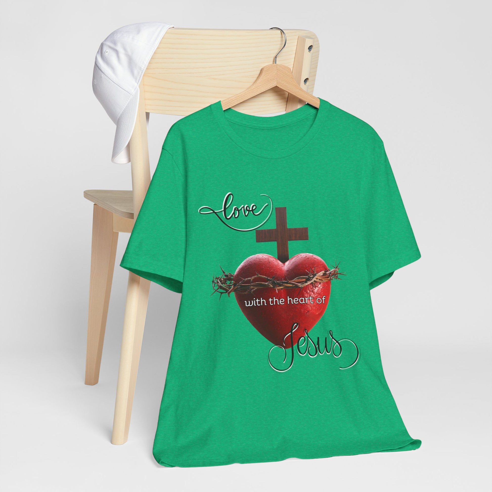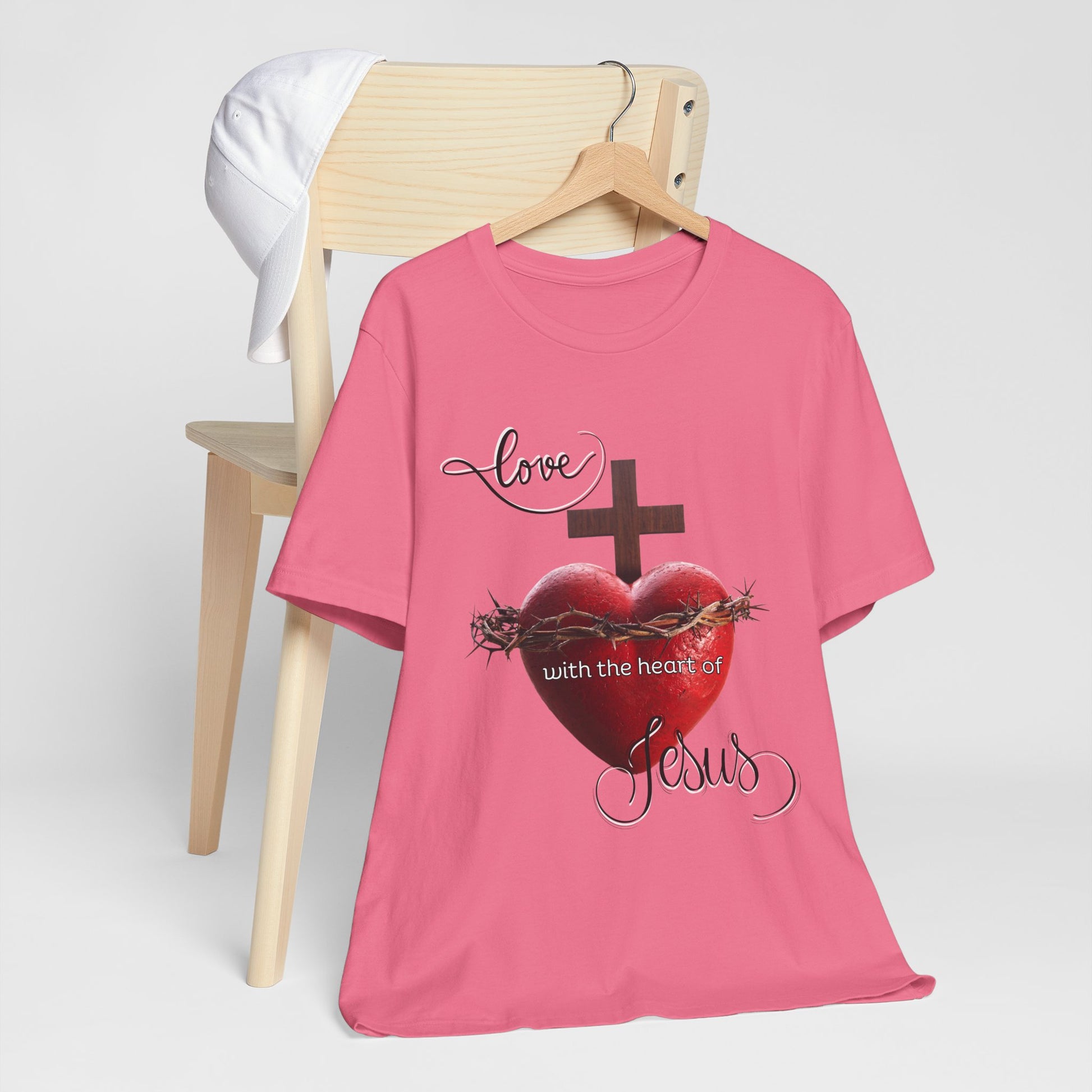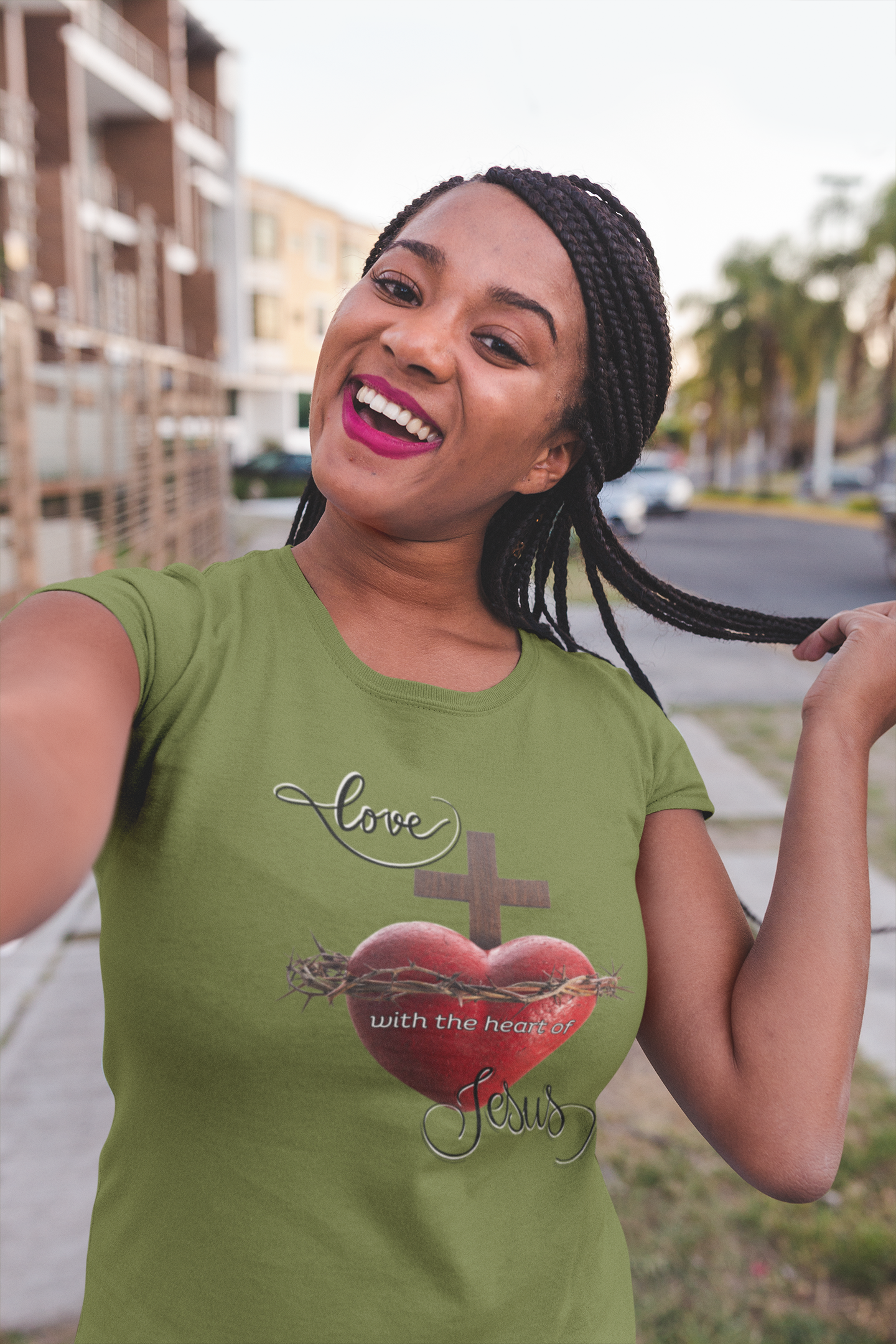 Express your faith and devotion with this powerful "Love with the Heart of Jesus" design. Featuring a striking red heart crowned with thorns and a wooden cross, this image beautifully symbolizes sacrifice, compassion, and unconditional love. The elegant script lettering conveys a message of hope, grace, and spiritual connection.