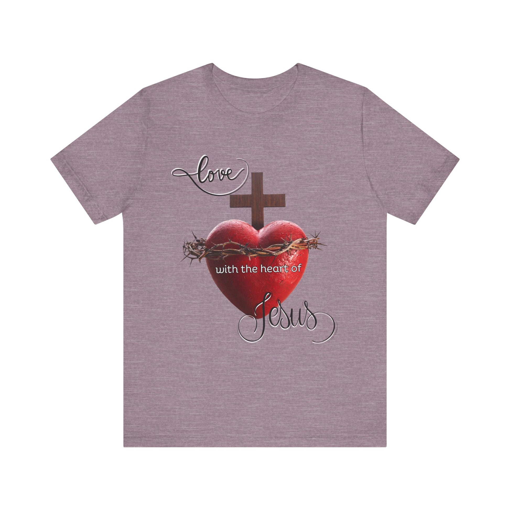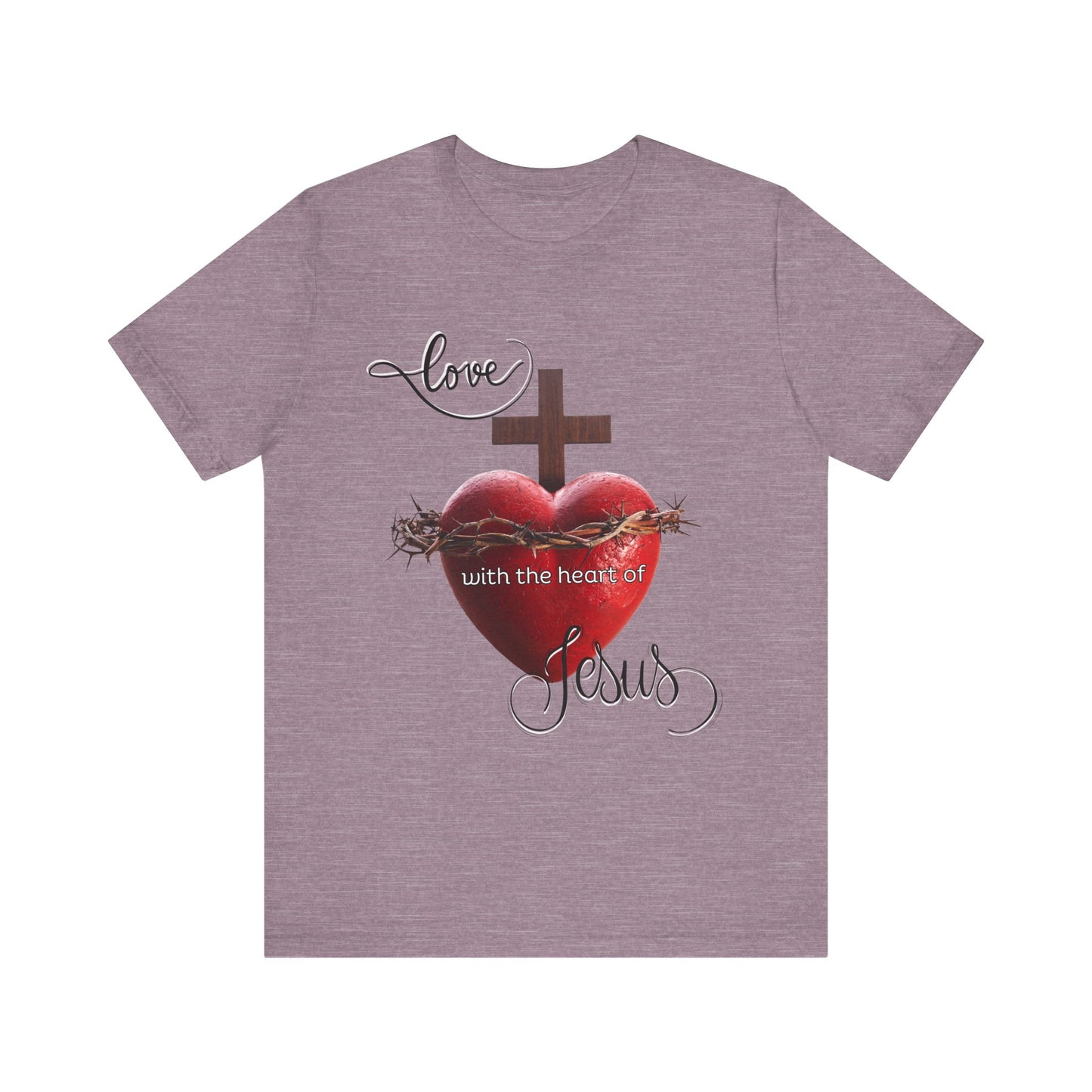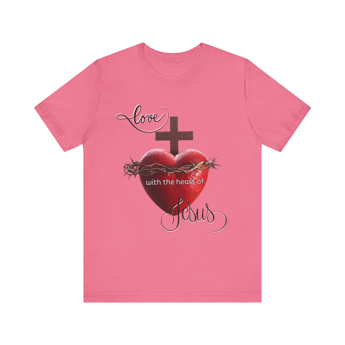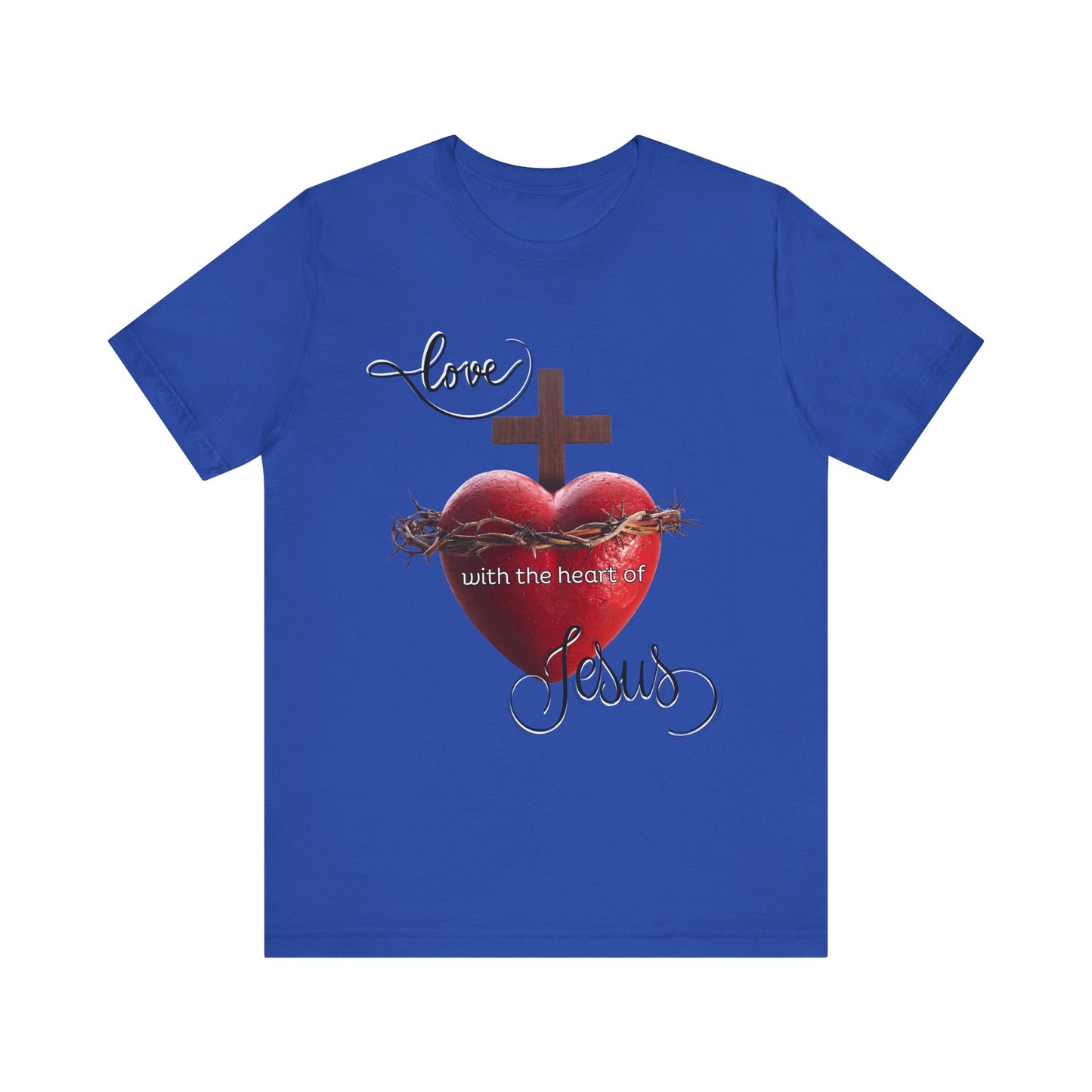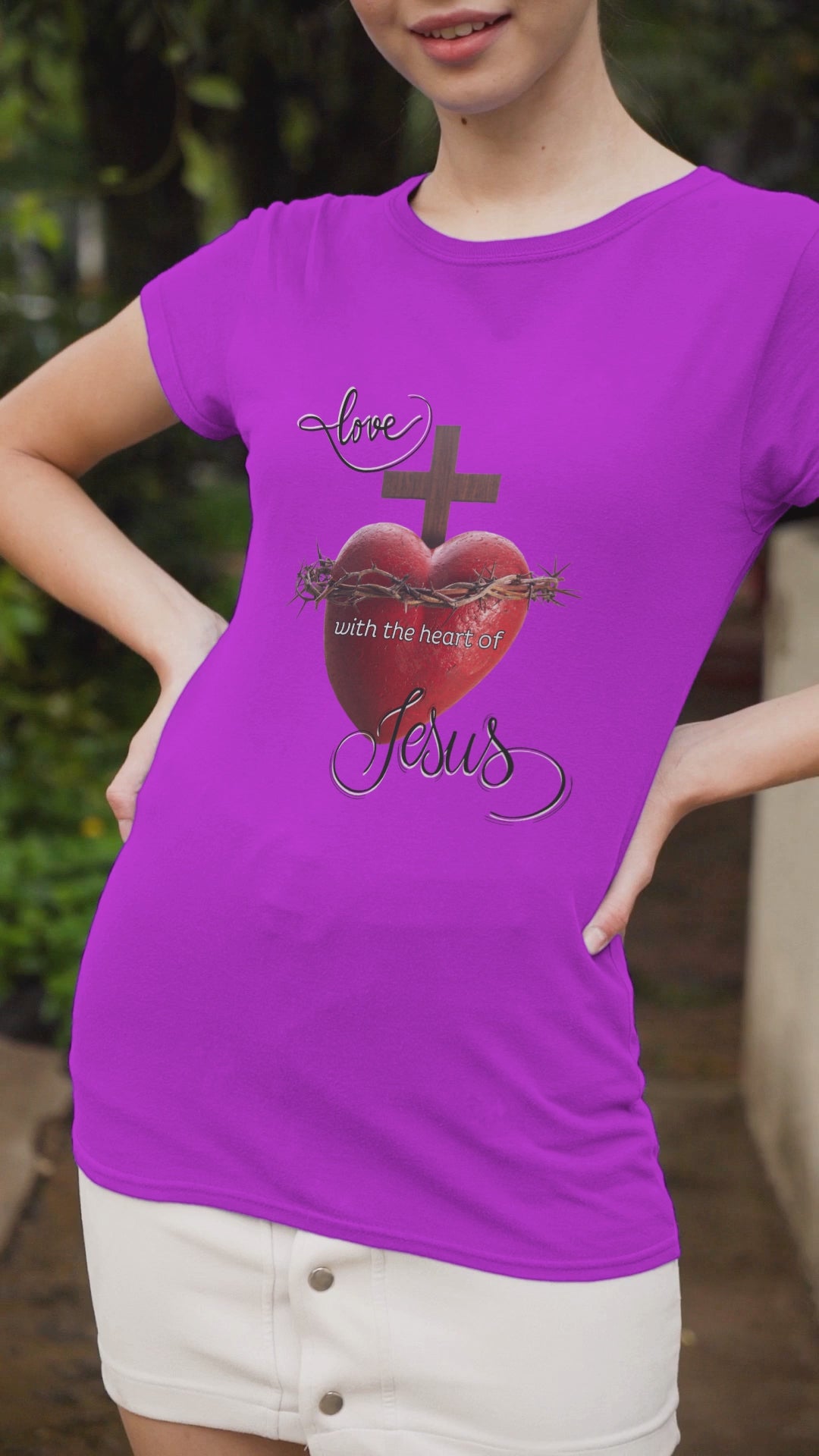 Express your faith and devotion with this powerful "Love with the Heart of Jesus" design. Featuring a striking red heart crowned with thorns and a wooden cross, this image beautifully symbolizes sacrifice, compassion, and unconditional love. The elegant script lettering conveys a message of hope, grace, and spiritual connection.
