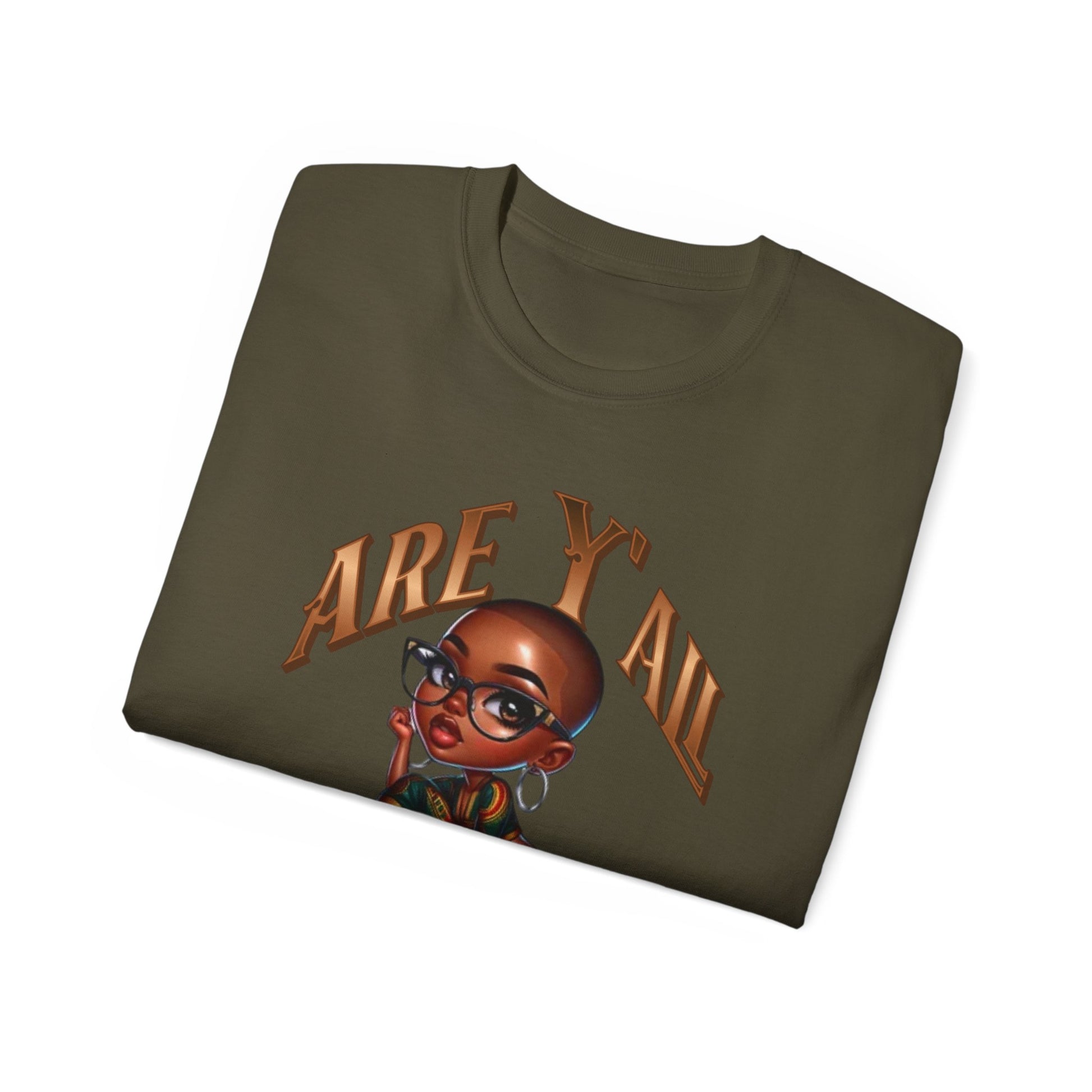This design features a stylish, animated Black woman with a shaved head, large glasses, and a patterned outfit, posing a sassy question: "ARE Y'ALL OKAY?" The playful yet questioning tone is delivered with a confident, slightly skeptical expression, making it perfect for those moments when you need to check in on others with a bit of humor. The character's trendy attire and pose add a modern, relatable touch, making this design a fun conversation starter.