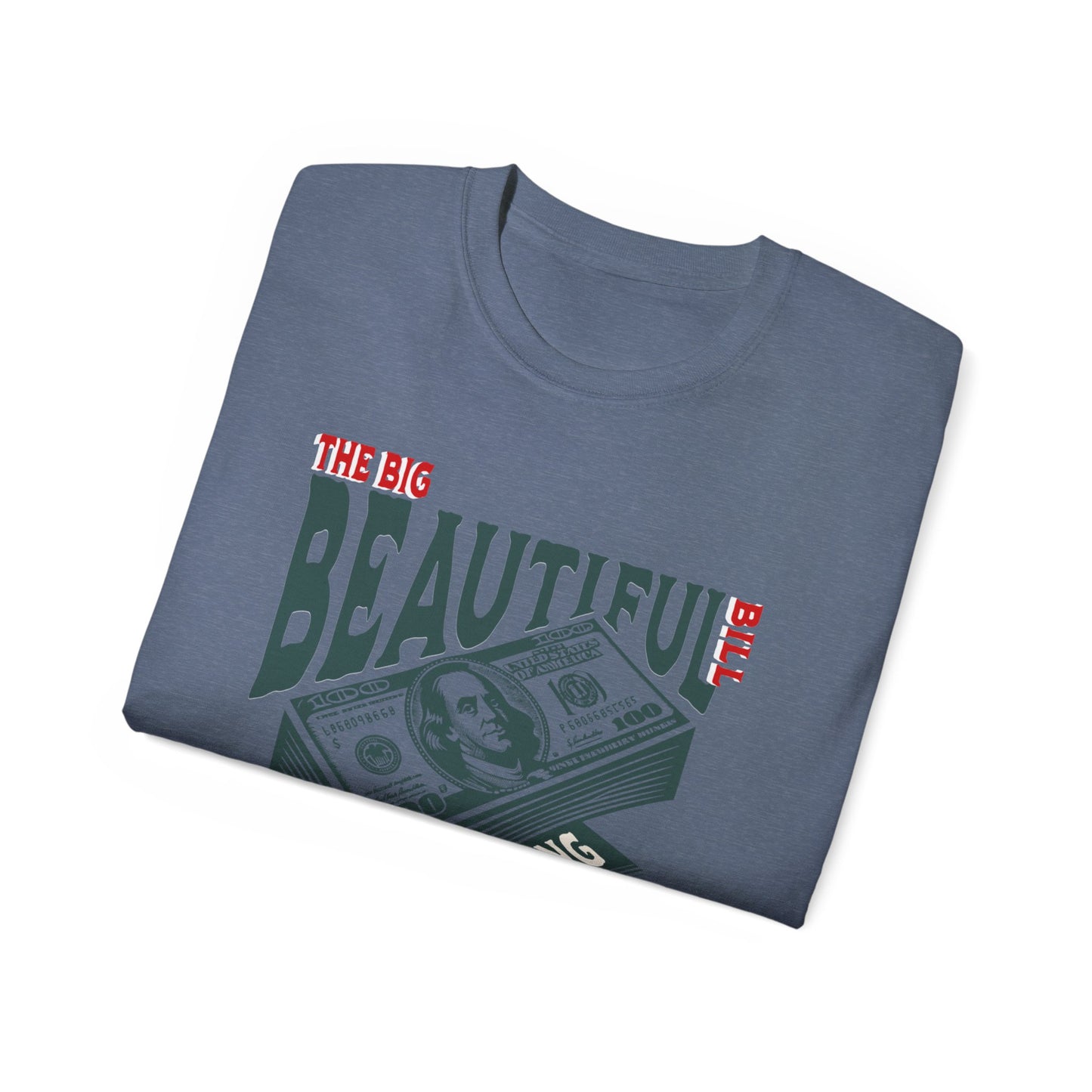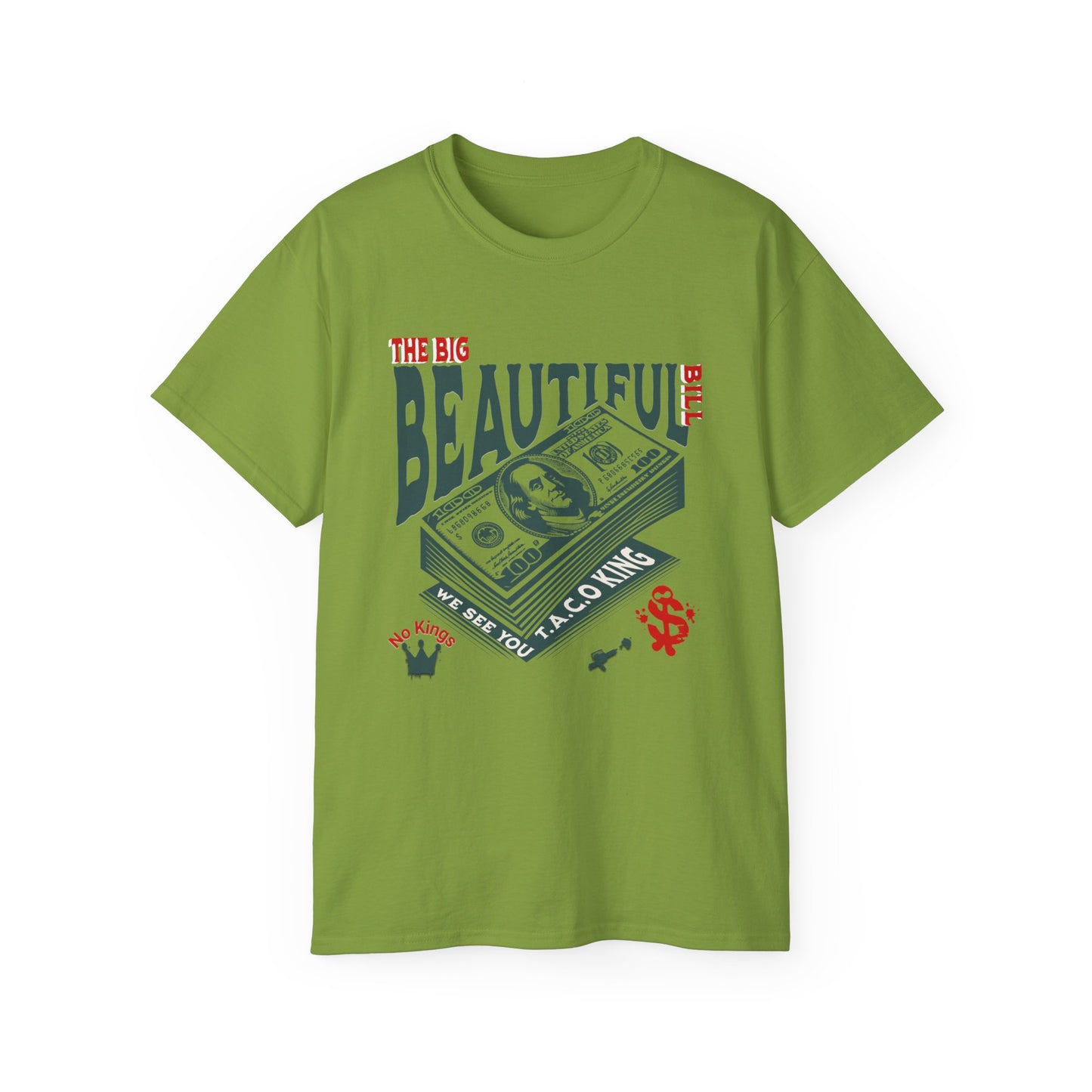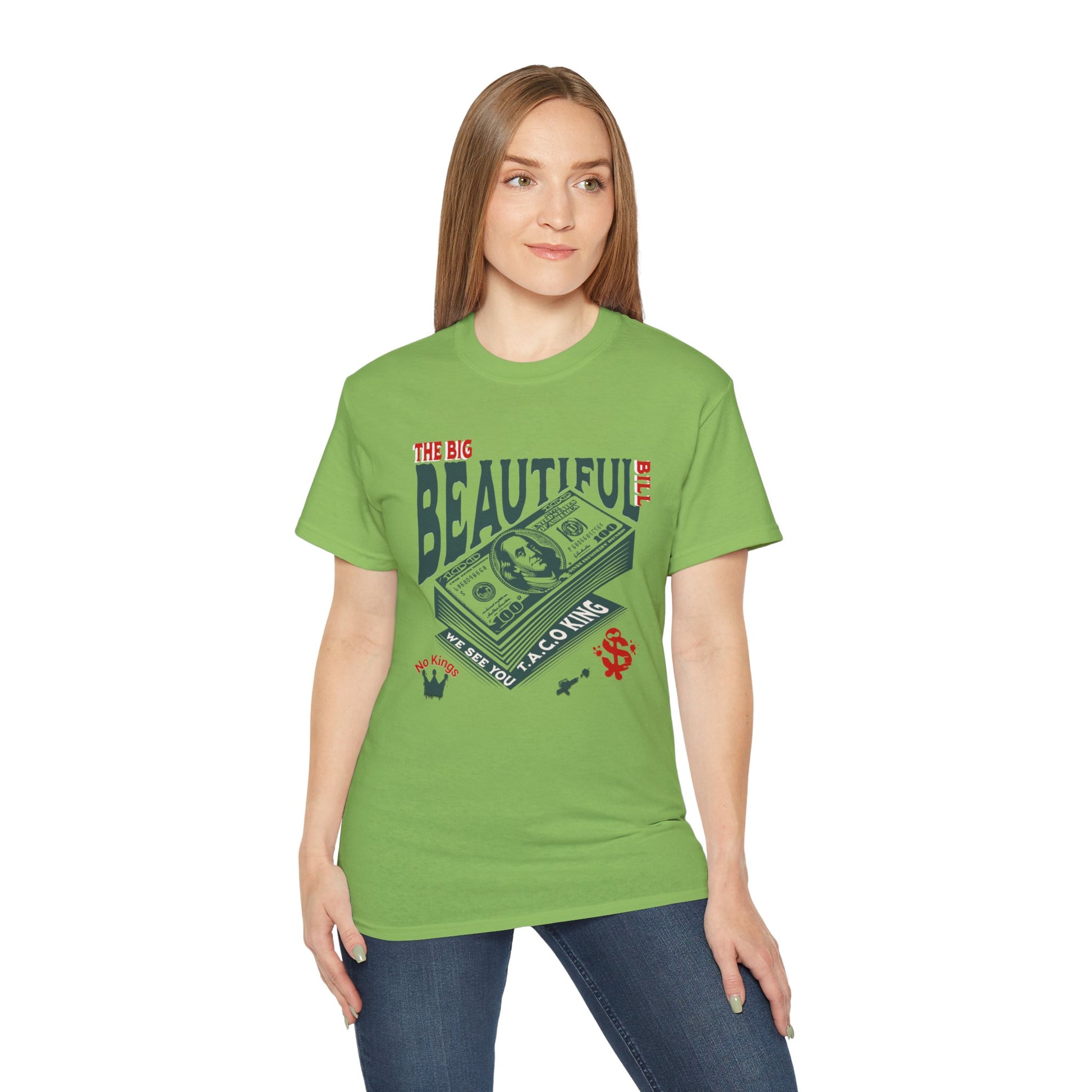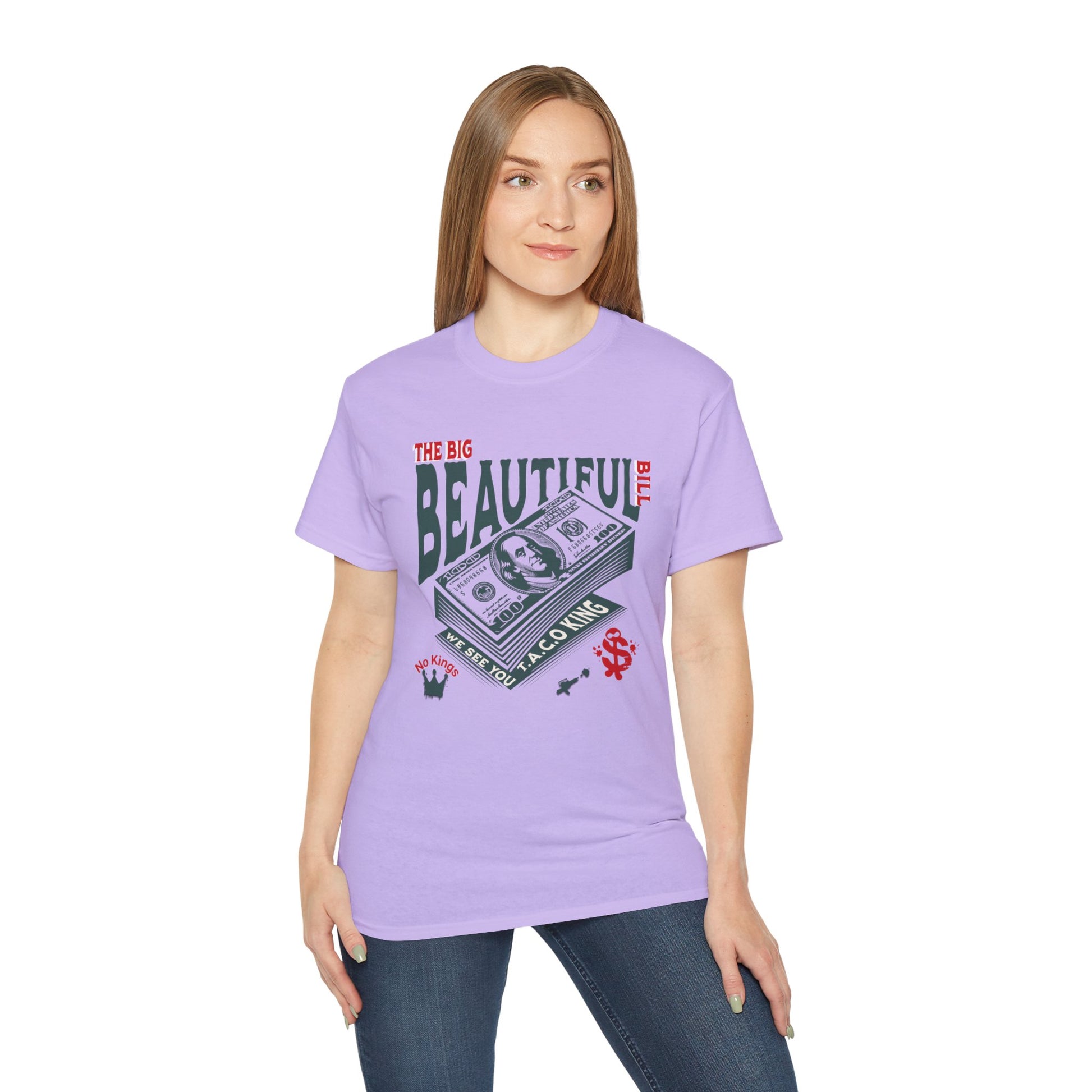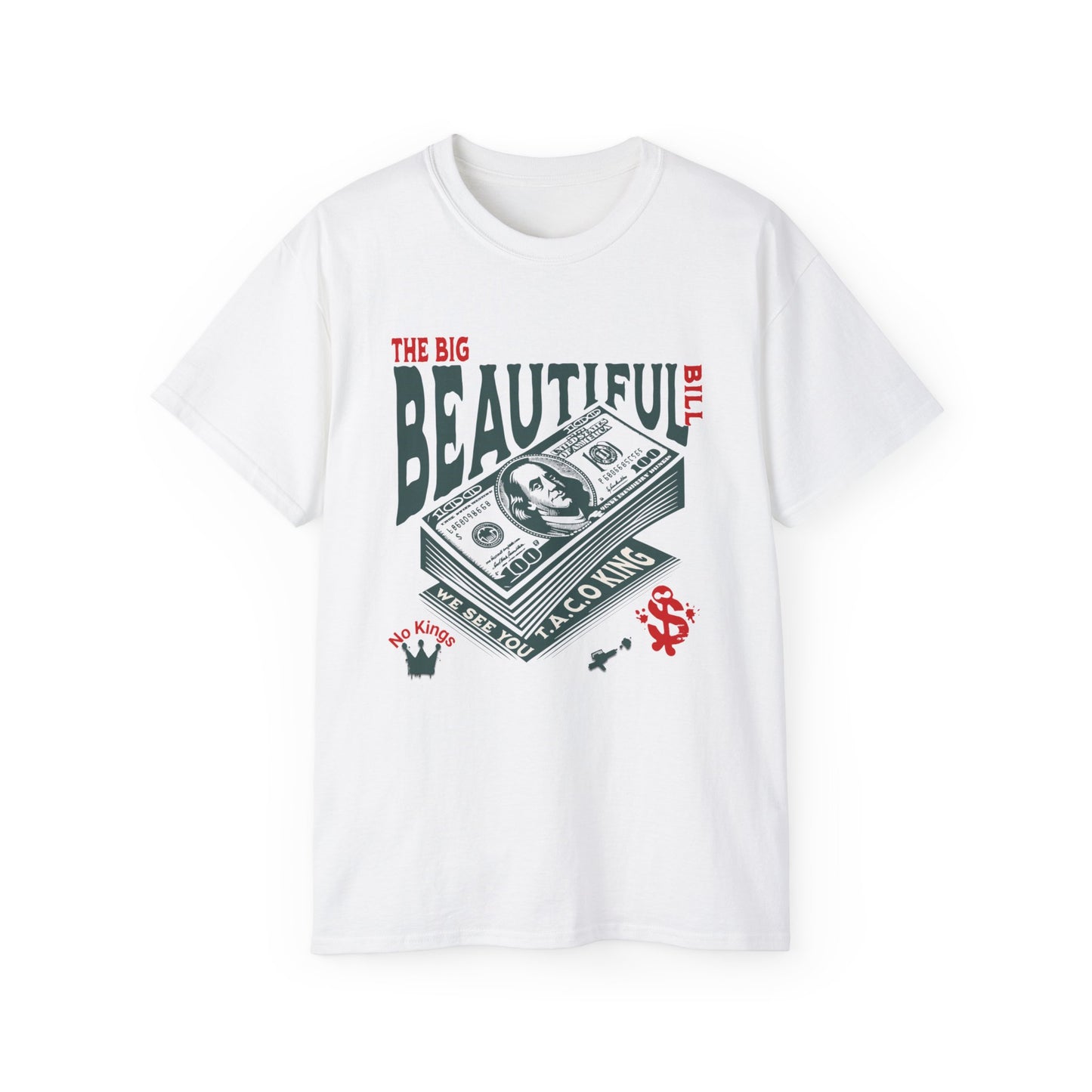 Introducing our "Big Beautiful Bill", TACO Donald Unisex Ultra Cotton Tee, a stylish and comfortable addition to any wardrobe. This eye-catching tee is designed with a vibrant graphic that radiates fun and positivity, making it perfect for casual outings or laid-back gatherings with friends. Imagine slipping into this soft tee and instantly enhancing your mood! With its classic fit and versatile design, it can effortlessly transition from day to night, making it a favorite choice for fashion-forward individuals of all ages. Ideal for gifting during holidays or special occasions like no kings and no hands protest, birthdays, celebrations, or just because, this tee fits seamlessly into anyone's lifestyle. Whether you're dressing it up with accessories or keeping it simple, this tee will become a staple in your wardrobe!