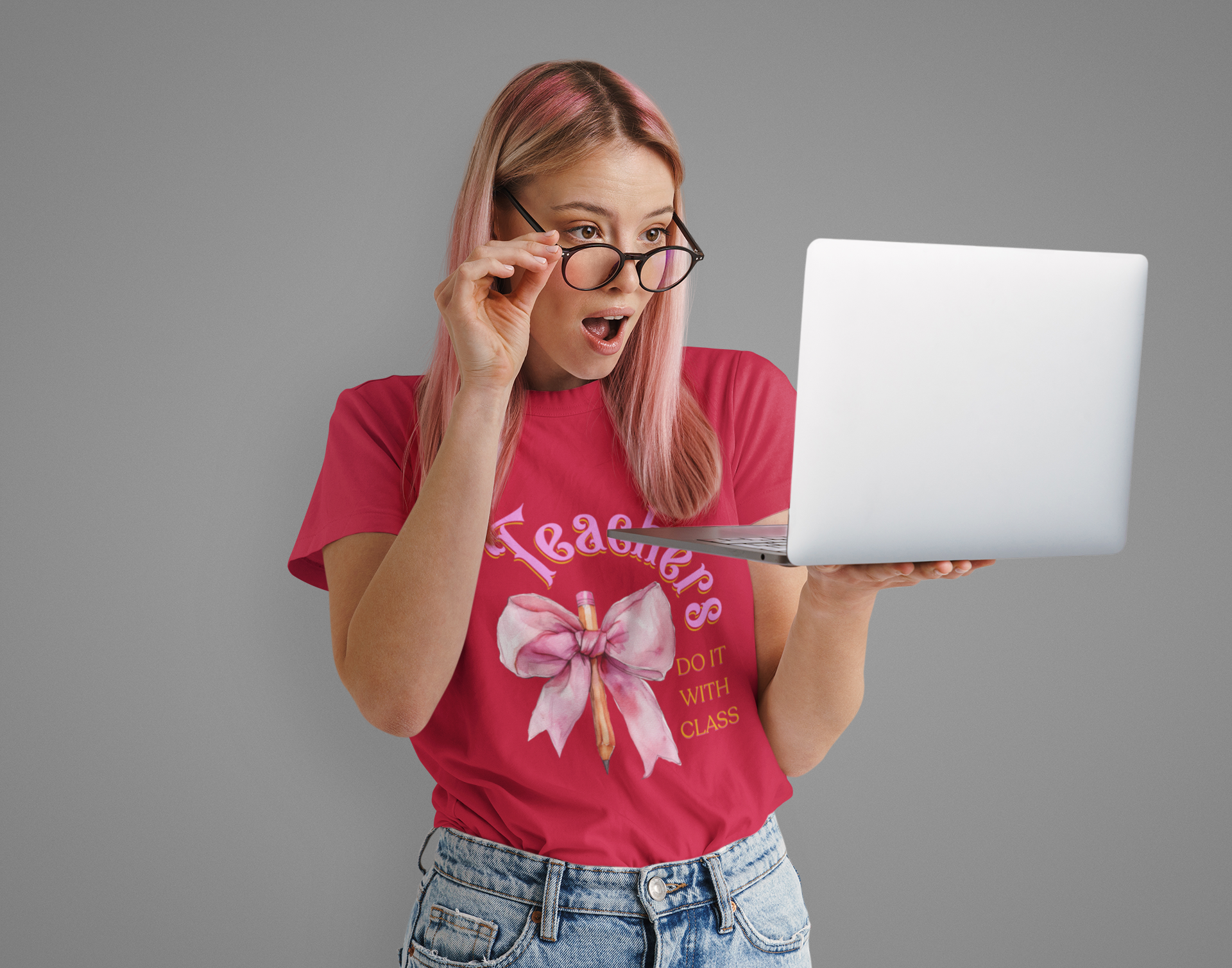 Celebrate the educators in your life with this stylish cute Coquette T-shirt for teachers. Designed for comfort and versatility, this tee adds a fun flair to any casual outfit. The playful coquette "Teachers Do It with Class" design is perfect for teachers, students, or anyone who appreciates the hard work of educators. Ideal for back-to-school events, teacher appreciation weeks, or special celebrations, this shirt makes a thoughtful gift for holidays like Christmas or birthdays. Whether worn in the classroom, at home, or during outings, it brings a relaxed yet trendy vibe to everyday wear. Embrace your inner educator and spread positivity with this eye-catching tee!
