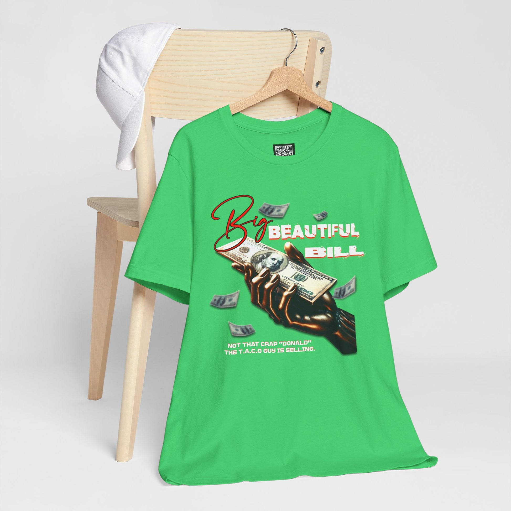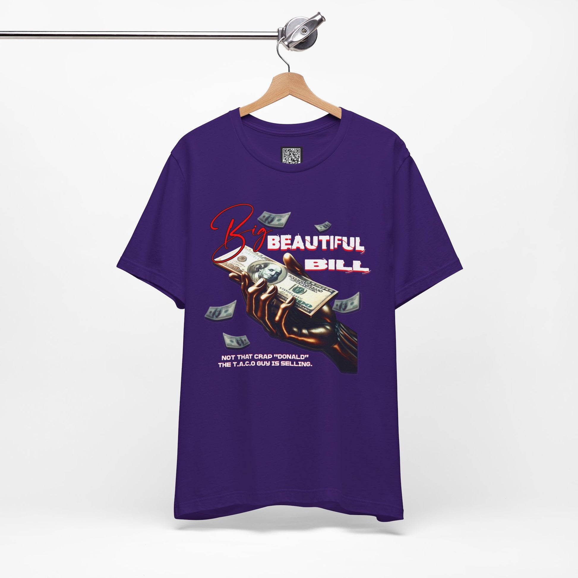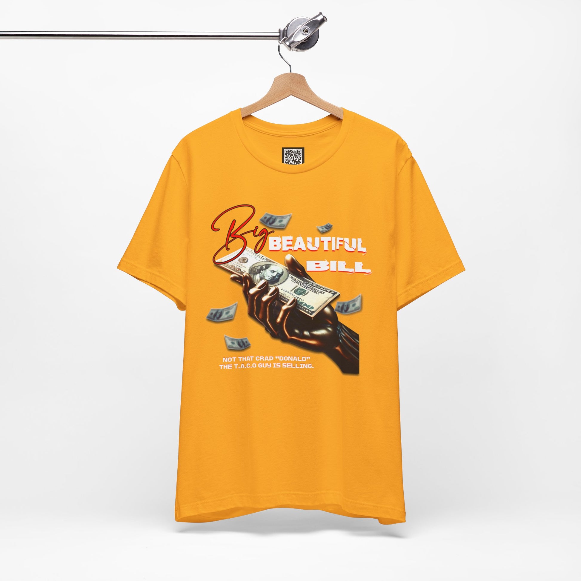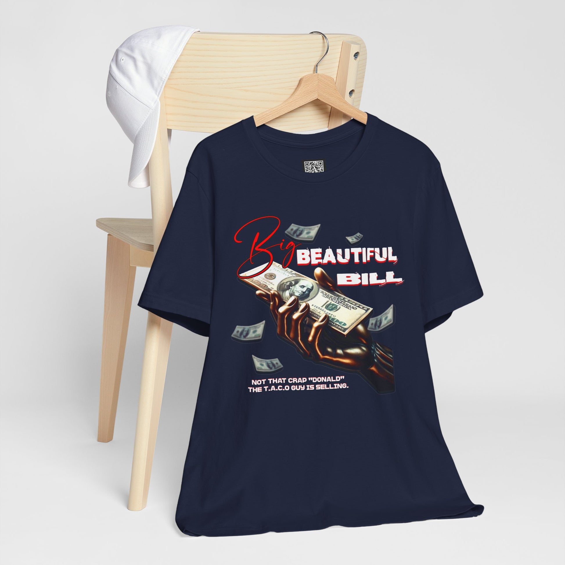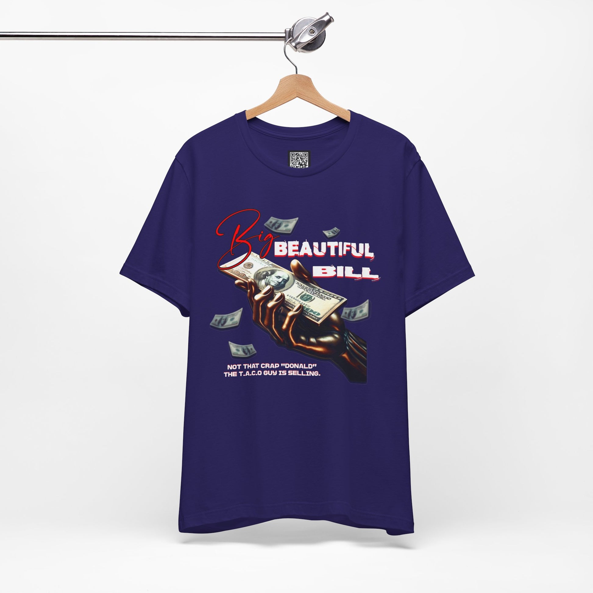 The T.A.C.O Guy "Big Beautiful Bill" shirt. Elevate your casual wardrobe with this versatile Unisex Jersey Short Sleeve Tee. Made from 100% Airlume combed and ring-spun cotton, it offers a soft, breathable feel perfect for all-day wear. The relaxed fit and classic crew neckline make it suitable for both laid-back outings and semi-formal occasions. Perfect shirt for the no kings and Hands Off protest. Whether you're celebrating holidays like birthdays or just enjoying a weekend with friends, this tee will keep you stylish and comfortable. It makes an ideal gift for friends or family who appreciate quality apparel that reflects their unique vibe. Great for anyone who loves to stay trendy while prioritizing comfort.