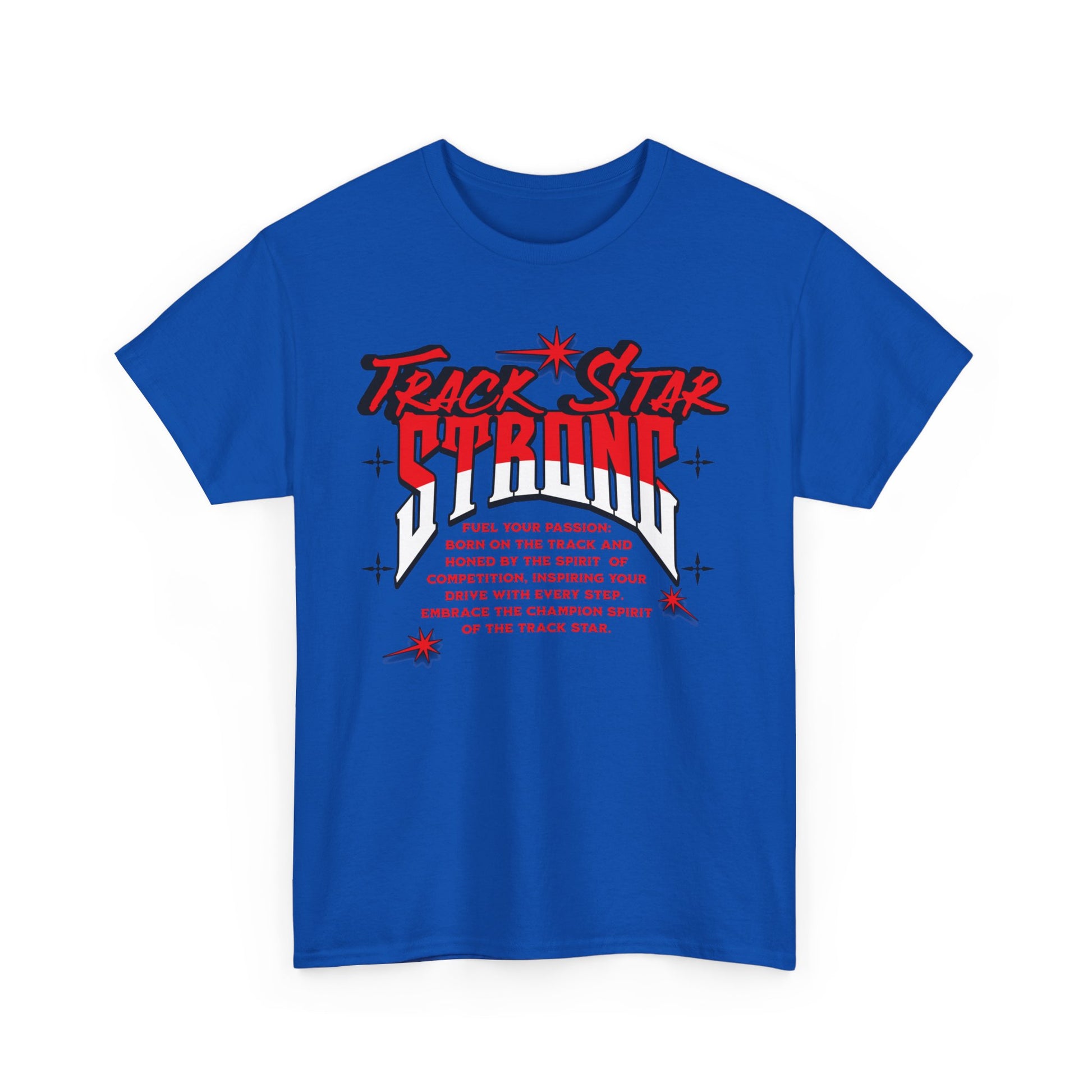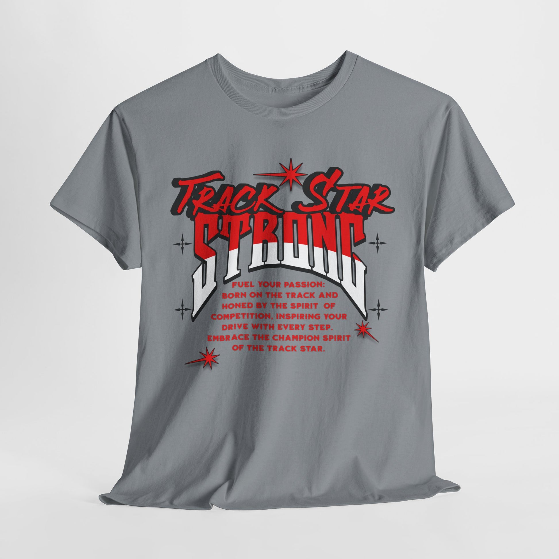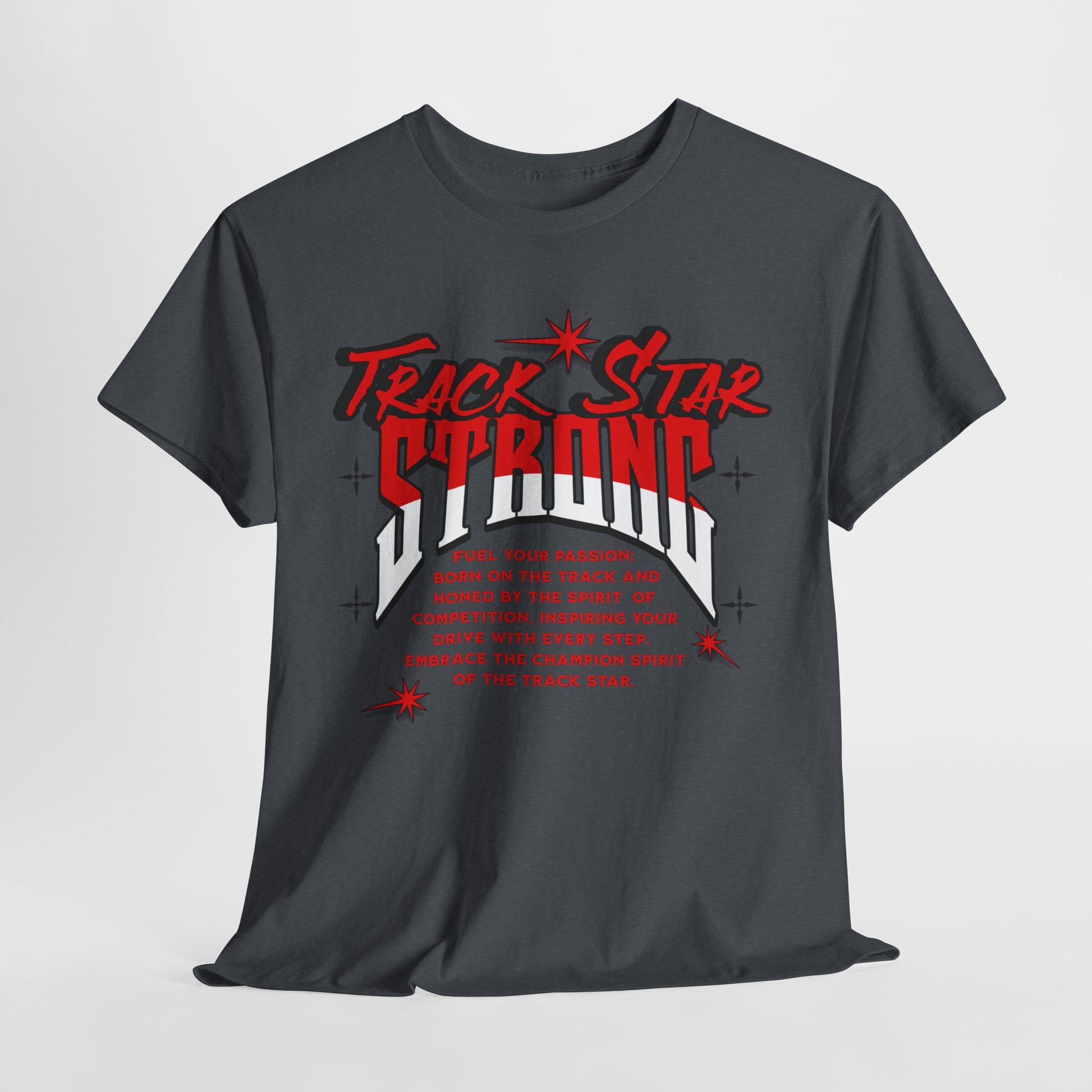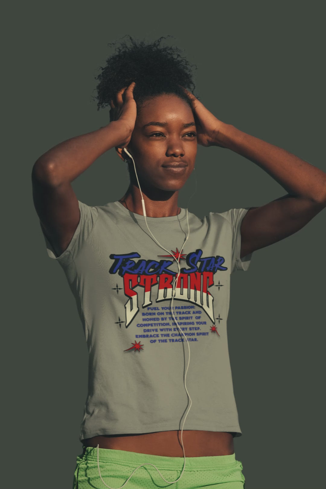This design embodies the spirit of a dedicated track athlete, blending bold typography with motivational messaging. The phrase "TRACK STAR STRONG" is prominently displayed in a dynamic, layered font, conveying power and determination. The inspirational text "FUEL YOUR PASSION: BORN ON THE TRACK AND HONED BY THE SPIRIT OF COMPETITION, INSPIRING YOUR DRIVE WITH EVERY STEP. EMBRACE THE CHAMPION SPIRIT OF THE TRACK STAR" reinforces the dedication and perseverance required to excel in track and field. The star accents add a touch of dynamism and highlight the theme of achievement. This design is perfect for track athletes, coaches, and fans who appreciate the dedication and drive it takes to succeed in the sport. It's ideal as a constant reminder of the strength and spirit of a track star.