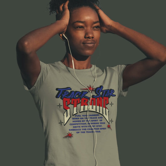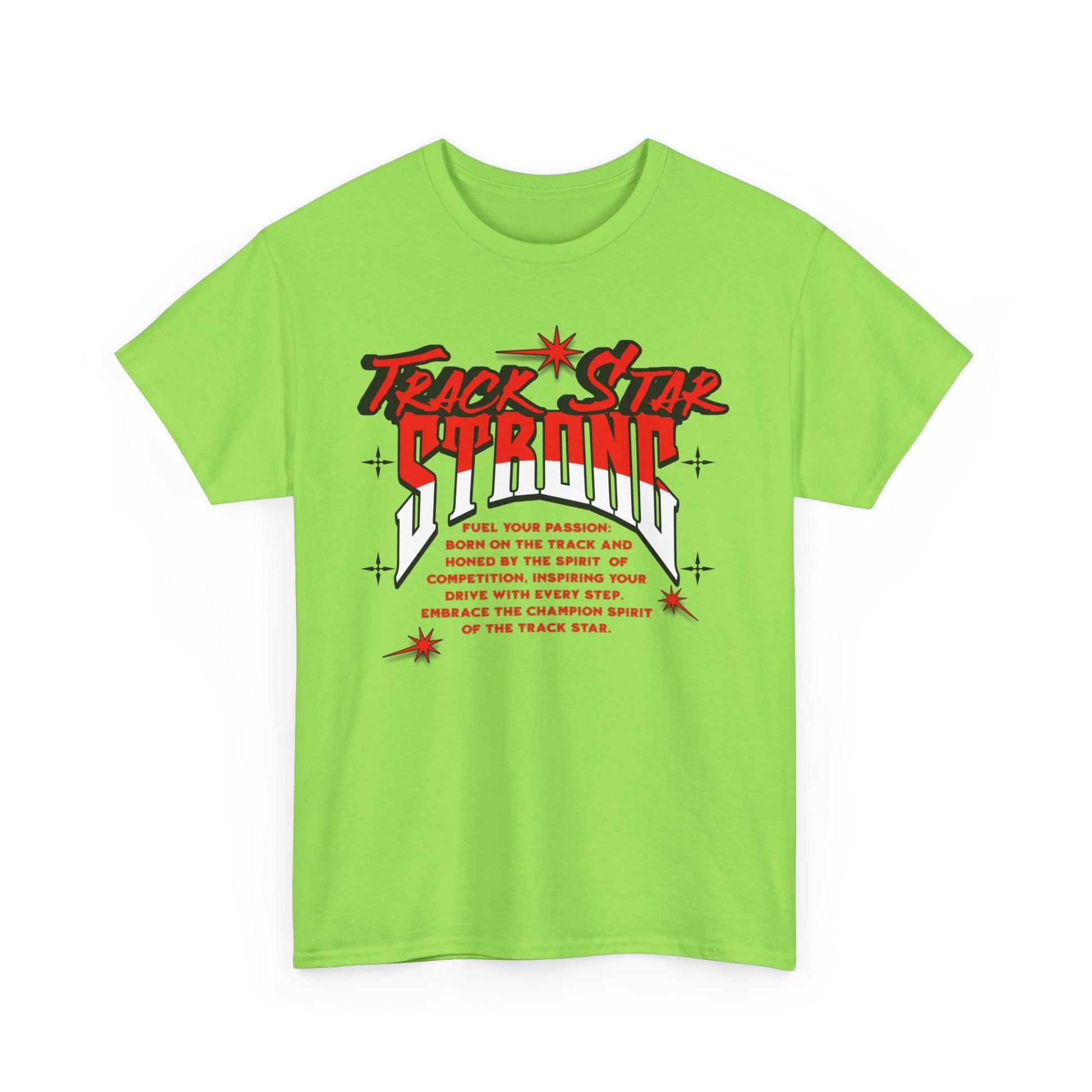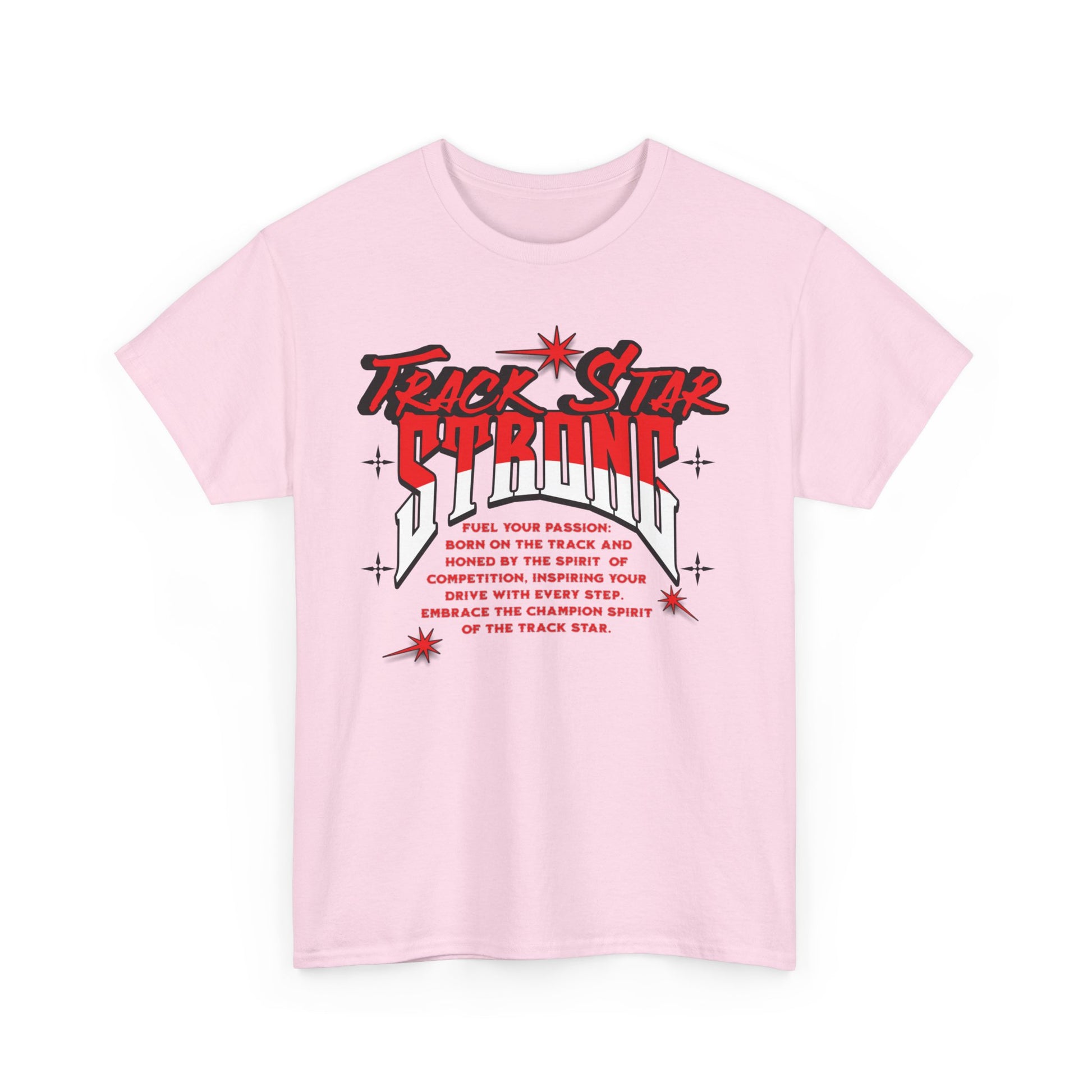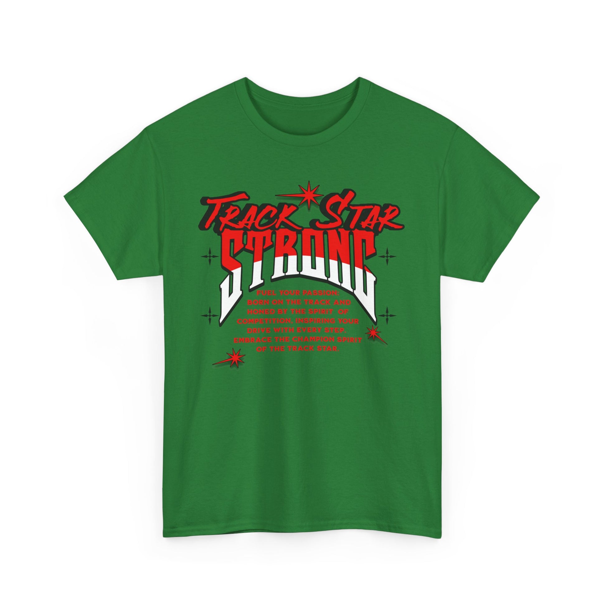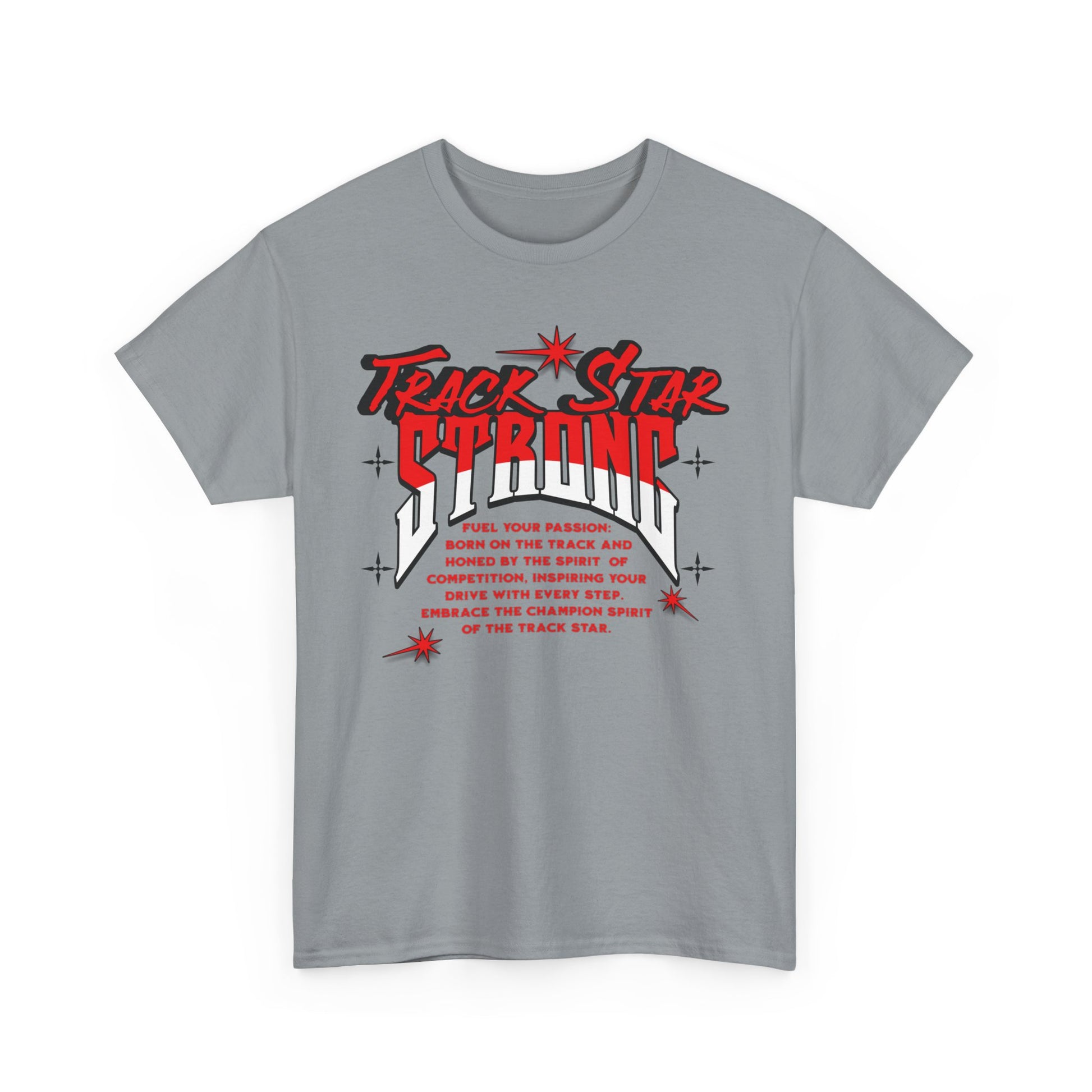 This design embodies the spirit of a dedicated track athlete, blending bold typography with motivational messaging. The phrase "TRACK STAR STRONG" is prominently displayed in a dynamic, layered font, conveying power and determination. The inspirational text "FUEL YOUR PASSION: BORN ON THE TRACK AND HONED BY THE SPIRIT OF COMPETITION, INSPIRING YOUR DRIVE WITH EVERY STEP. EMBRACE THE CHAMPION SPIRIT OF THE TRACK STAR" reinforces the dedication and perseverance required to excel in track and field. The star accents add a touch of dynamism and highlight the theme of achievement. This design is perfect for track athletes, coaches, and fans who appreciate the dedication and drive it takes to succeed in the sport. It's ideal as a constant reminder of the strength and spirit of a track star.