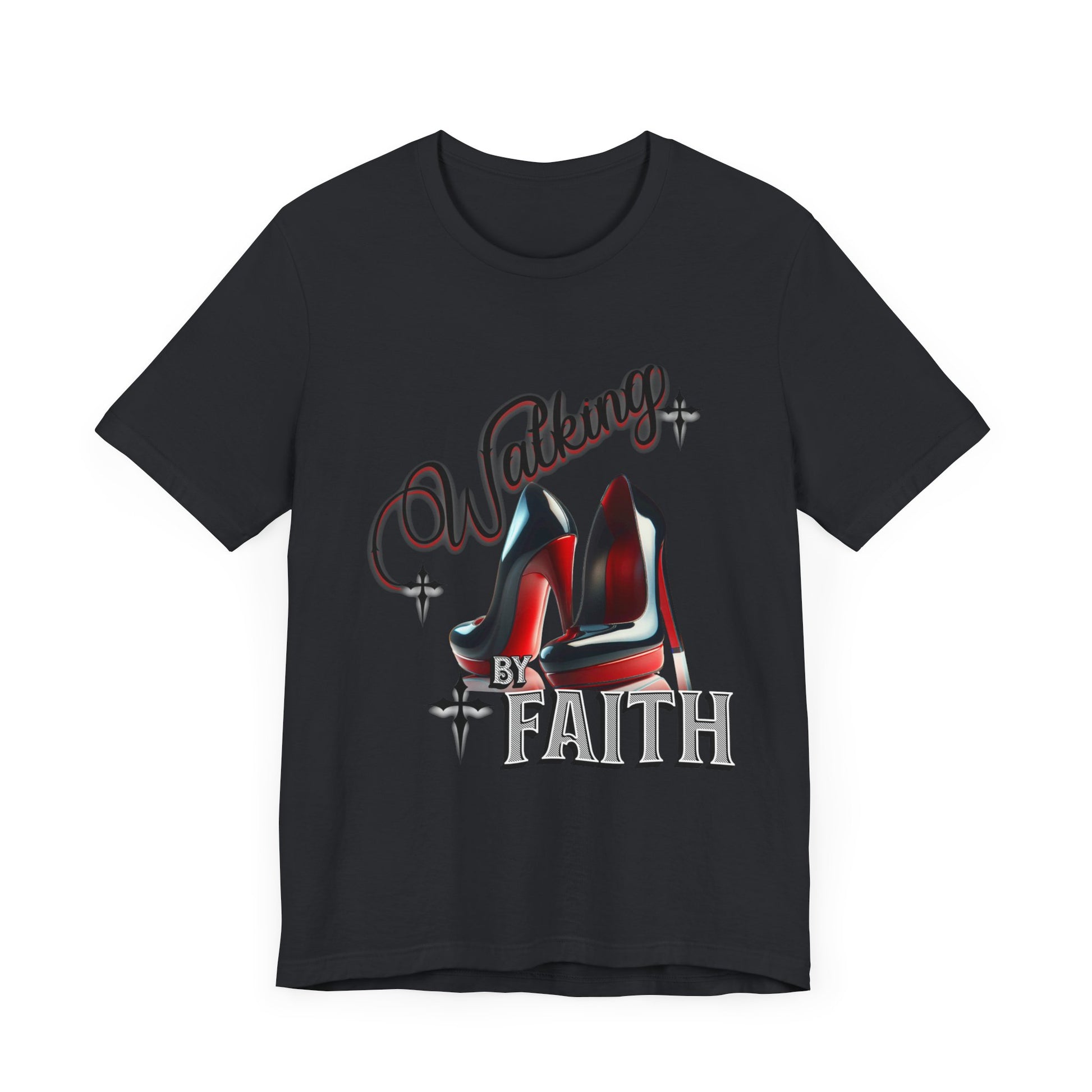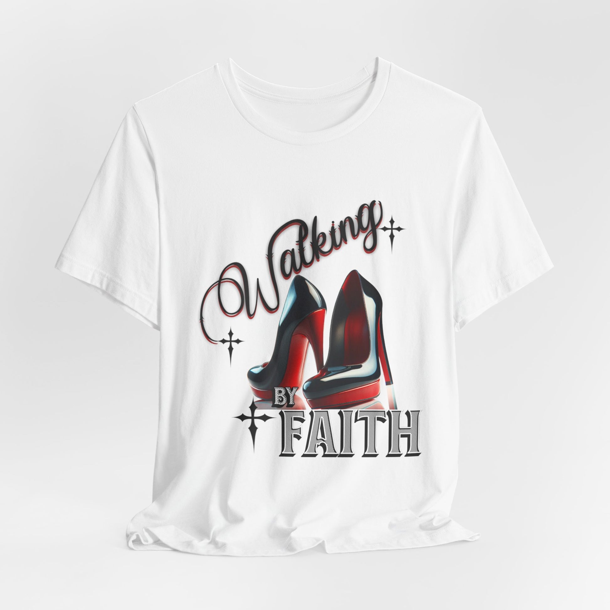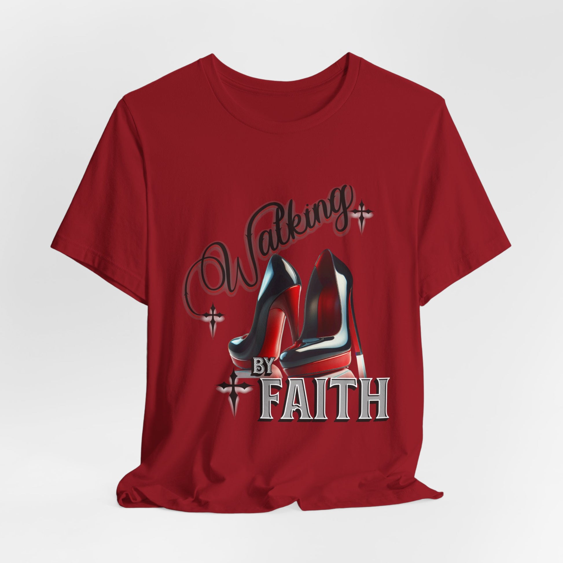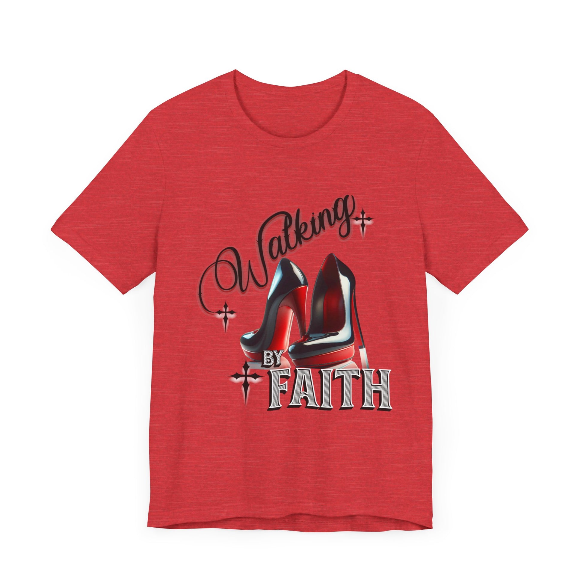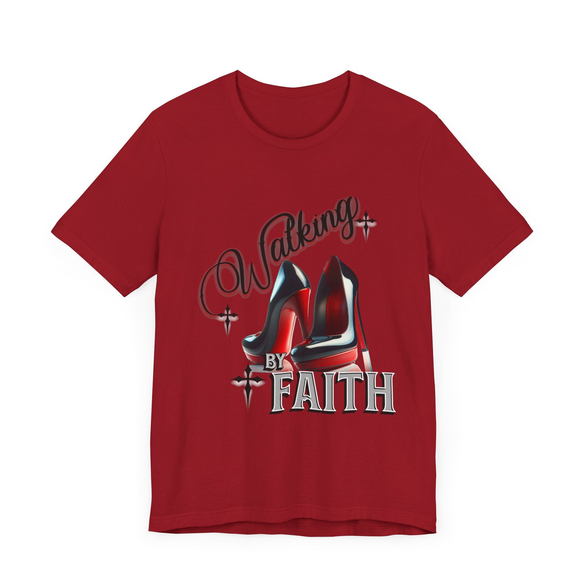 Walking by Faith Graphic Tee, Inspirational Unisex Jersey Short Sleeve T-Shirt, Faithful Footsteps in Red Bottom Shoes, Louboutin Shoe Graphic Religious Tee