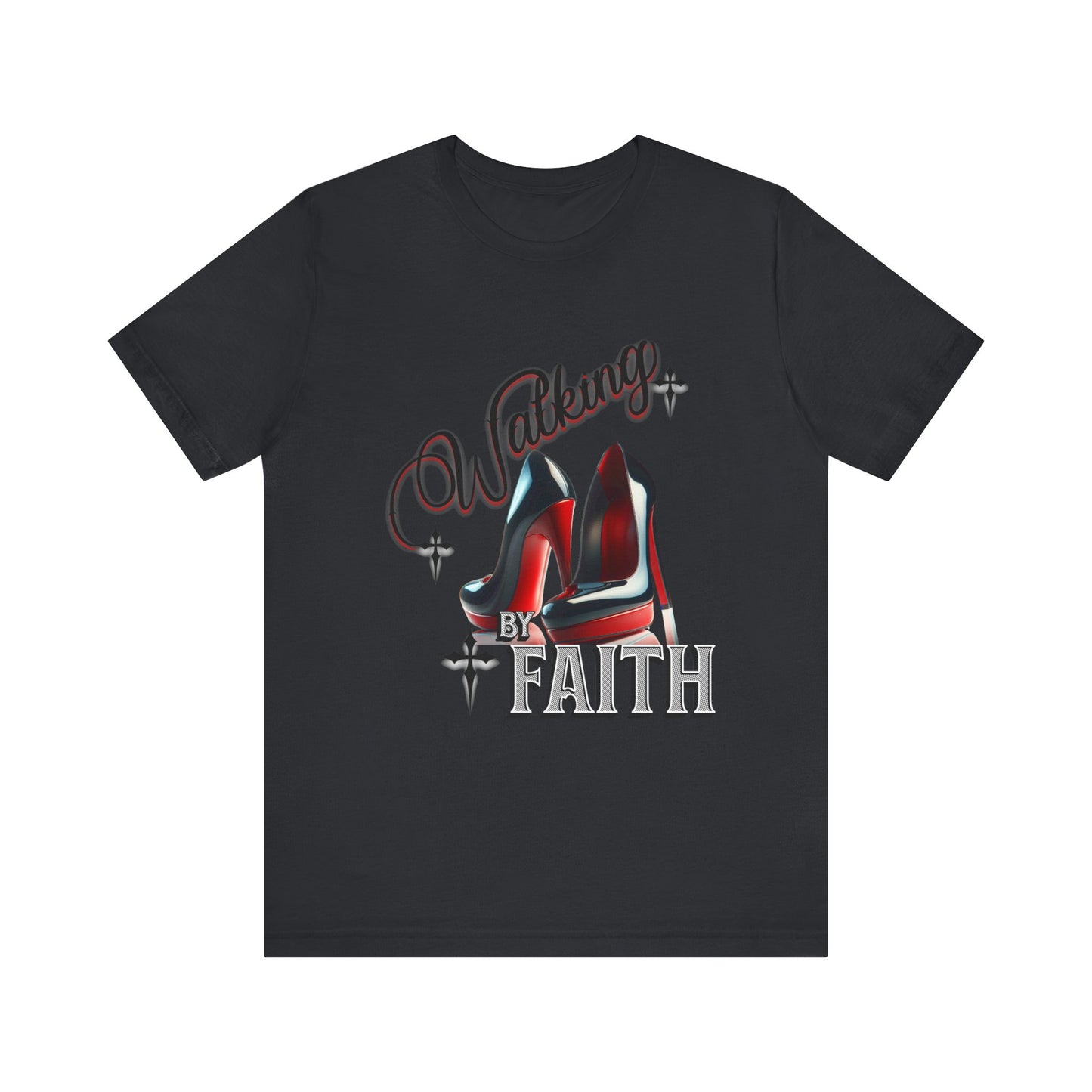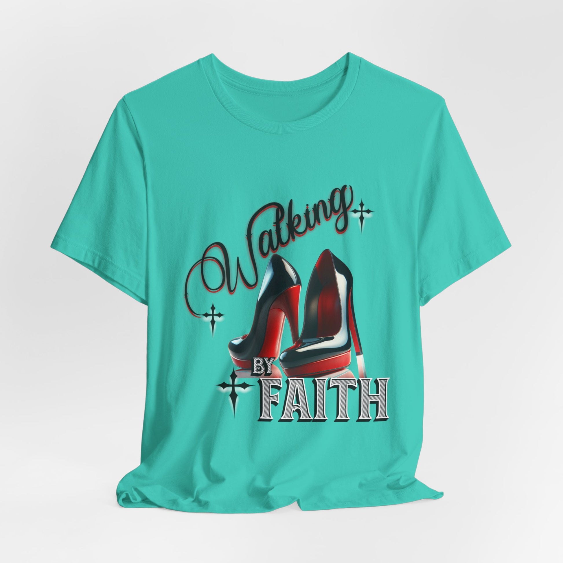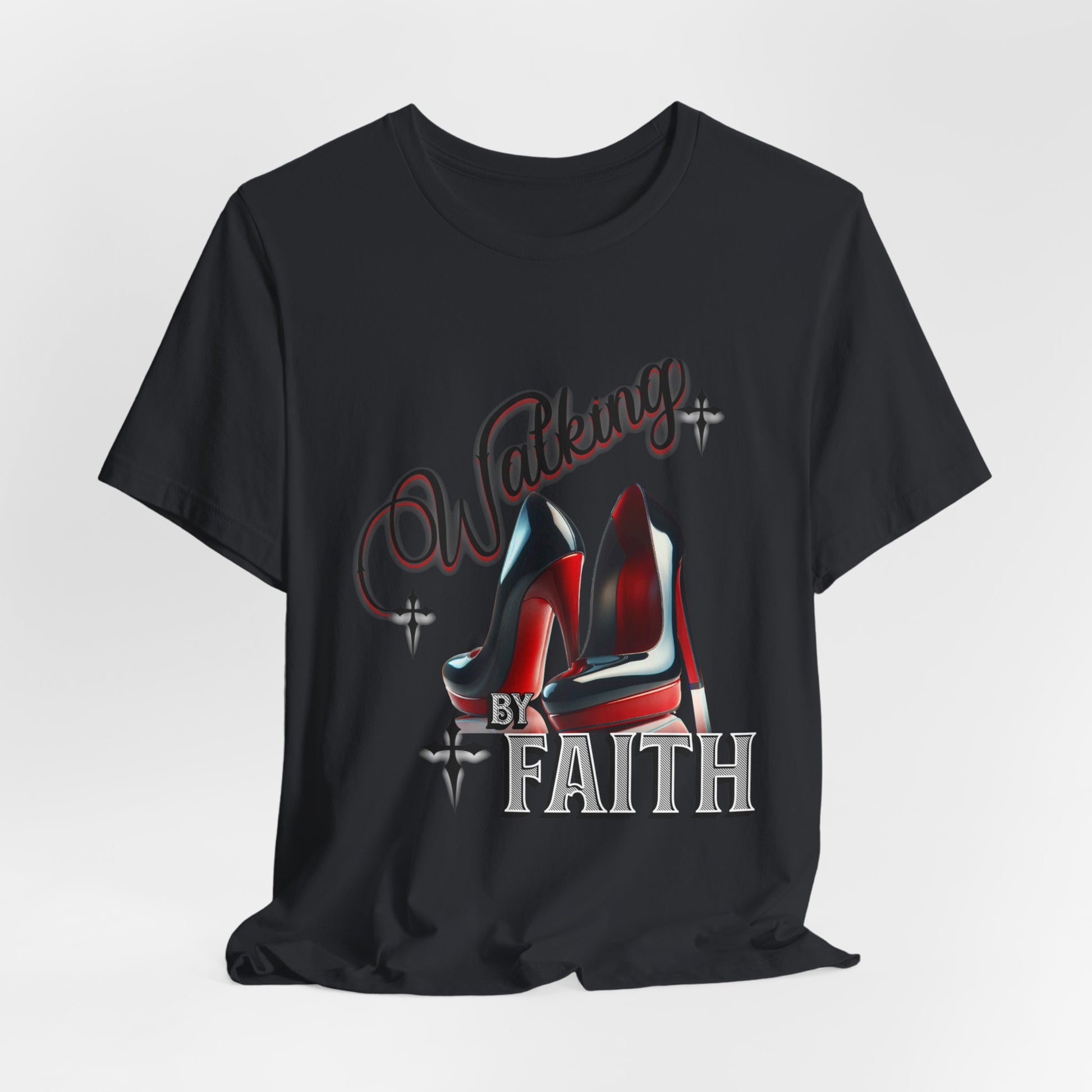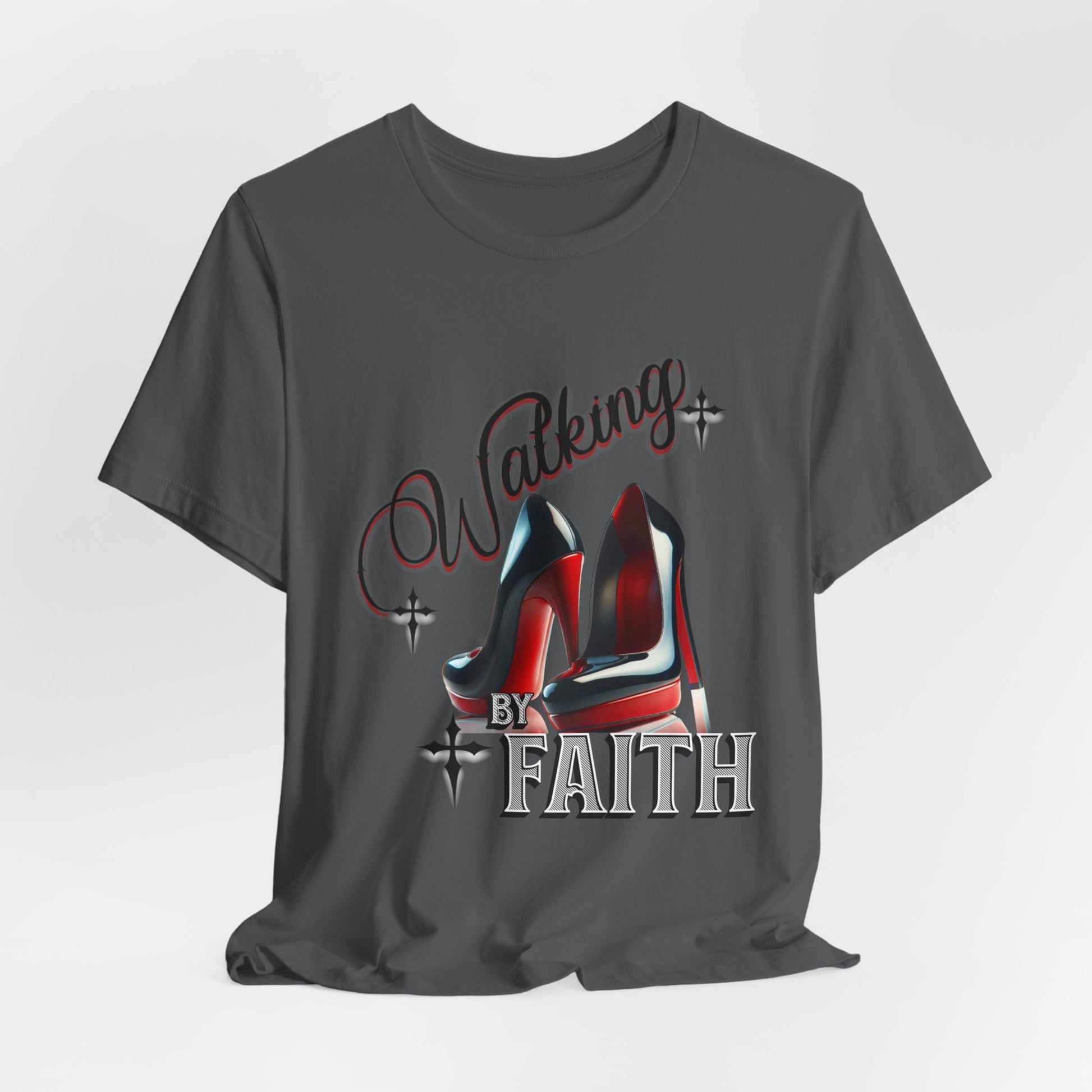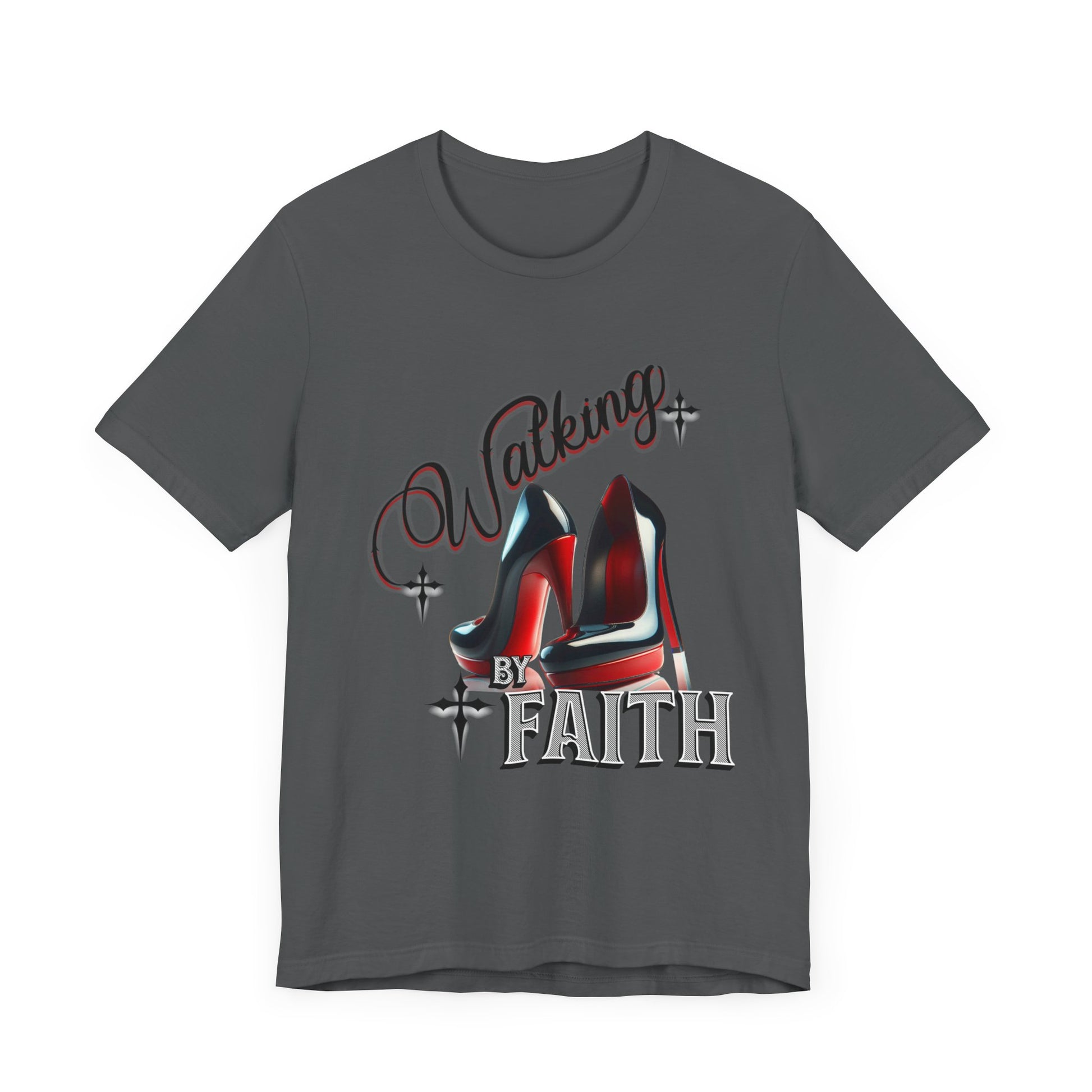 Walking by Faith Graphic Tee, Inspirational Unisex Jersey Short Sleeve T-Shirt, Faithful Footsteps in Red Bottom Shoes, Louboutin Shoe Graphic Religious Tee
