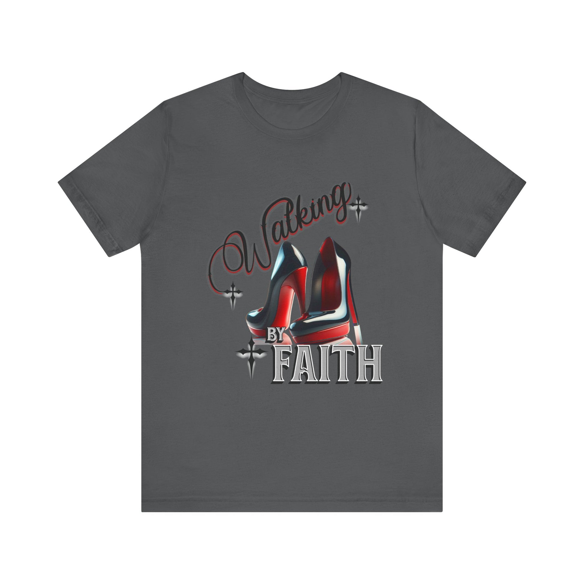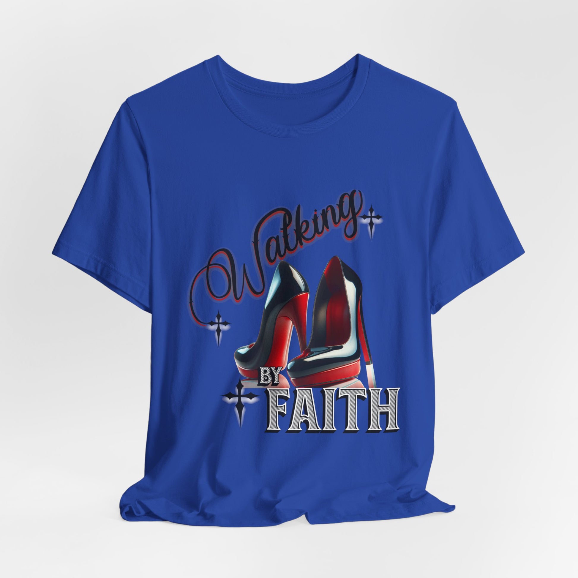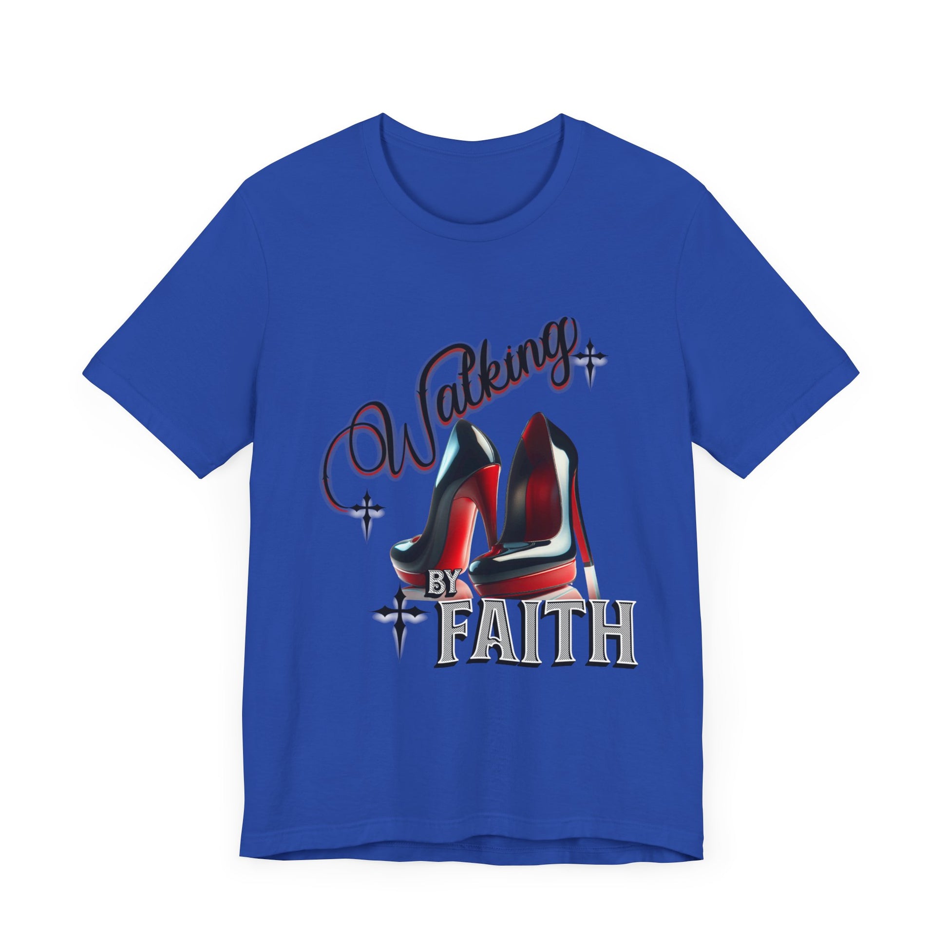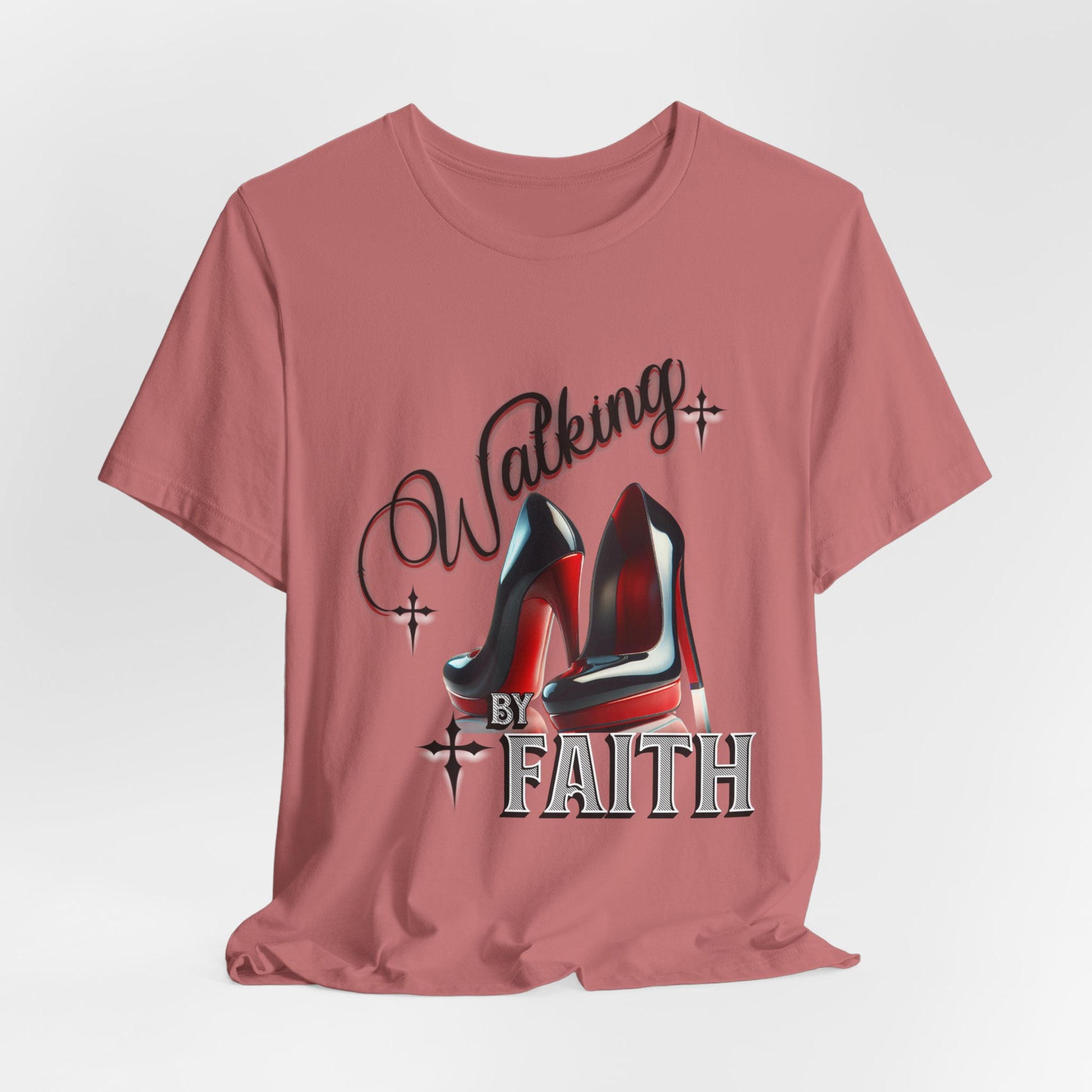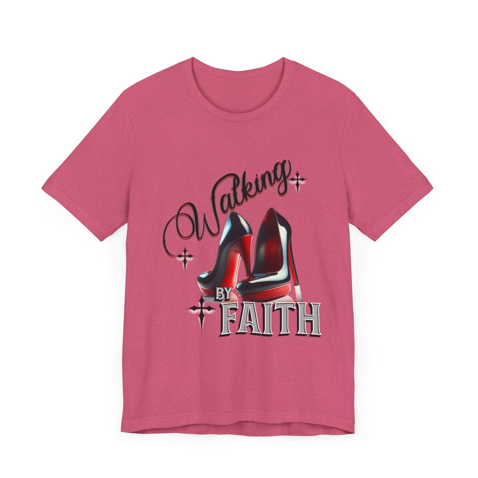Walking by Faith Graphic Tee, Inspirational Unisex Jersey Short Sleeve T-Shirt, Faithful Footsteps in Red Bottom Shoes, Louboutin Shoe Graphic Religious Tee