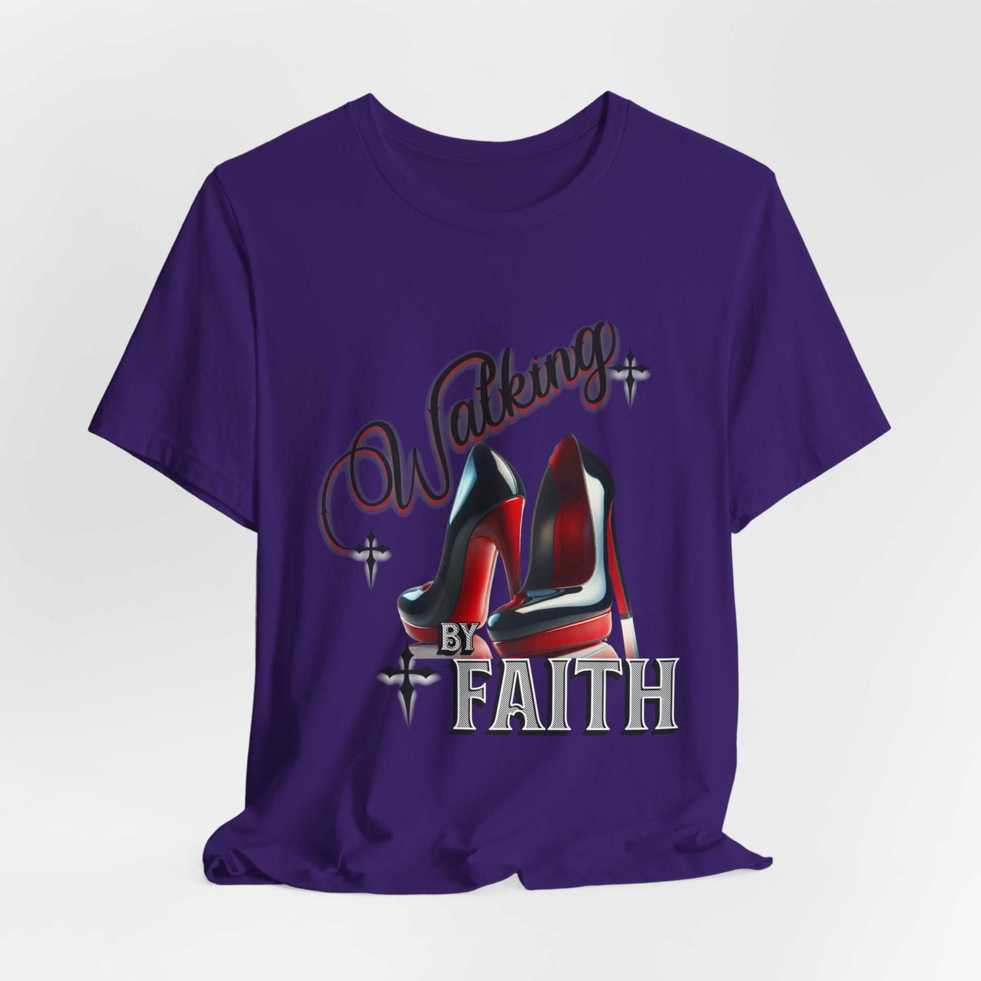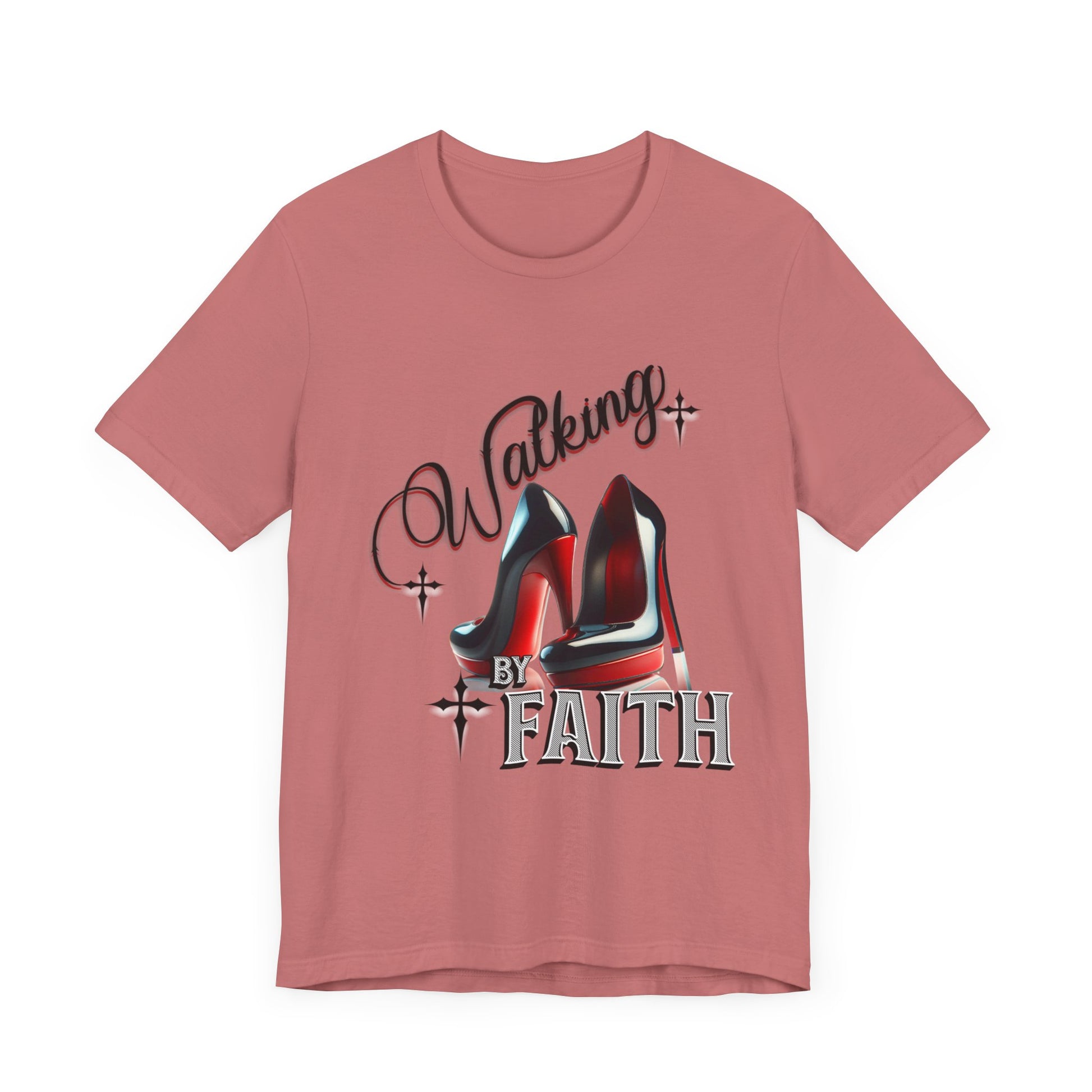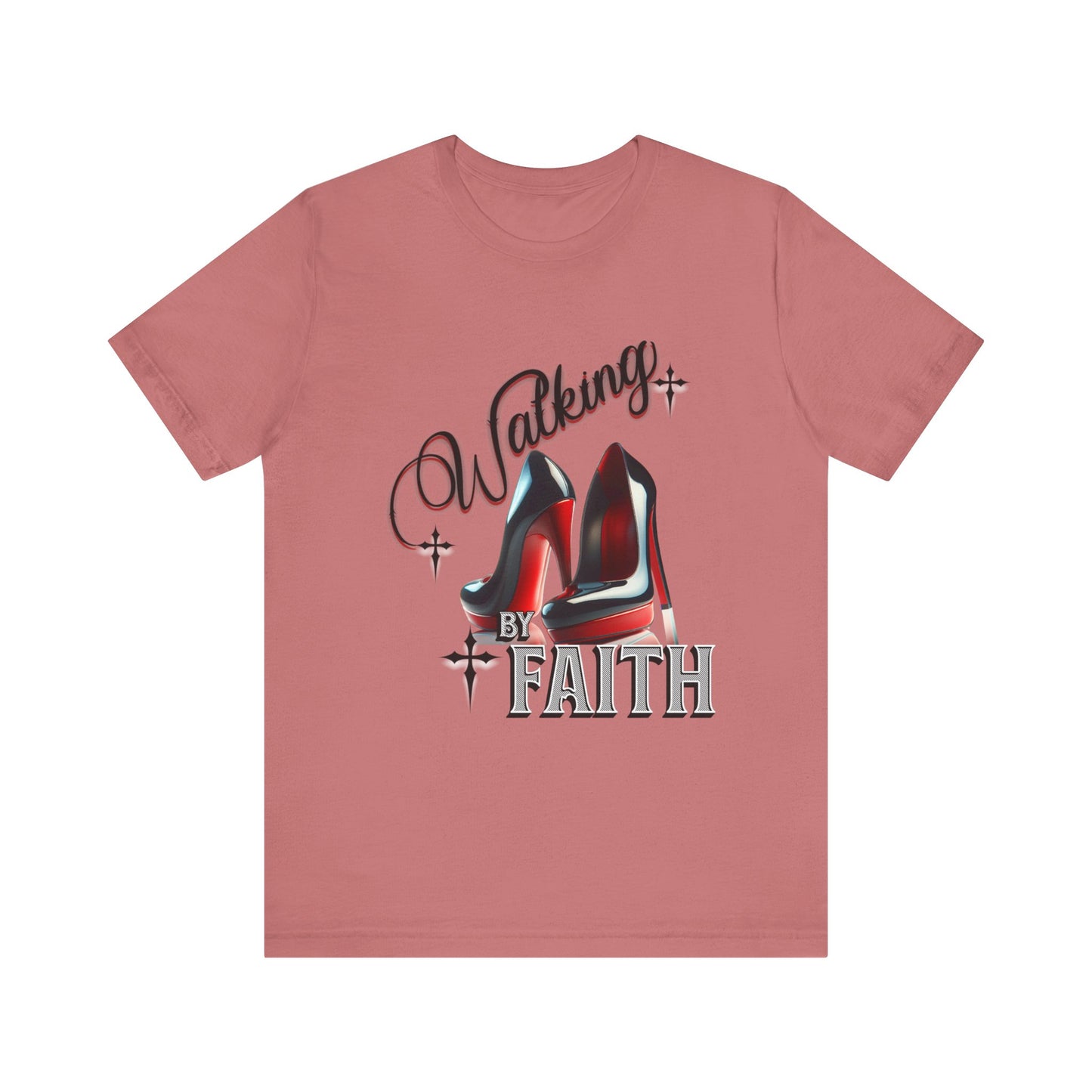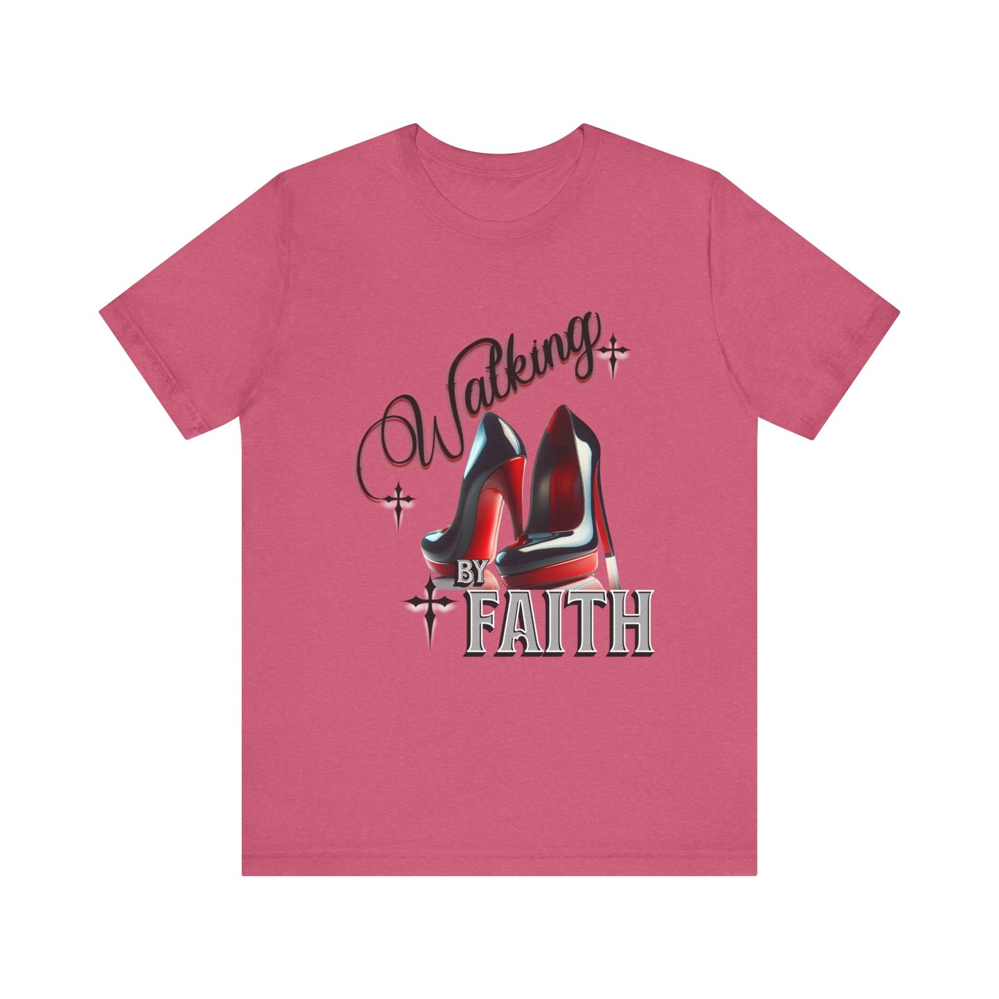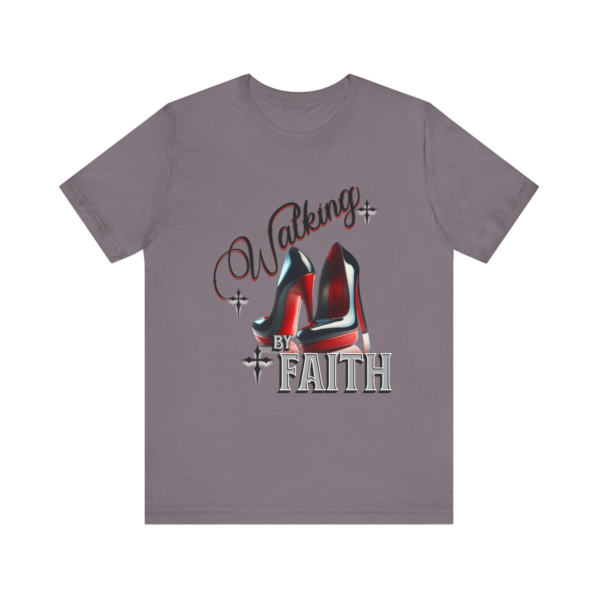 Walking by Faith Graphic Tee, Inspirational Unisex Jersey Short Sleeve T-Shirt, Faithful Footsteps in Red Bottom Shoes, Louboutin Shoe Graphic Religious Tee