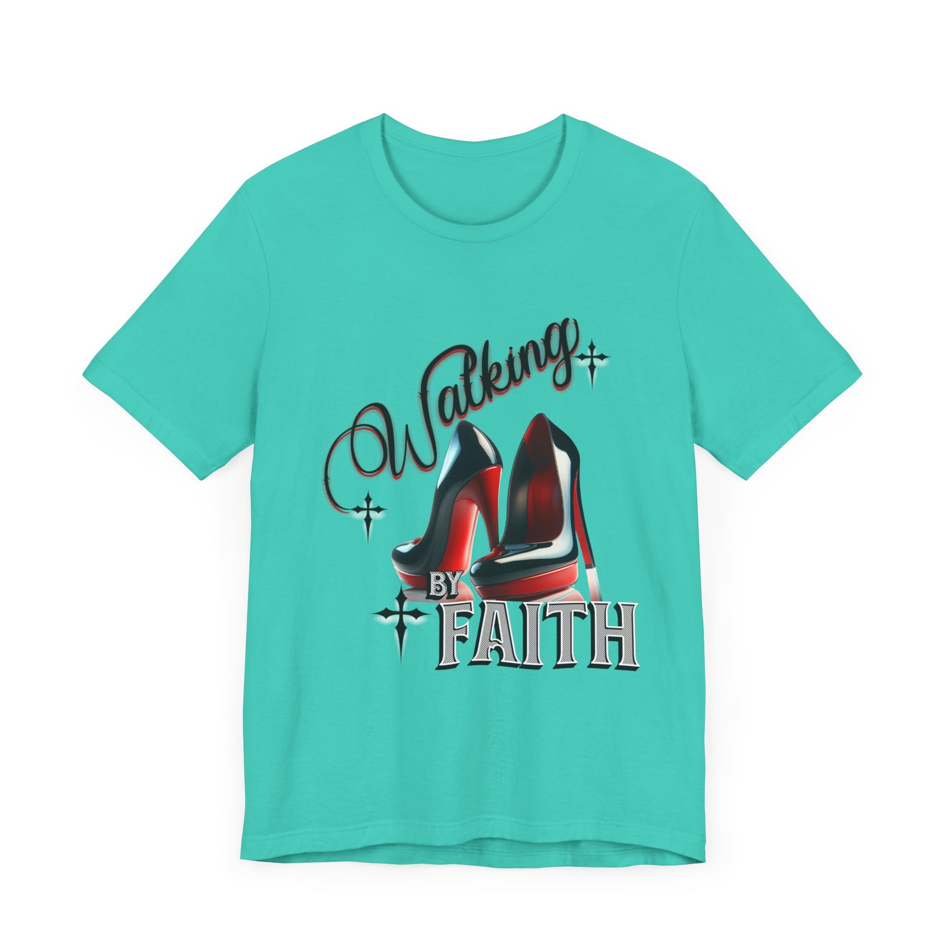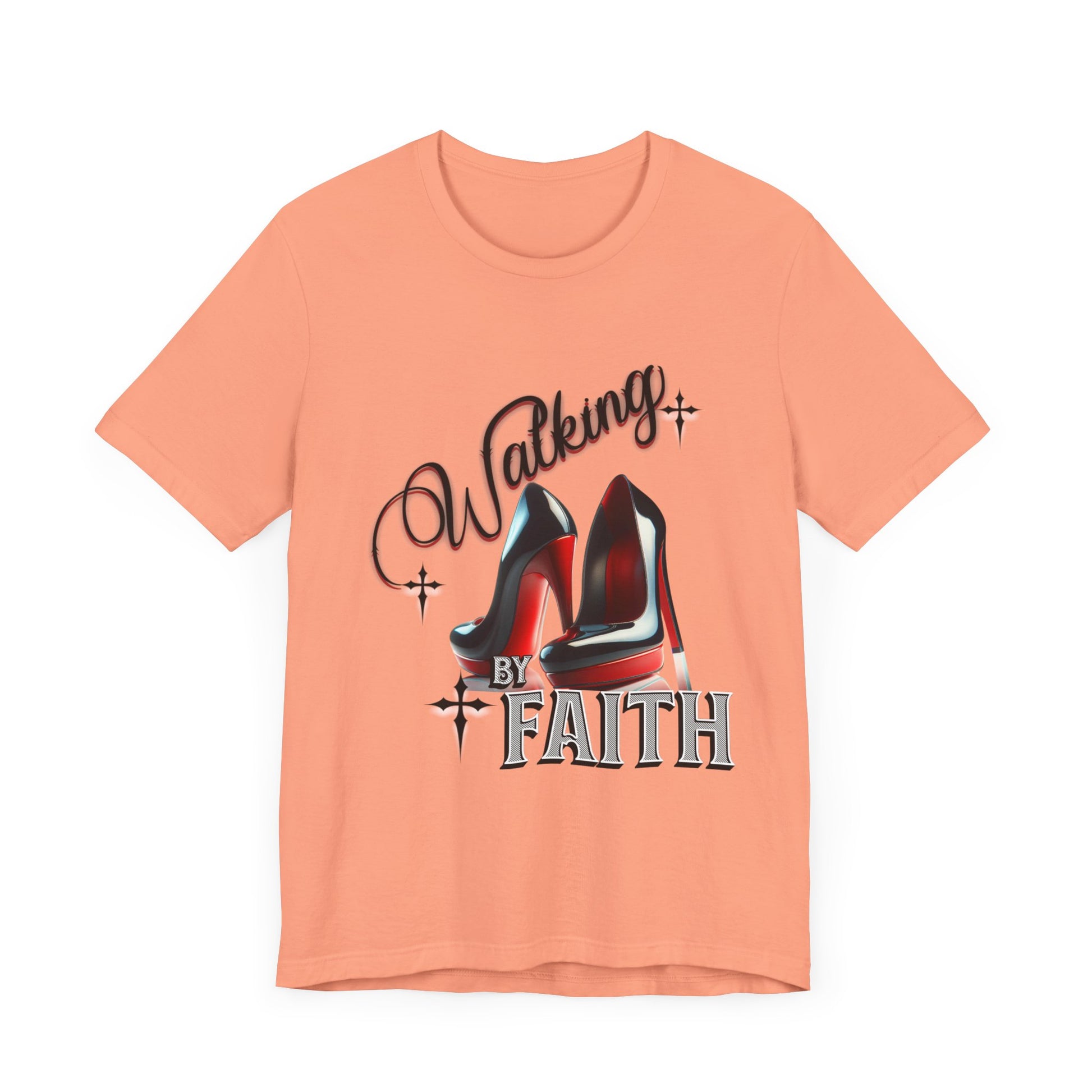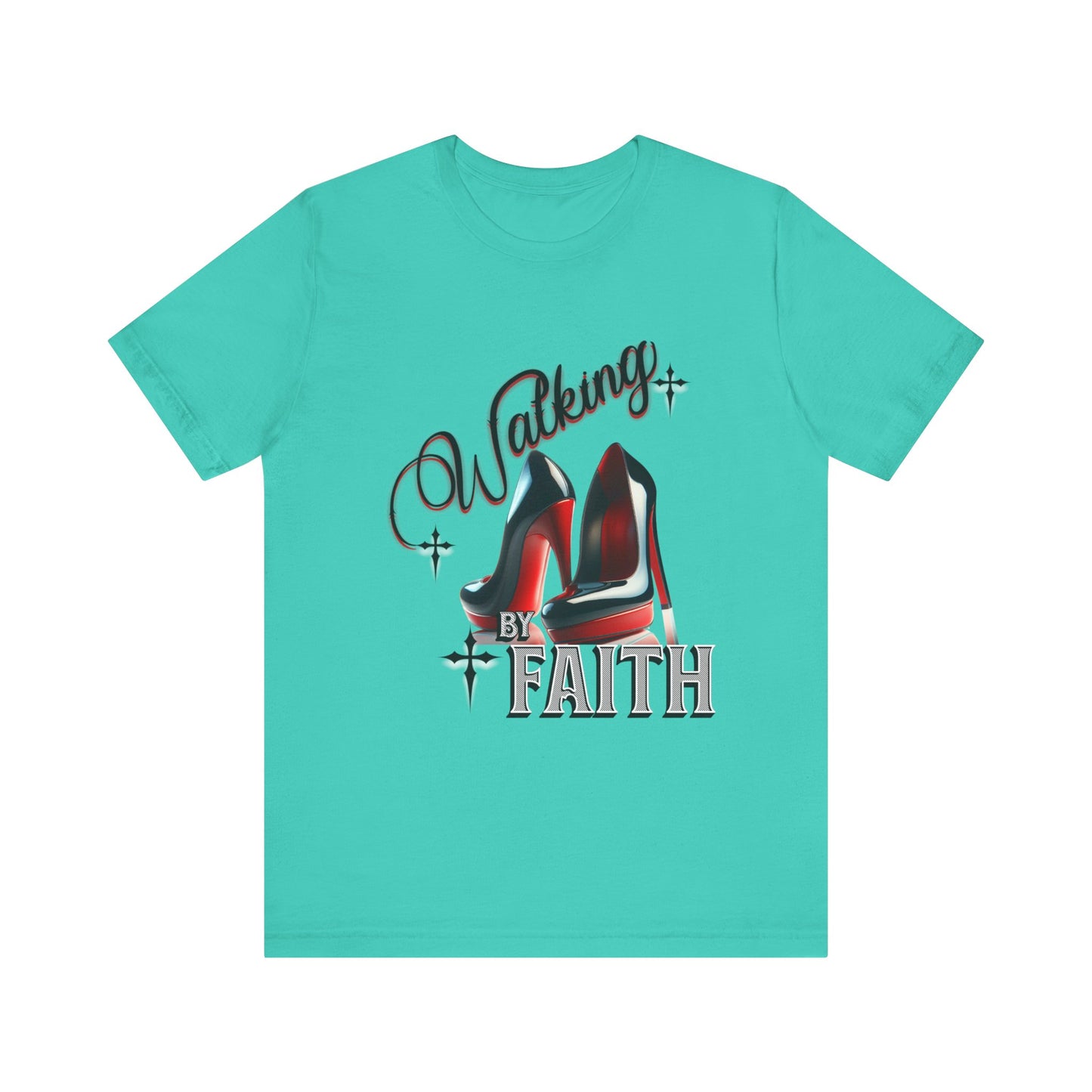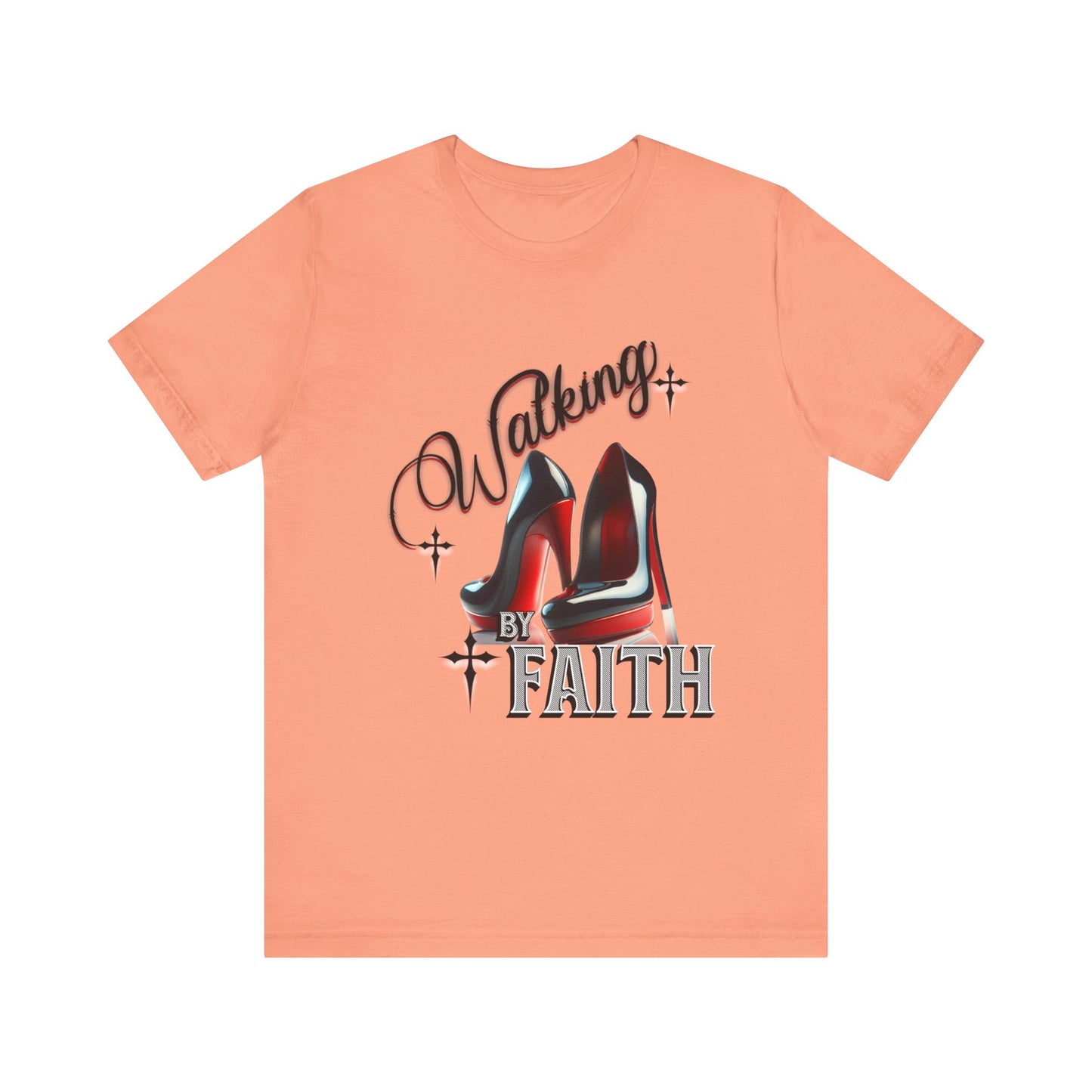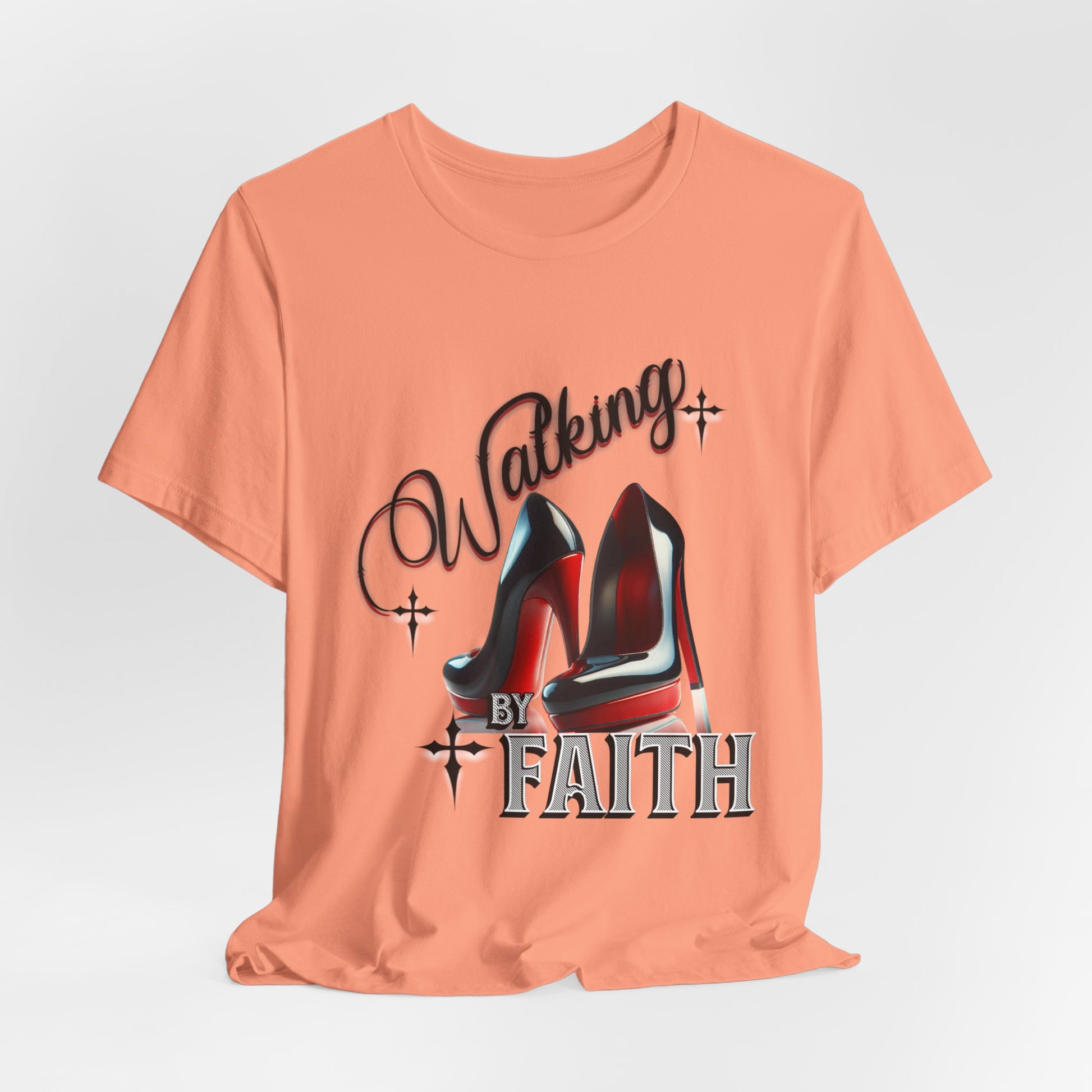 Walking by Faith Graphic Tee, Inspirational Unisex Jersey Short Sleeve T-Shirt, Faithful Footsteps in Red Bottom Shoes, Louboutin Shoe Graphic Religious Tee
