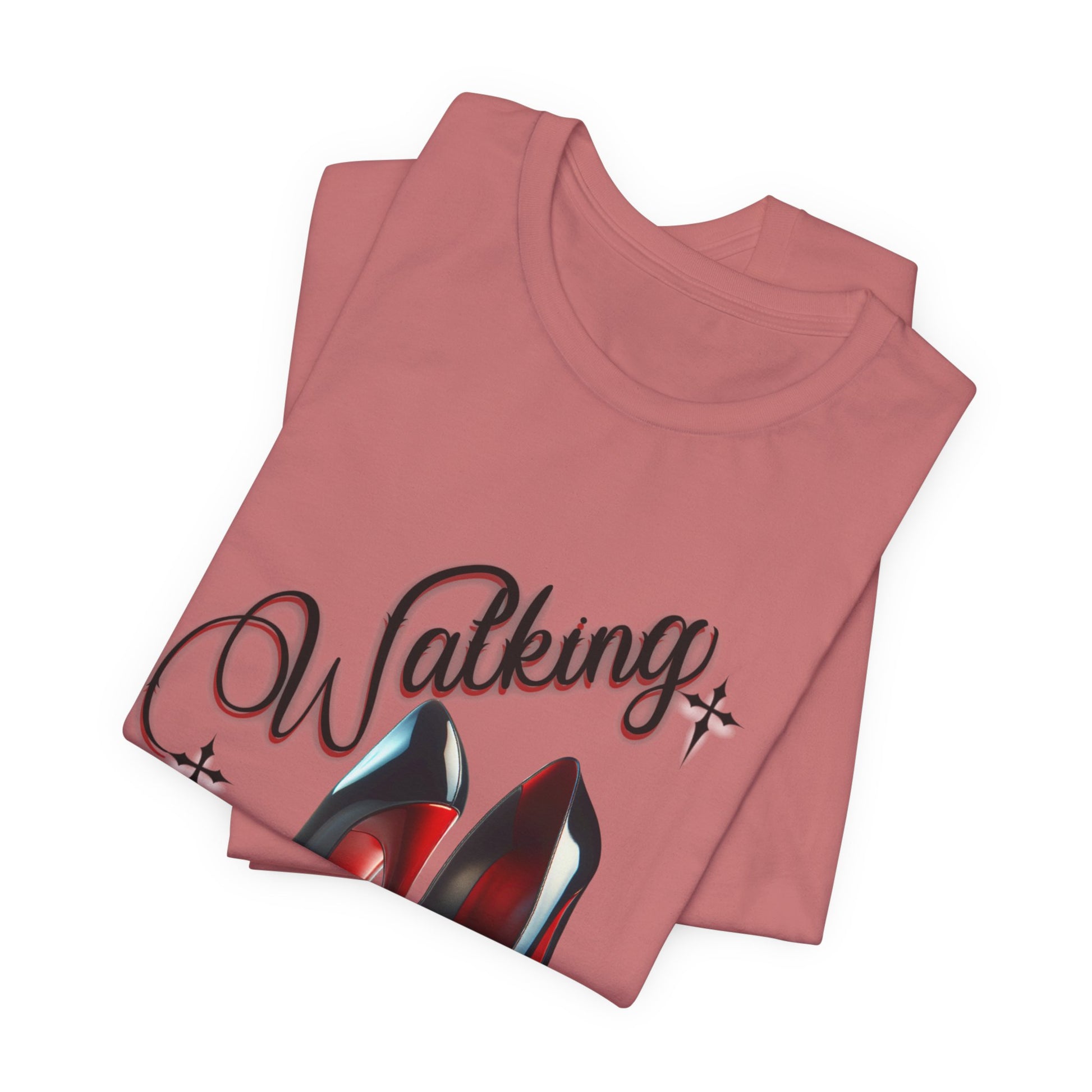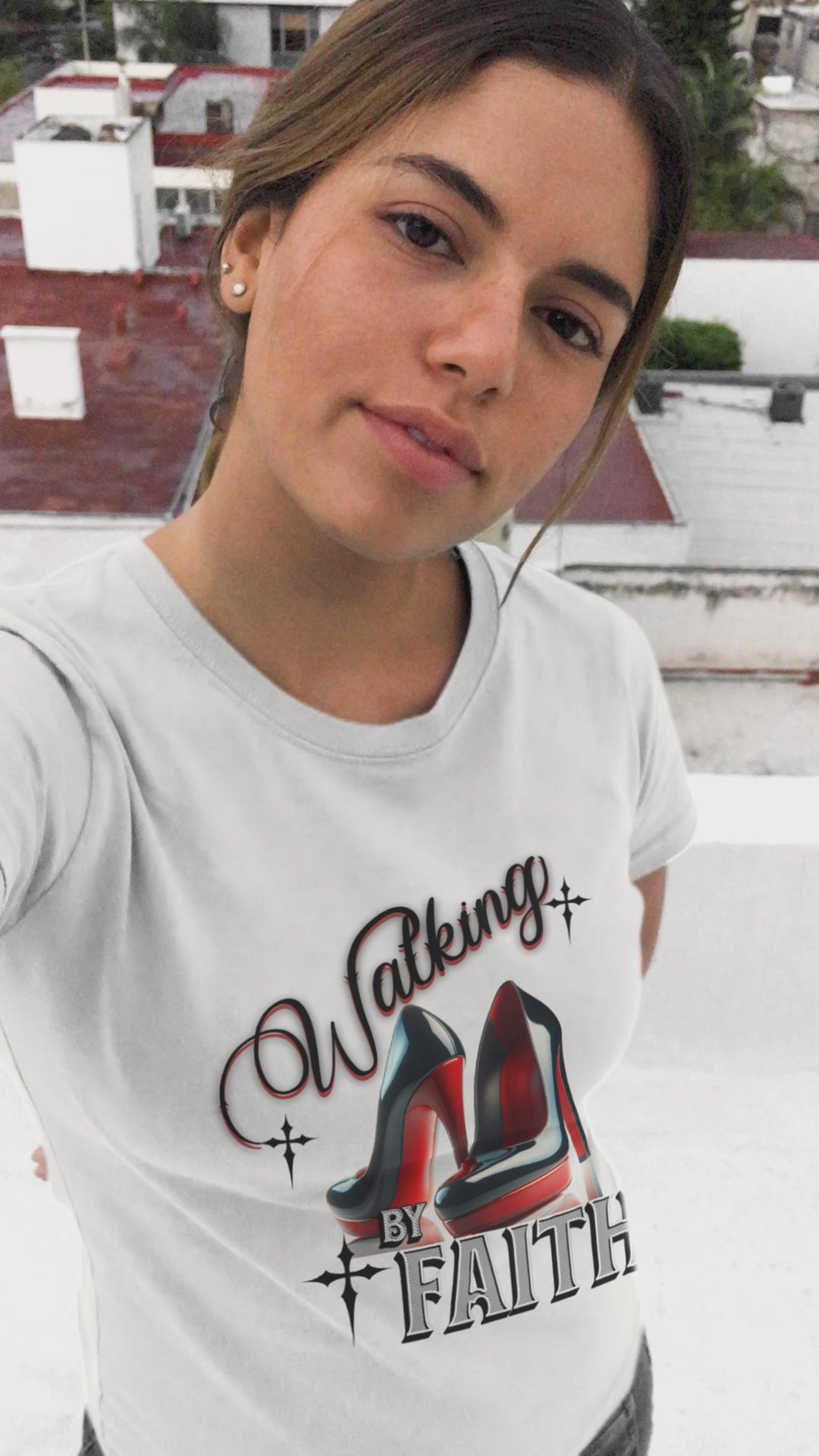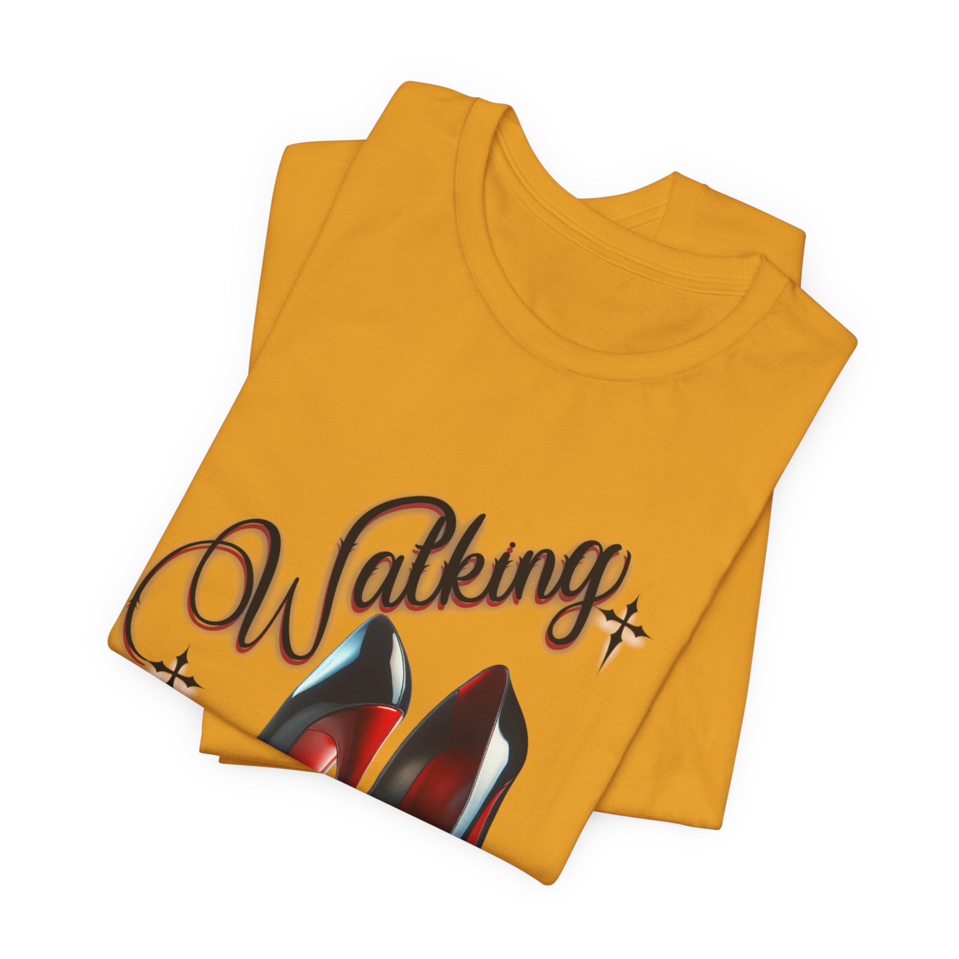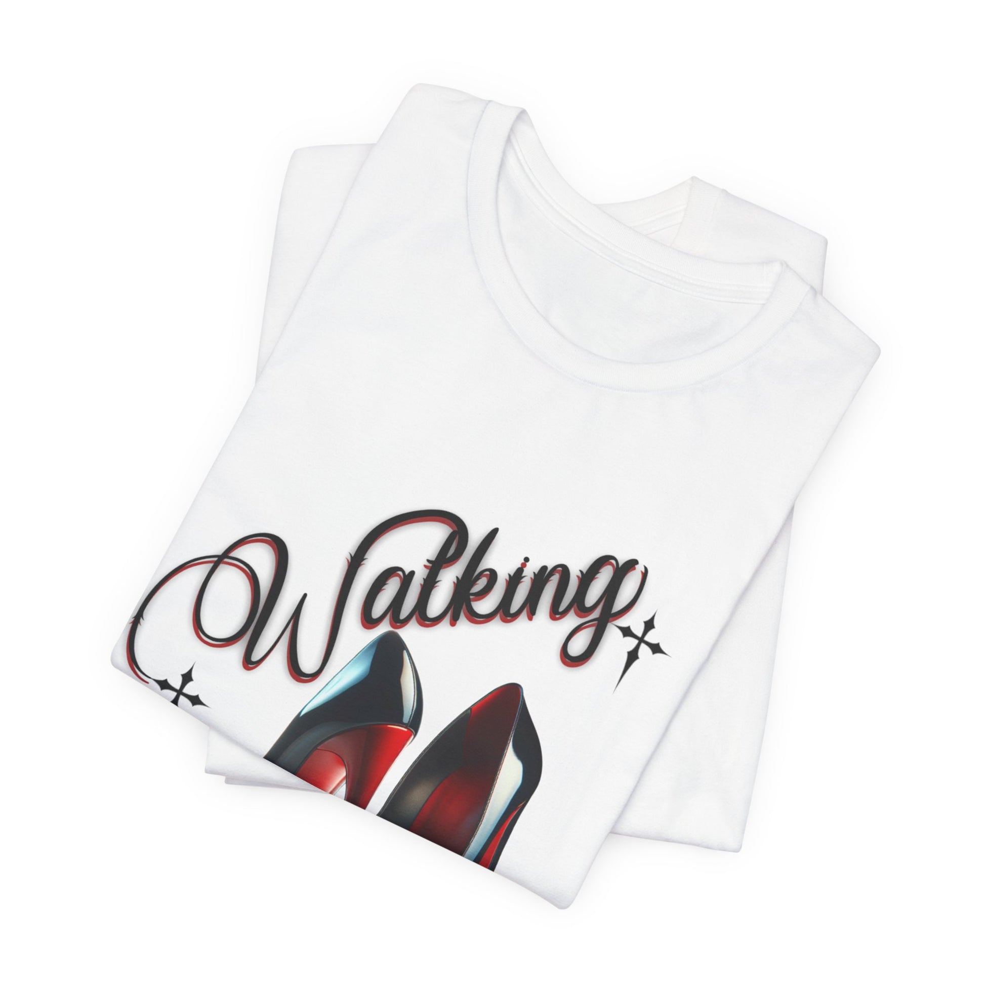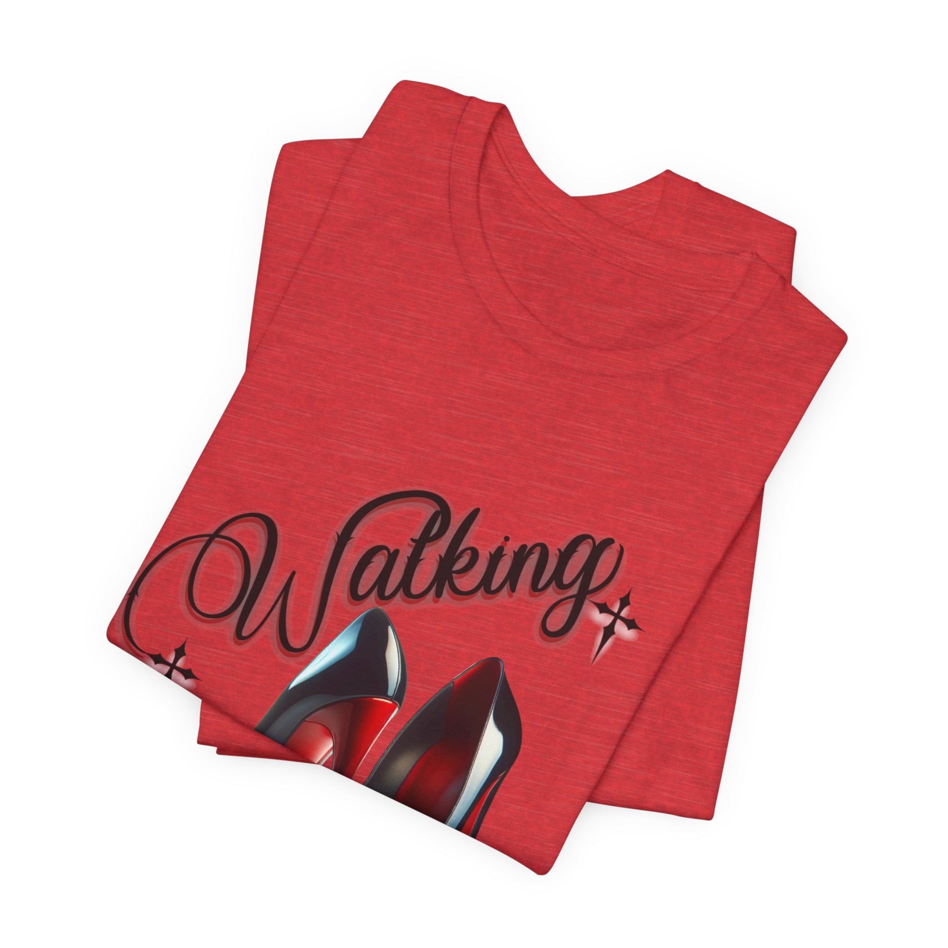 Walking by Faith Graphic Tee, Inspirational Unisex Jersey Short Sleeve T-Shirt, Faithful Footsteps in Red Bottom Shoes, Louboutin Shoe Graphic Religious Tee
