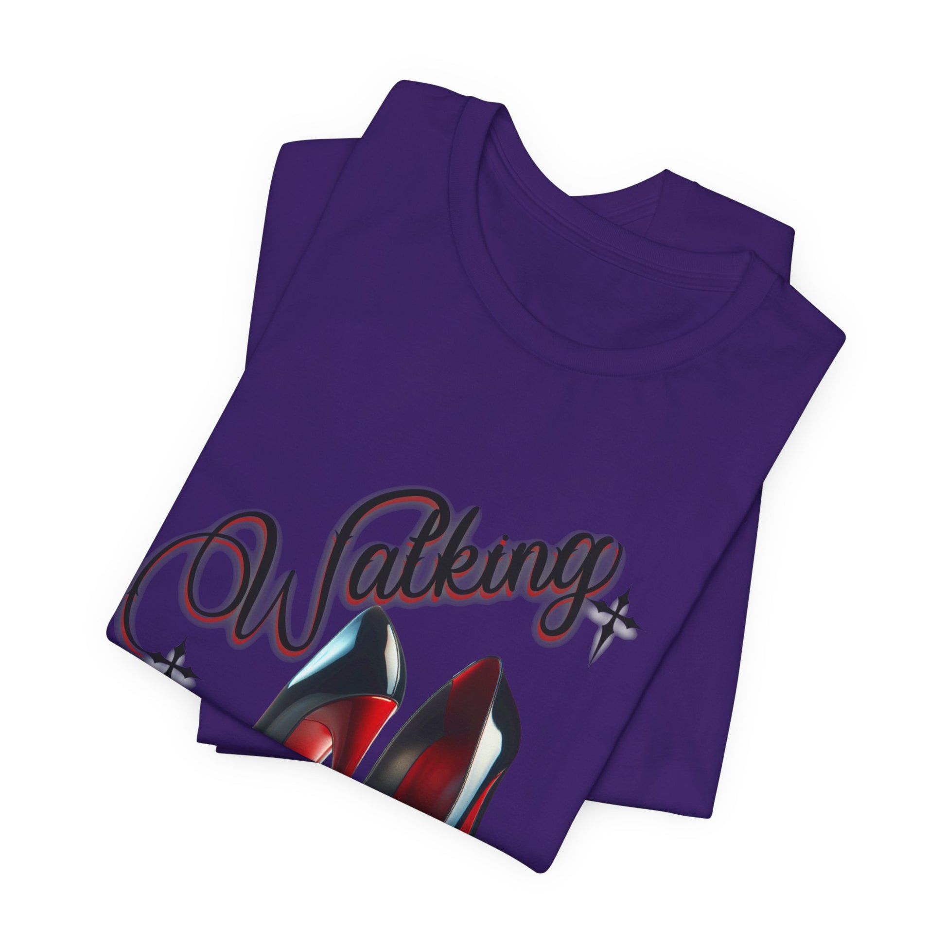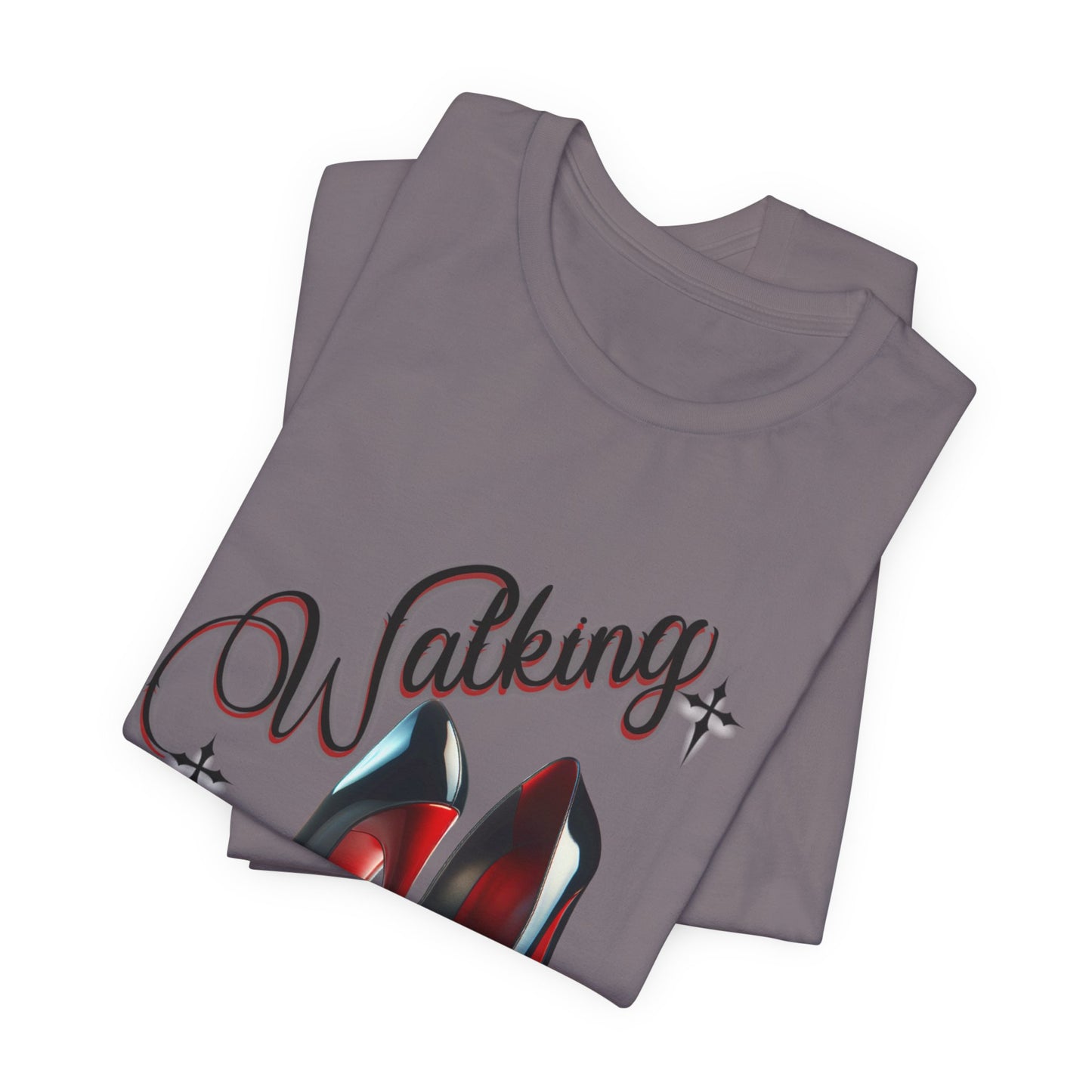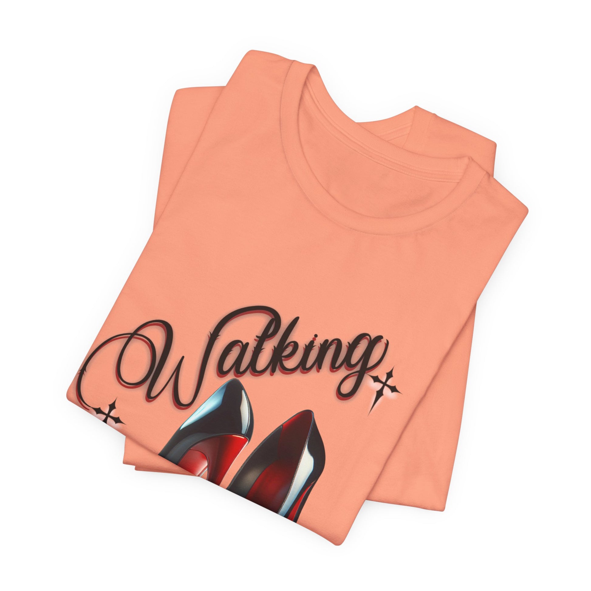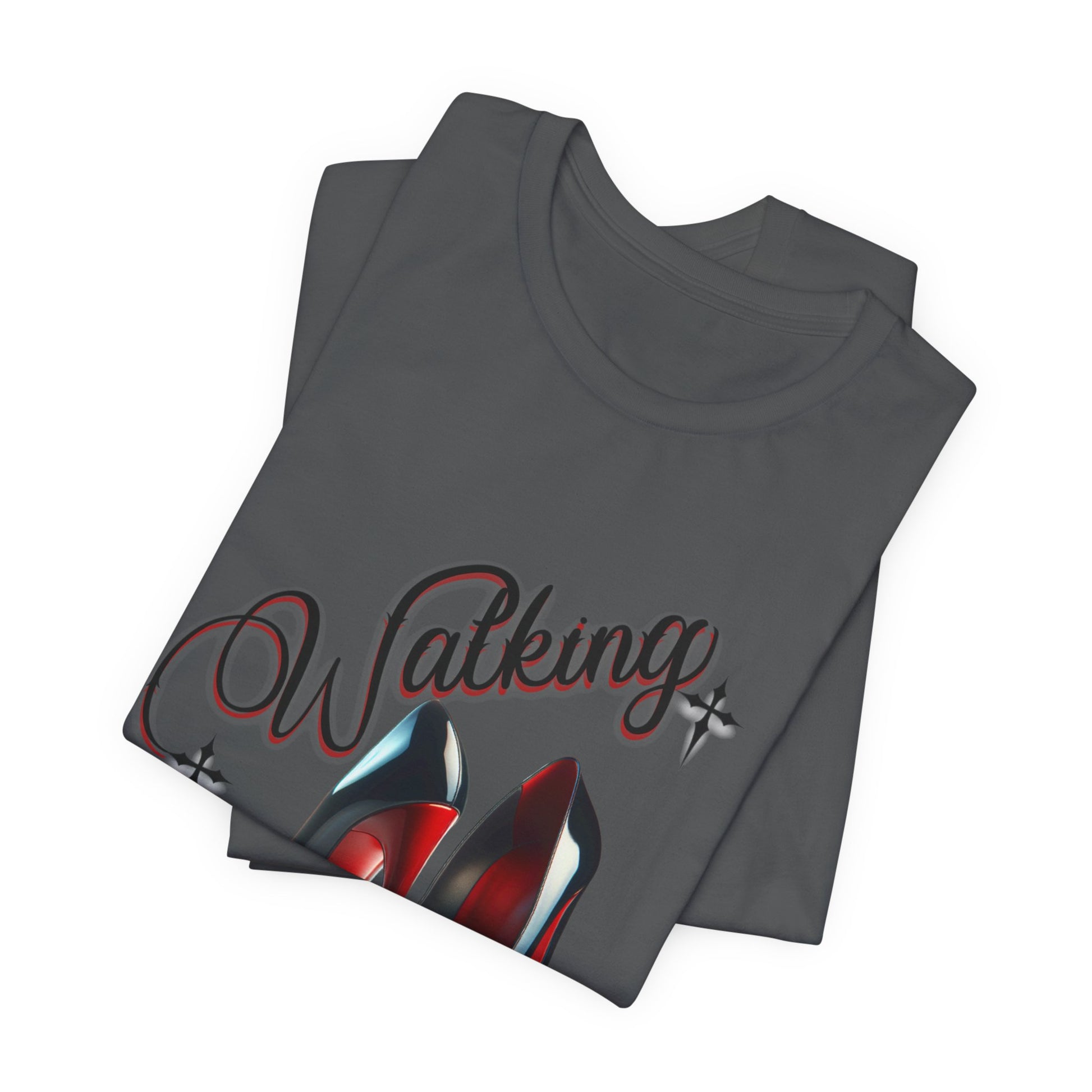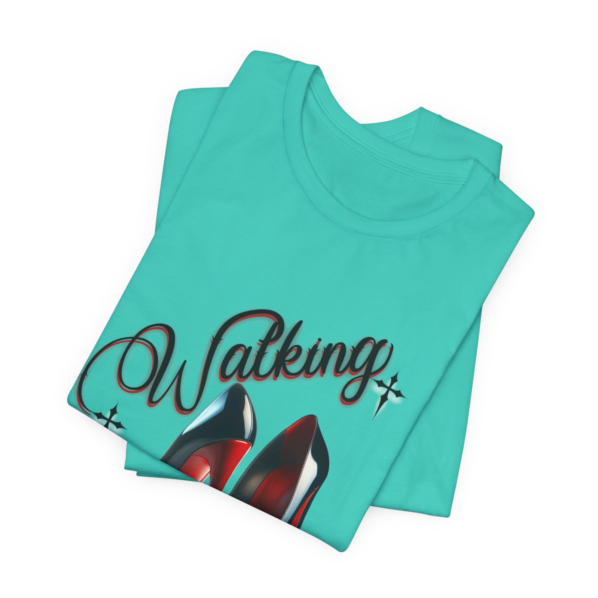 Walking by Faith Graphic Tee, Inspirational Unisex Jersey Short Sleeve T-Shirt, Faithful Footsteps in Red Bottom Shoes, Louboutin Shoe Graphic Religious Tee
