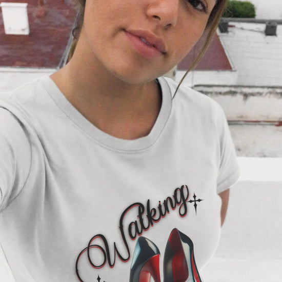 This design elegantly merges the worlds of fashion and spirituality with a touch of modern flair. The focal point is a pair of striking high-heeled Louboutin shoes, rendered in a glossy black and red, conveying both style and a hint of boldness. The phrase "Walking by Faith" is presented in a dynamic, hand-drawn script for "Walking" and a bold, classic font for "Faith," emphasizing the balance between personal expression and steadfast belief. The addition of decorative crosses adds a subtle yet powerful religious undertone. This piece is perfect for those who want to showcase their faith without sacrificing their sense of style.