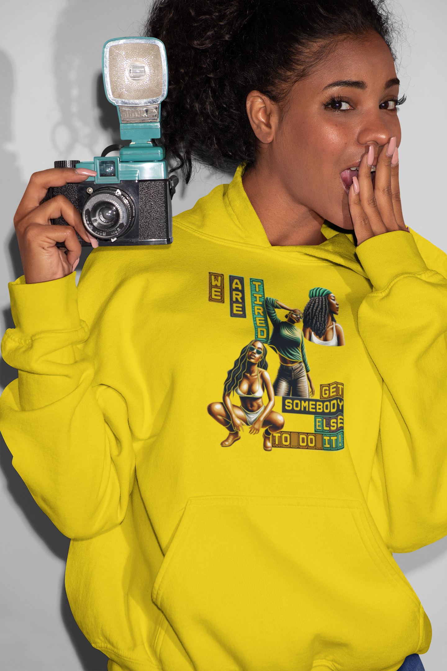 This unisex heavy blend hooded sweatshirt is relaxation itself. With an image of the plight and the struggle the black women face standing up for everything and everybody to fight injustice, "We are tired, get somebody else to do it." Made with a thick blend of cotton and polyester, it feels plush, soft and warm, a perfect choice for any cold day. In the front, the spacious kangaroo pocket adds daily practicality while the hood's drawstring is the same color as the base sweater for extra style points.