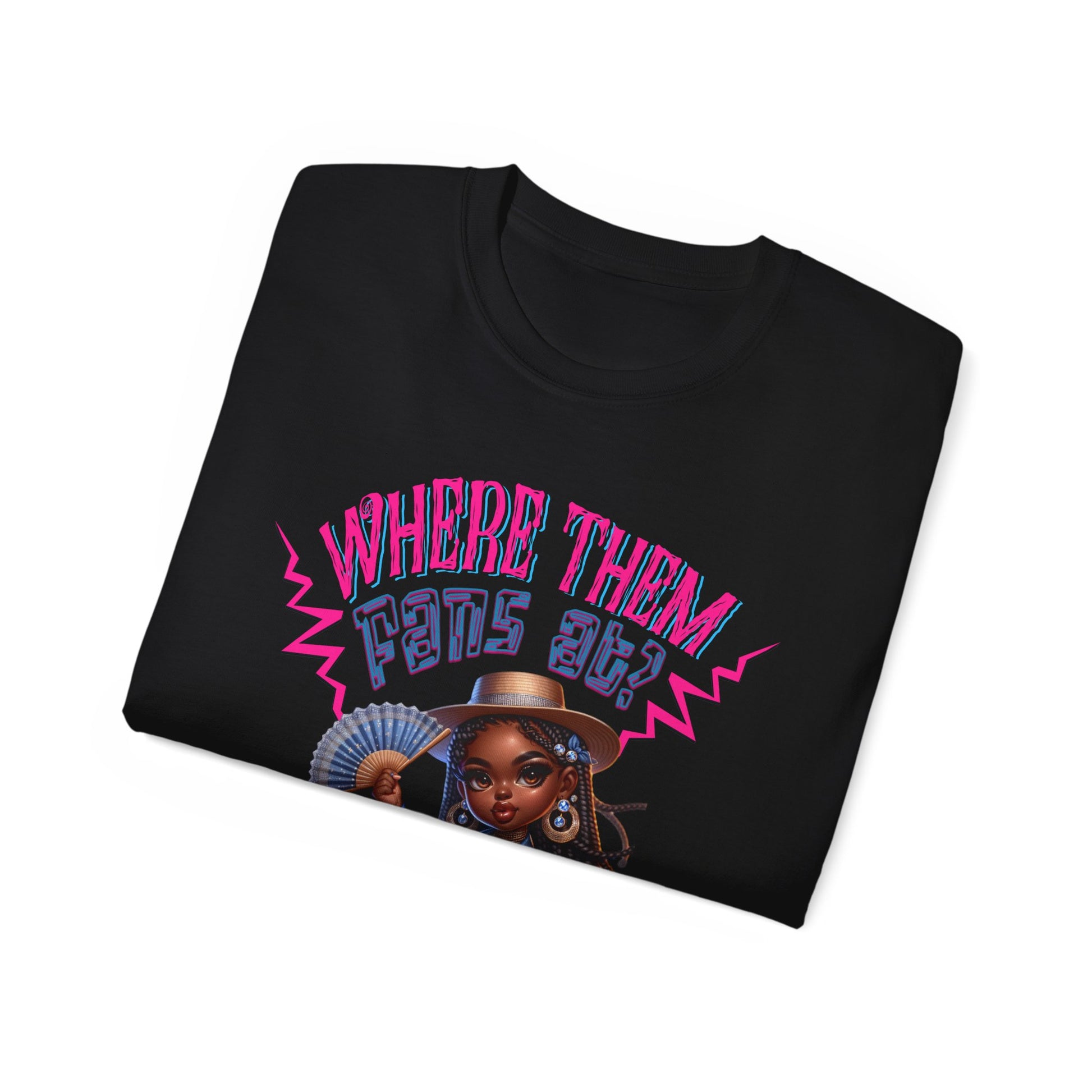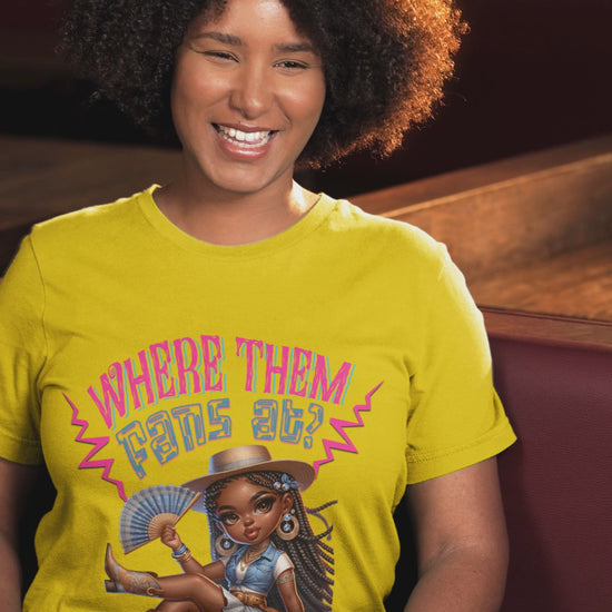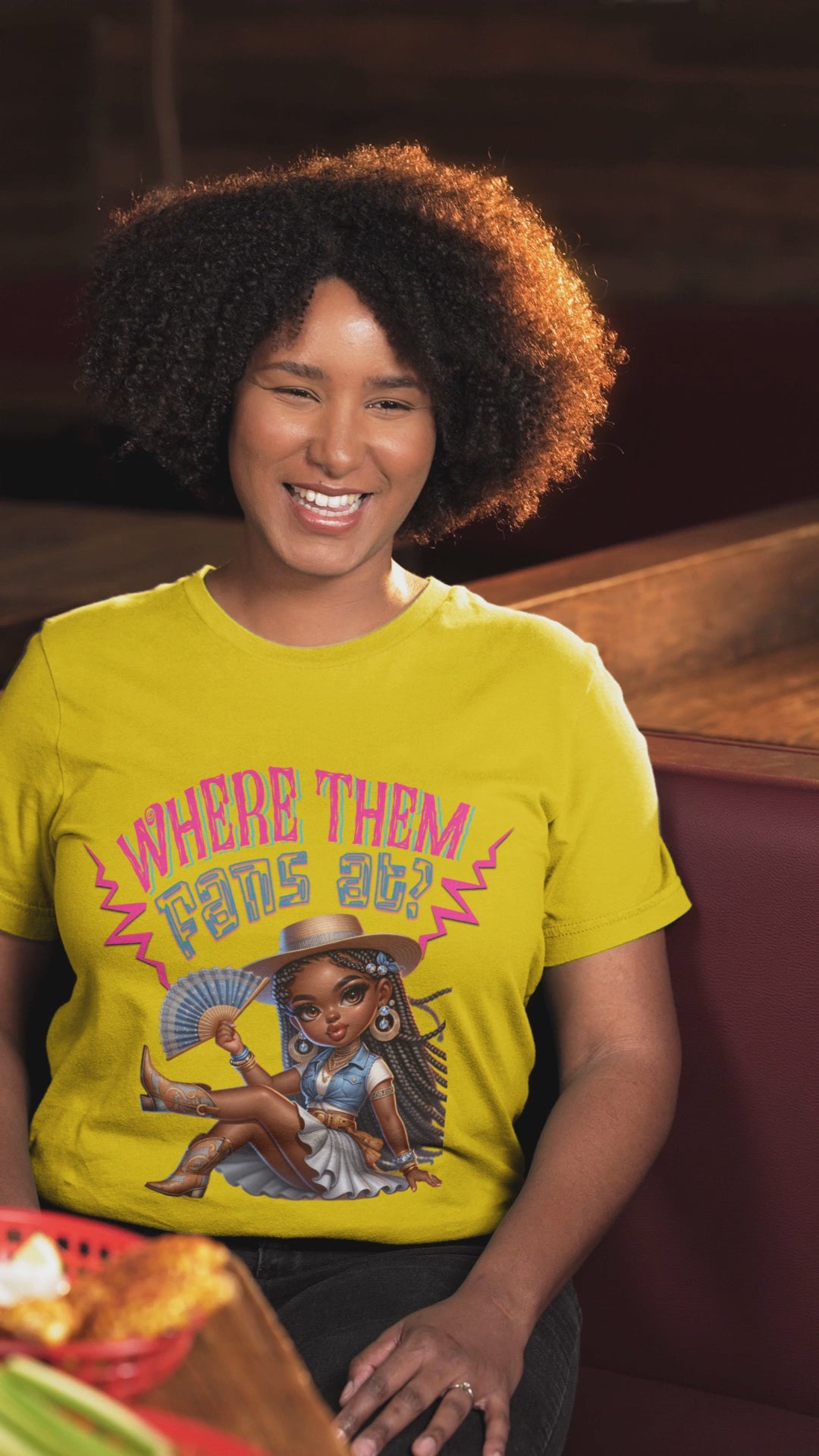 Get ready to groove with this vibrant design inspired by the infectious "Boots on the Ground" song and dance craze! This energetic image features a beautiful black lady with brightly colored cowboy boots, fan and hat adorned with cute colorful braids. The text "Where them fans at?" playfully curves above the design, capturing the excitement and spirit of the popular trend. This eye-catching artwork perfectly blends the country Western vibe with a touch of flair, embodying the fun and freedom of the dance floor. It's the perfect way to show your love for the "Boots on the Ground" phenomenon and your readiness to move!